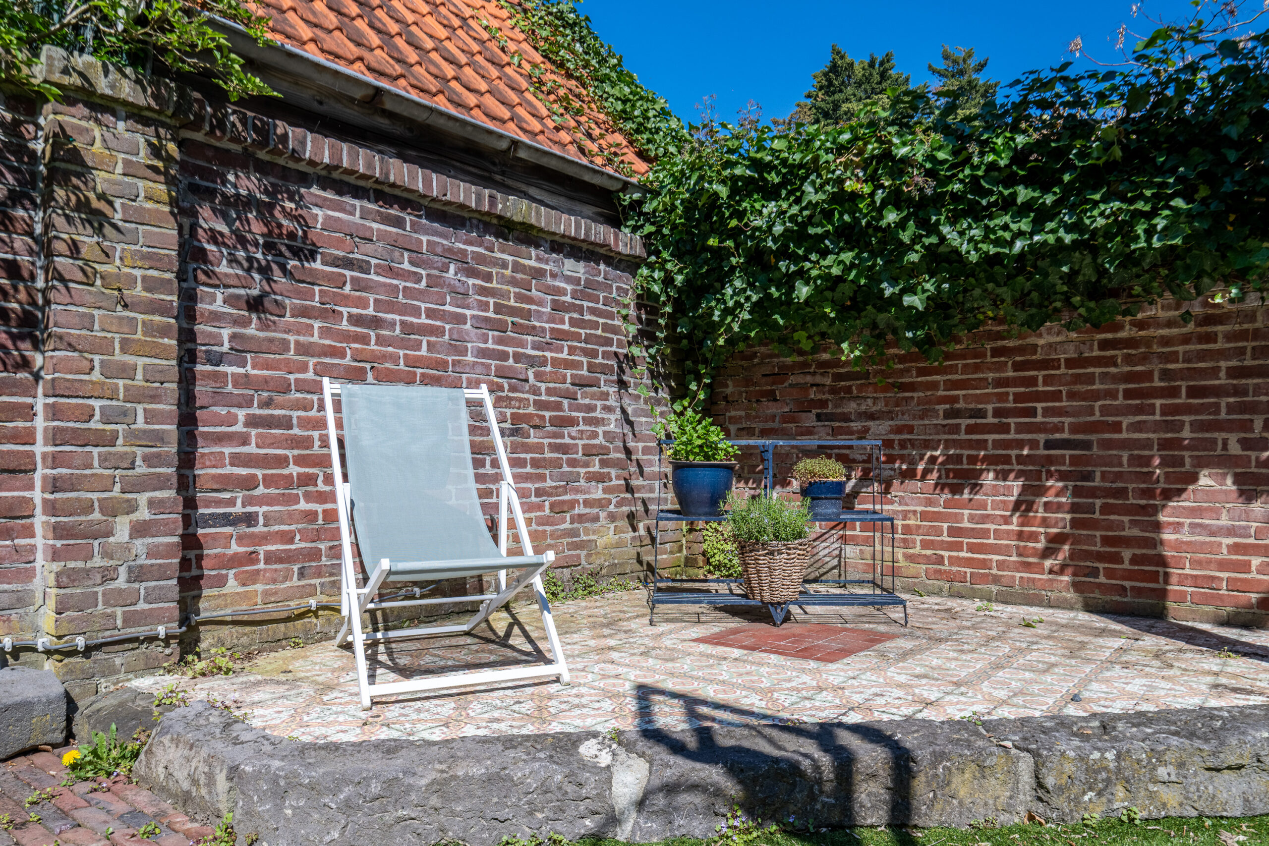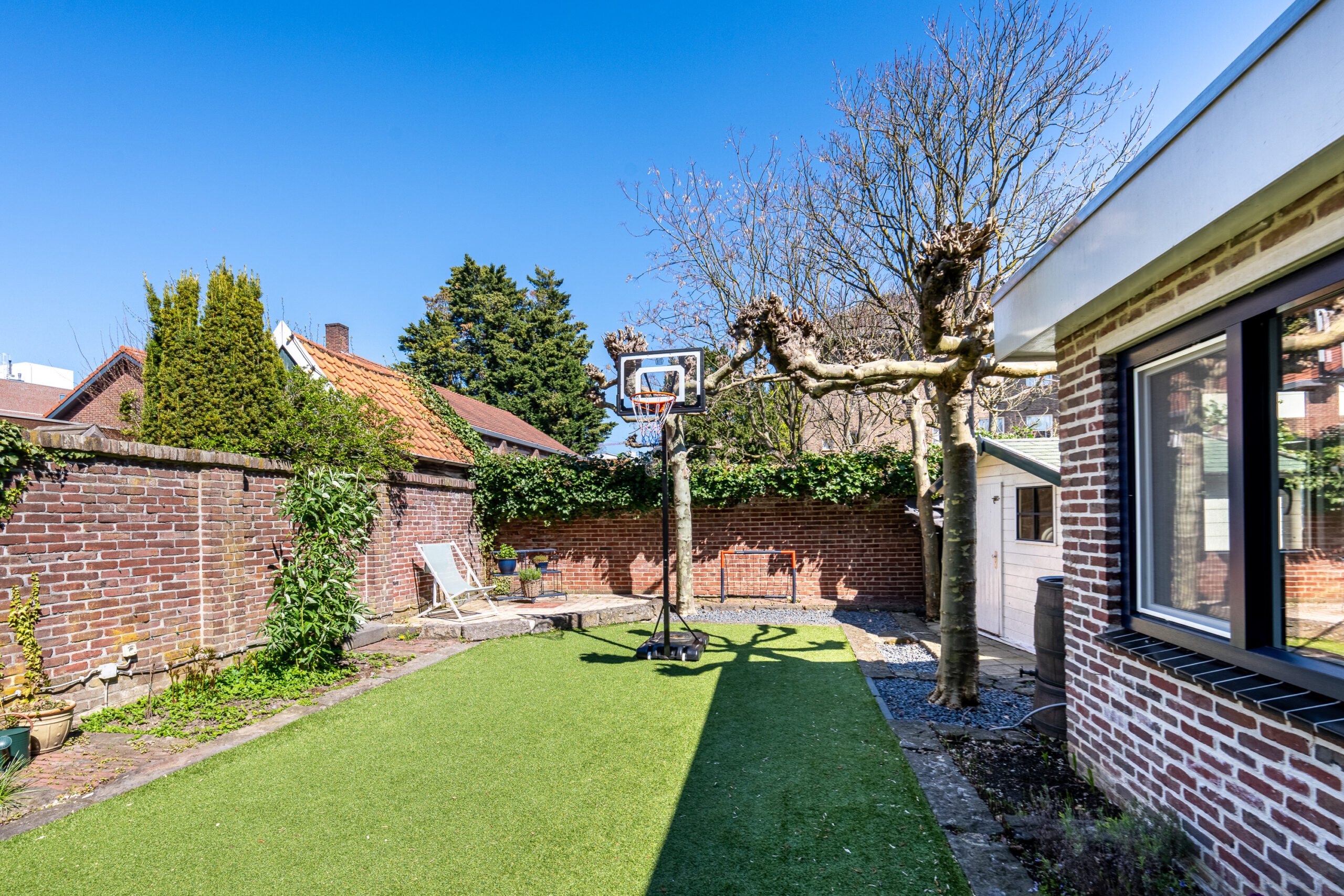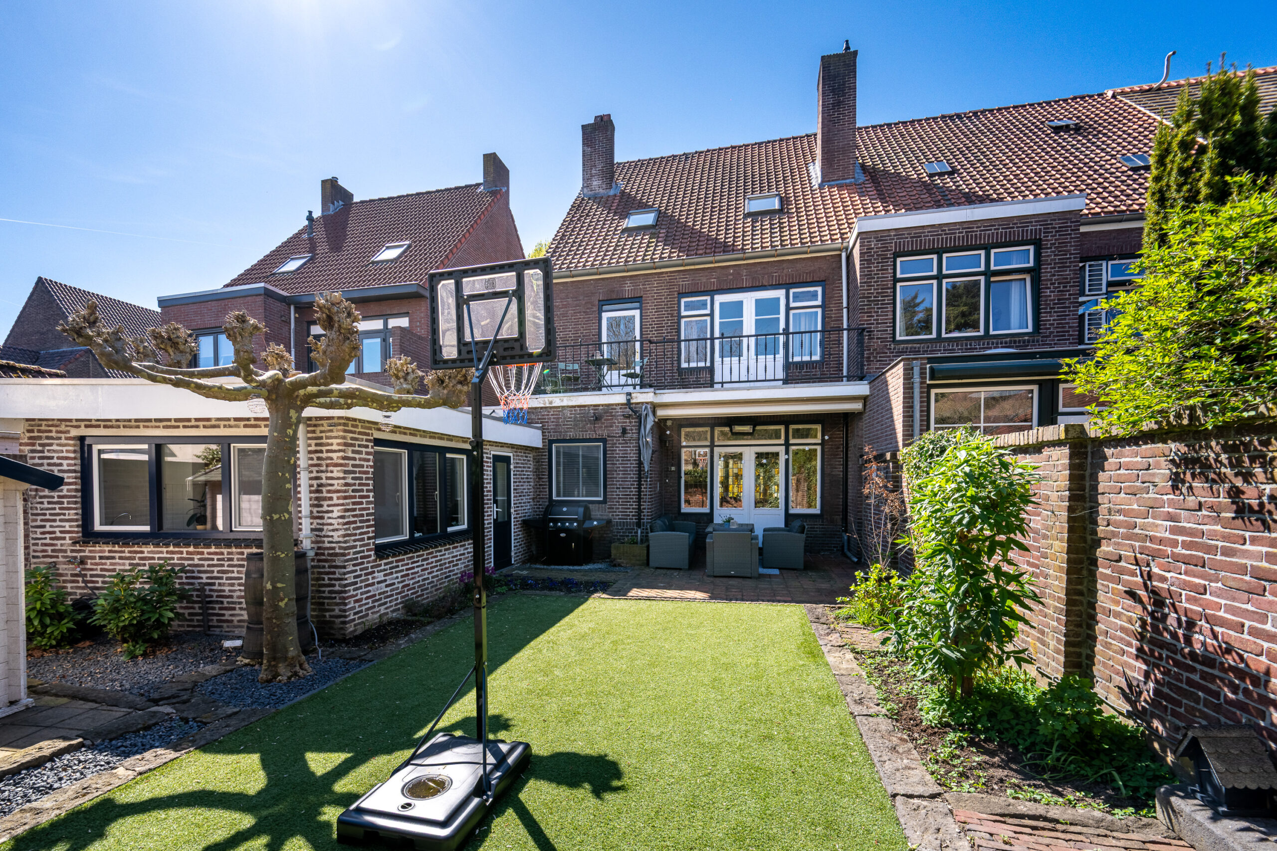 Middels de authentieke openslaande deuren met glas-in-lood elementen betreedt men de fraaie achtertuin vanuit de woonkamer. Tevens is er een toegangsmogelijkheid via de hobby/kantoorruimte. Direct grenzend aan de woning ligt een deels (door het balkon) overdekt terras met elektrisch bedienbaar zonnescherm gevolgd door een kunstgrasstrook. Verder zijn er diverse platanen, een extra zonneterras, een houten tuinhuis van ca. 6 m2 en diverse struiken/aanplant voor een groen karakter. De tuin is volledig ommuurd en biedt daarmee veel privacy en veiligheid.