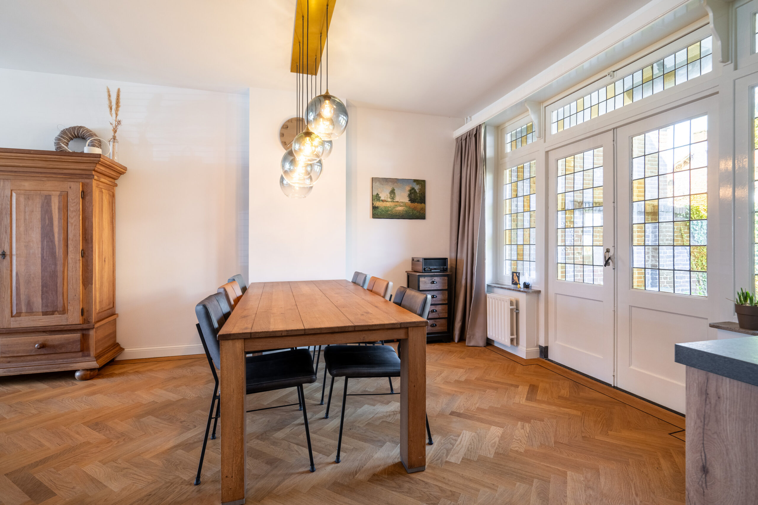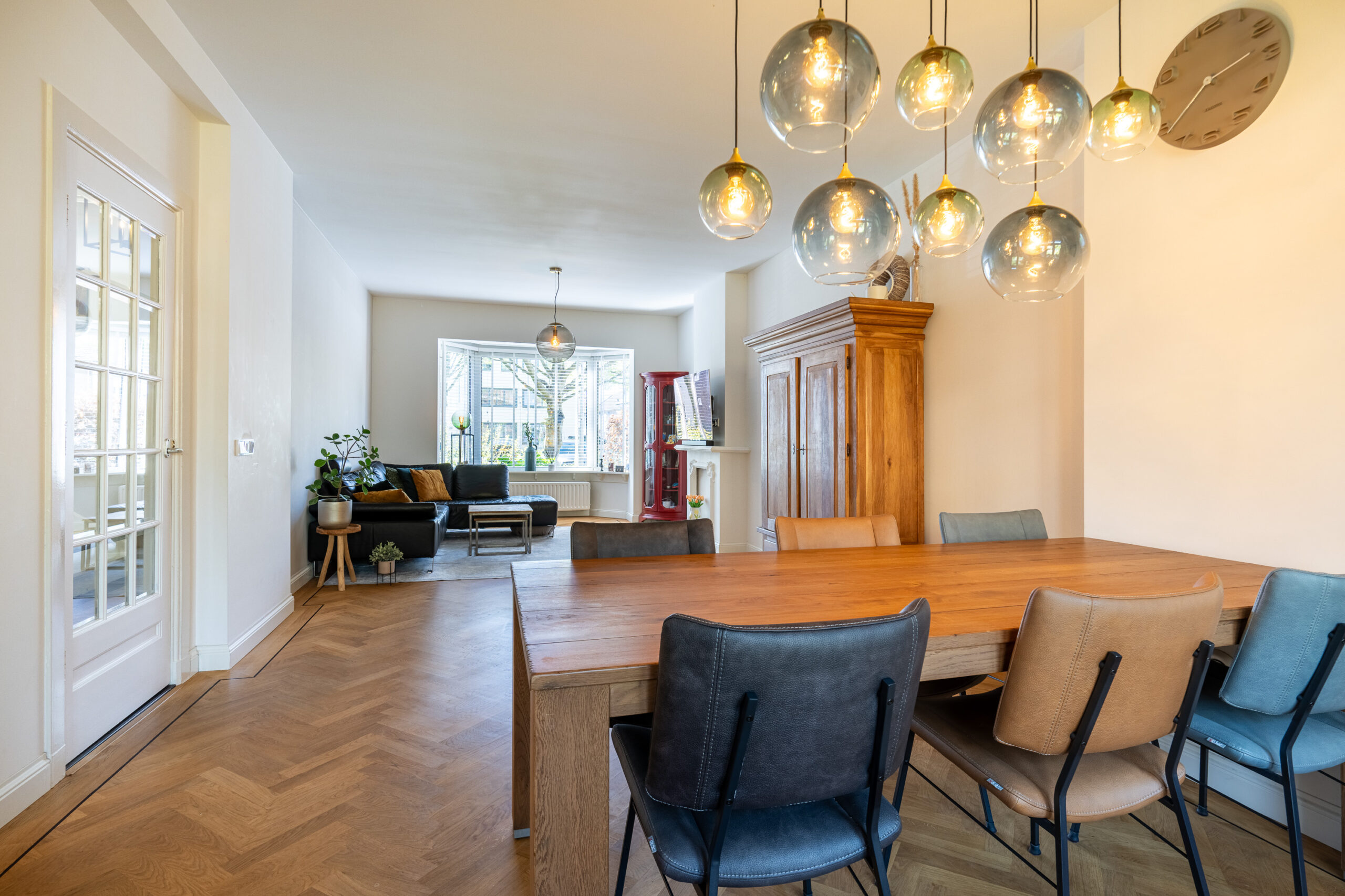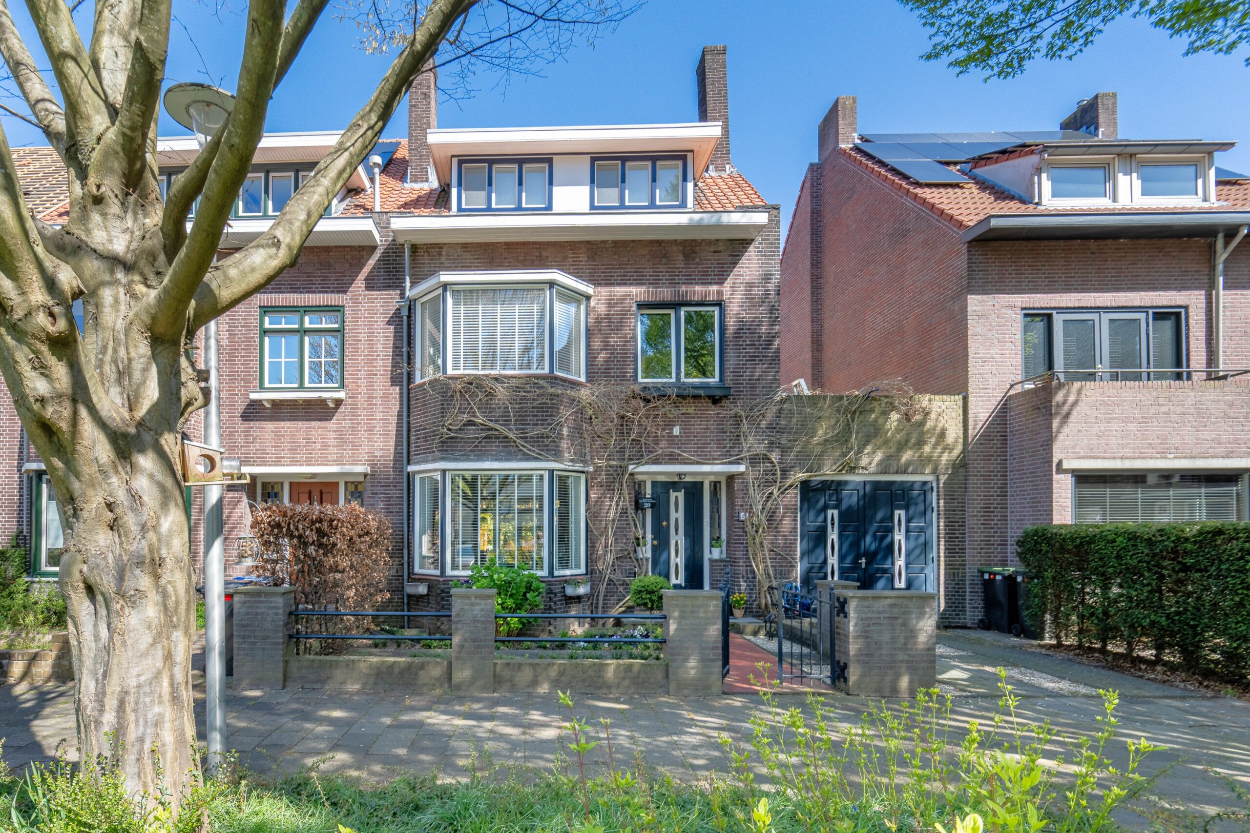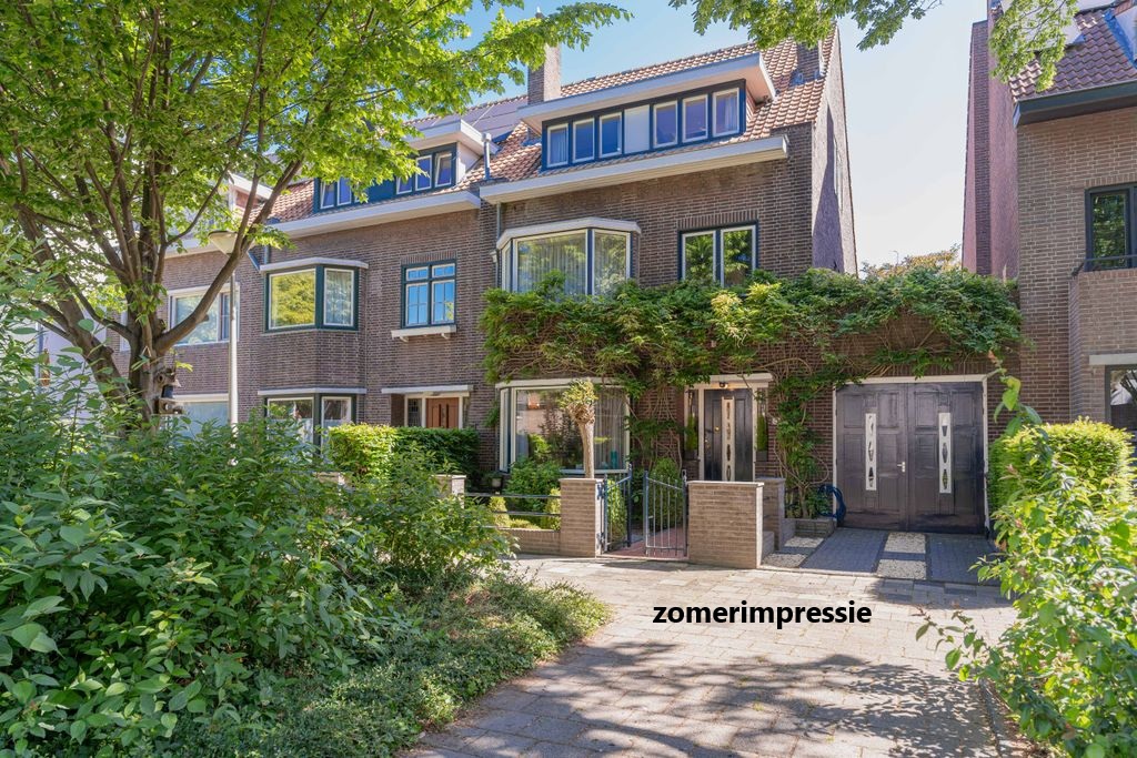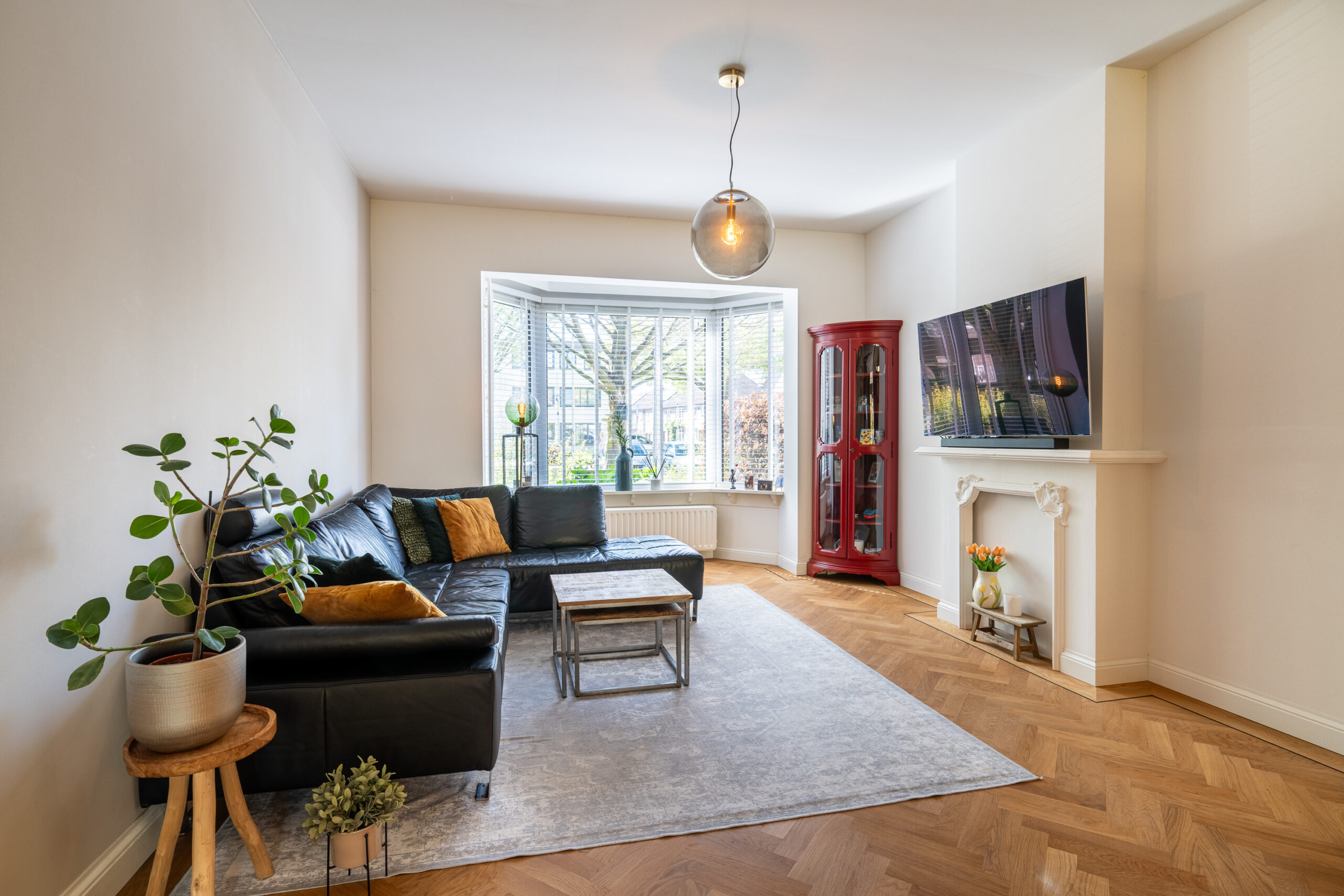 Het pand ligt wat terug t.o.v. het verkeer en is middels een fijn plantsoen gescheiden van de parkeervoorzieningen in de straat. De eigen inrit en oprit zorgen naast de mogelijke parkeervergunning ervoor dat er altijd plek is recht voor de deur om te parkeren. De voorzijde van de woning heeft een formele tuin die in 30-er jaren stijl is gerestaureerd met gemetselde kolommen en een smeedijzeren hek. De tweedelige houten garagepoort en voordeur zijn eveneens in authentieke Deco-stijl, nagemaakt aan de hand van de originele bouwtekeningen. De woning is over de gehele breedte begroeid met blauwe regen hetgeen een fraaie uitstraling geeft. Men betreedt de woning via de vestibule met authentieke tegelvloer, glas-in-lood elementen en taatsdeur naar de hal. De centrale hal biedt toegang tot de woonkamer, de gemoderniseerde toiletruimte (2024) met hangcloset en fontein, kelder en trapopgang naar de verdieping. De royale doorzonwoonkamer (ca. 39 m2) is in 2024 gemoderniseerd met een fraaie visgraat parketvloer, strak stucwerk, originele schouwpartij, erker aan de voorzijde en openslaande deuren met glas-in-lood elementen naar de achtertuin. De open keuken (ca. 11 m2) is eveneens in 2024 geheel gemoderniseerd met landelijke tegelvloer met vloerverwarming, glad stucwerk, inbouwspots, airco unit 1 en luxe keukenopstelling met wandopstelling en eiland v.v. inductiekookplaat met inbouw afzuiging, vaatwasser, oven, combi-oven, quooker kraan, koelkast en diepvries. Vanuit de keuken is er een doorloop naar de ca. 23 jaar geleden gerealiseerde hobby/werkkamer van ca. 32 m2 met veel lichtinval (middels ramen en lichtkoepel), gootsteen, karakteristieke tegelvloer, witgoedaansluitingen en opstelling Nefit ecomline combiketel (eigendom, ca. 2003). Vanuit de hobbyruimte is de garage (ca. 14 m2) toegankelijk met omvormer PV, vernieuwde meterkast en openslaande garagedeuren naar de oprit. Atelier en garage samen zijn ca. 46 m2 en bieden diverse mogelijkheden voor opslag, werkruimte, maar ook mogelijk een praktijk aan huis met eigen ingang.