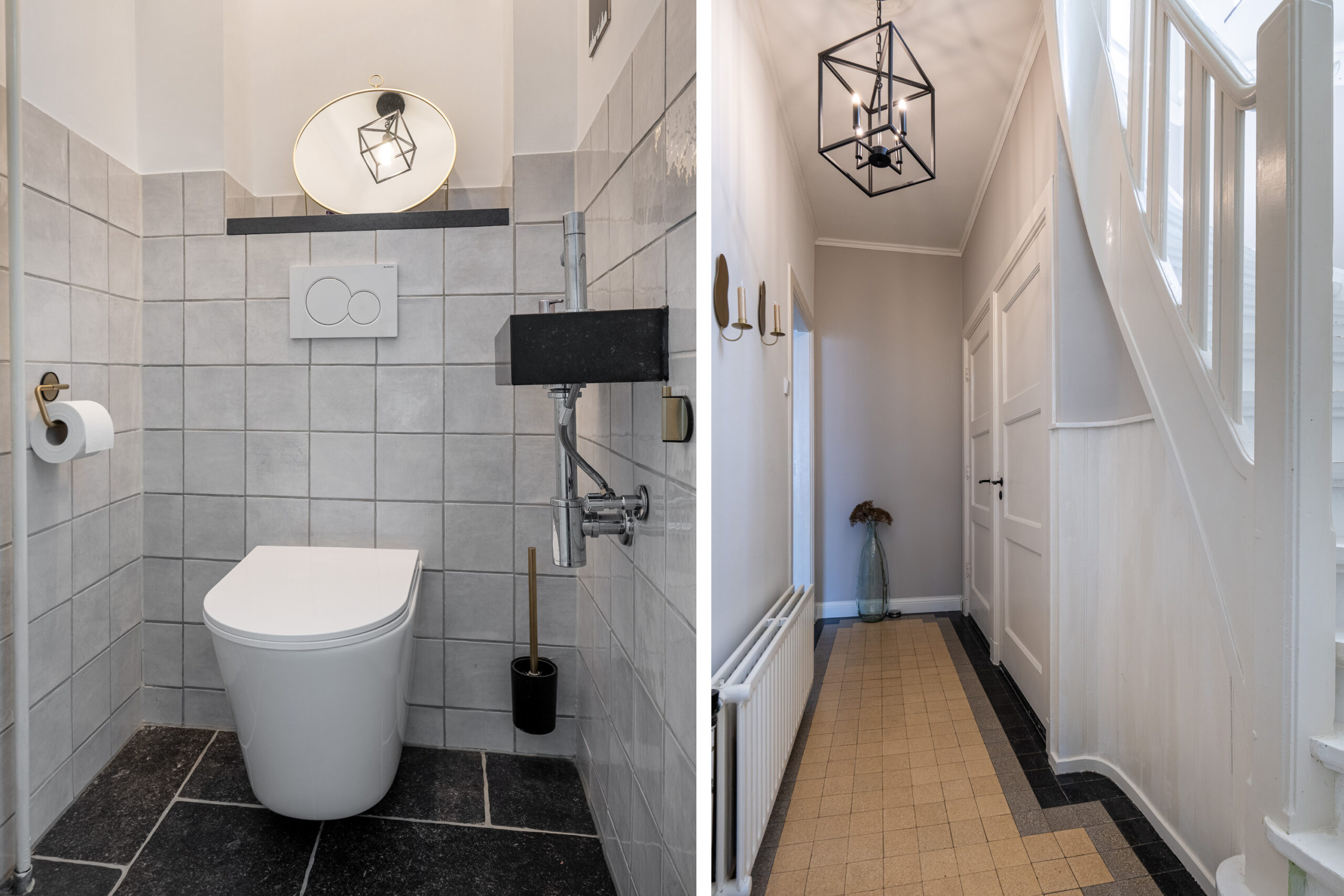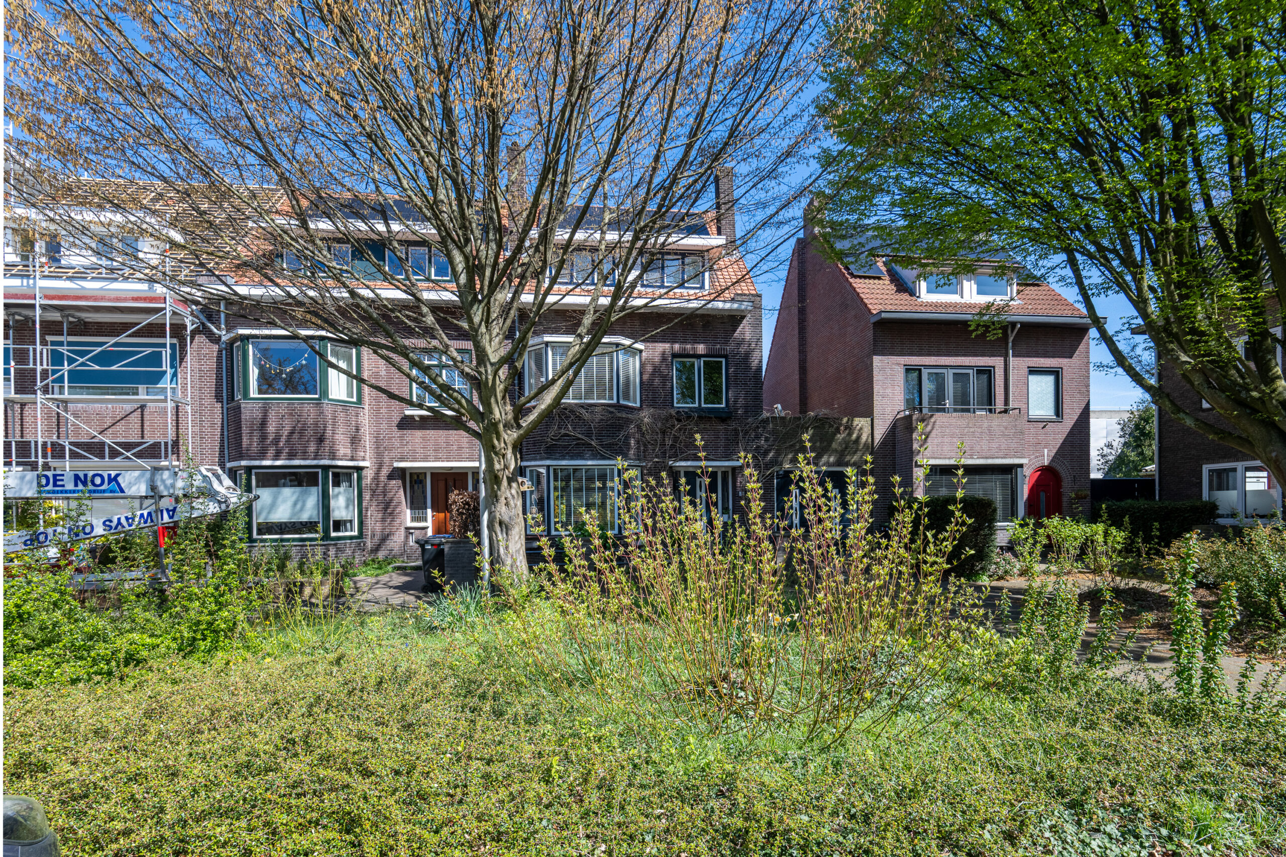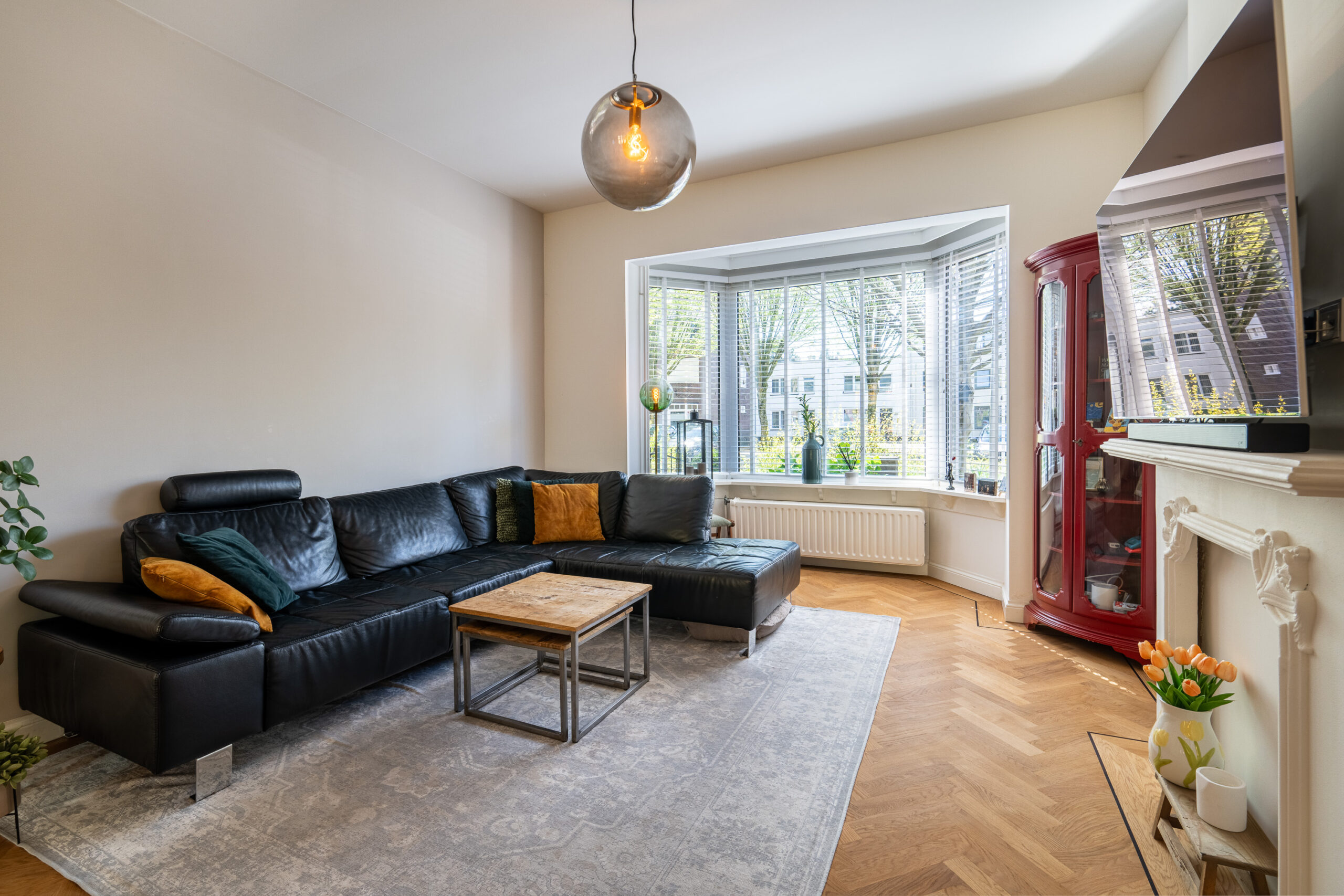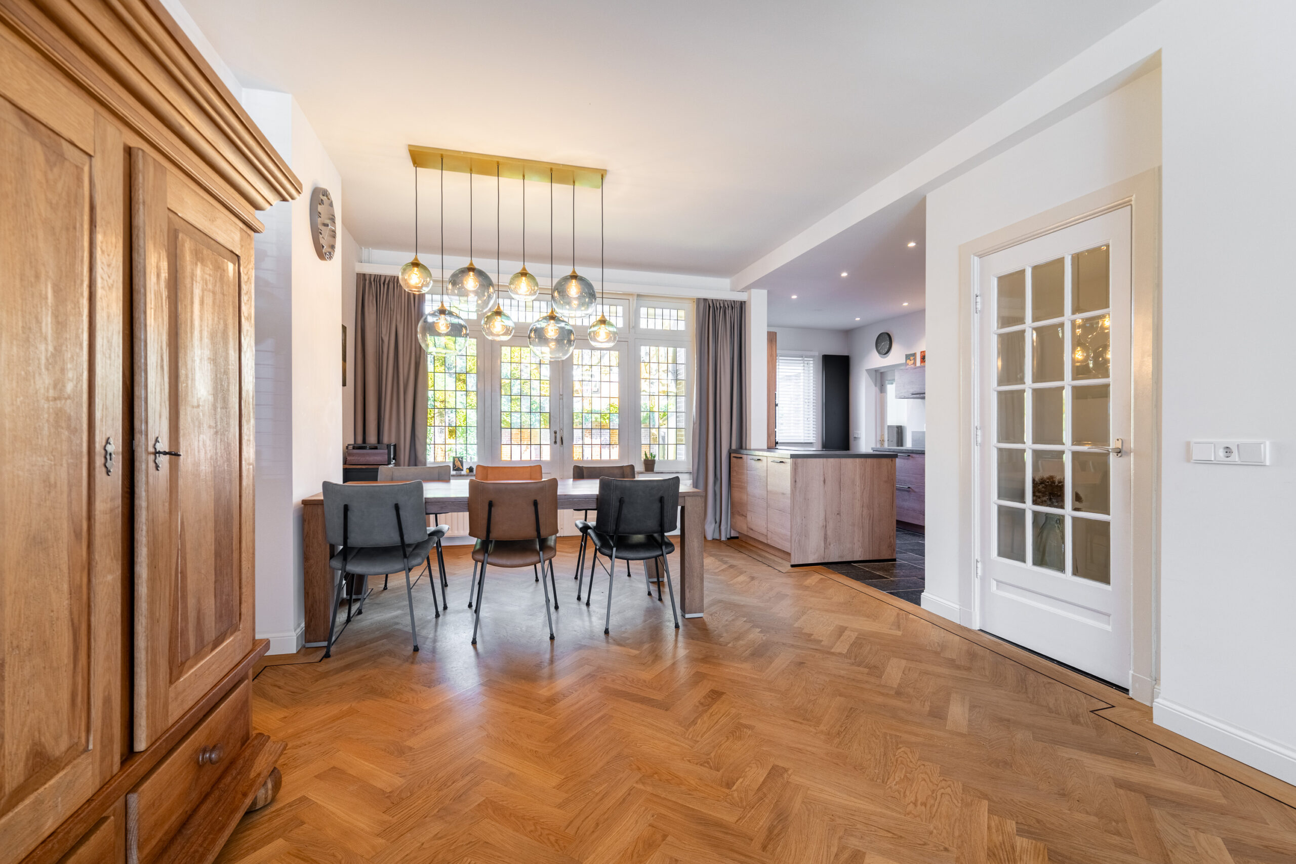 Het pand ligt wat terug t.o.v. het verkeer en is middels een fijn plantsoen gescheiden van de parkeervoorzieningen in de straat. De eigen inrit en oprit zorgen naast de mogelijke parkeervergunning ervoor dat er altijd plek is recht voor de deur om te parkeren. De voorzijde van de woning heeft een formele tuin die in 30-er jaren stijl is gerestaureerd met gemetselde kolommen en een smeedijzeren hek. De tweedelige houten garagepoort en voordeur zijn eveneens in authentieke Deco-stijl, nagemaakt aan de hand van de originele bouwtekeningen. De woning is over de gehele breedte begroeid met blauwe regen hetgeen een fraaie uitstraling geeft. Men betreedt de woning via de vestibule met authentieke tegelvloer, glas-in-lood elementen en taatsdeur naar de hal. De centrale hal biedt toegang tot de woonkamer, de gemoderniseerde toiletruimte (2024) met hangcloset en fontein, kelder en trapopgang naar de verdieping. De royale doorzonwoonkamer (ca. 39 m2) is in 2024 gemoderniseerd met een fraaie visgraat parketvloer, strak stucwerk, originele schouwpartij, erker aan de voorzijde en openslaande deuren met glas-in-lood elementen naar de achtertuin. De open keuken (ca. 11 m2) is eveneens in 2024 geheel gemoderniseerd met landelijke tegelvloer met vloerverwarming, glad stucwerk, inbouwspots, airco unit 1 en luxe keukenopstelling met wandopstelling en eiland v.v. inductiekookplaat met inbouw afzuiging, vaatwasser, oven, combi-oven, quooker kraan, koelkast en diepvries. Vanuit de keuken is er een doorloop naar de ca. 23 jaar geleden gerealiseerde hobby/werkkamer van ca. 32 m2 met veel lichtinval (middels ramen en lichtkoepel), gootsteen, karakteristieke tegelvloer, witgoedaansluitingen en opstelling Nefit ecomline combiketel (eigendom, ca. 2003). Vanuit de hobbyruimte is de garage (ca. 14 m2) toegankelijk met omvormer PV, vernieuwde meterkast en openslaande garagedeuren naar de oprit. Atelier en garage samen zijn ca. 46 m2 en bieden diverse mogelijkheden voor opslag, werkruimte, maar ook mogelijk een praktijk aan huis met eigen ingang.