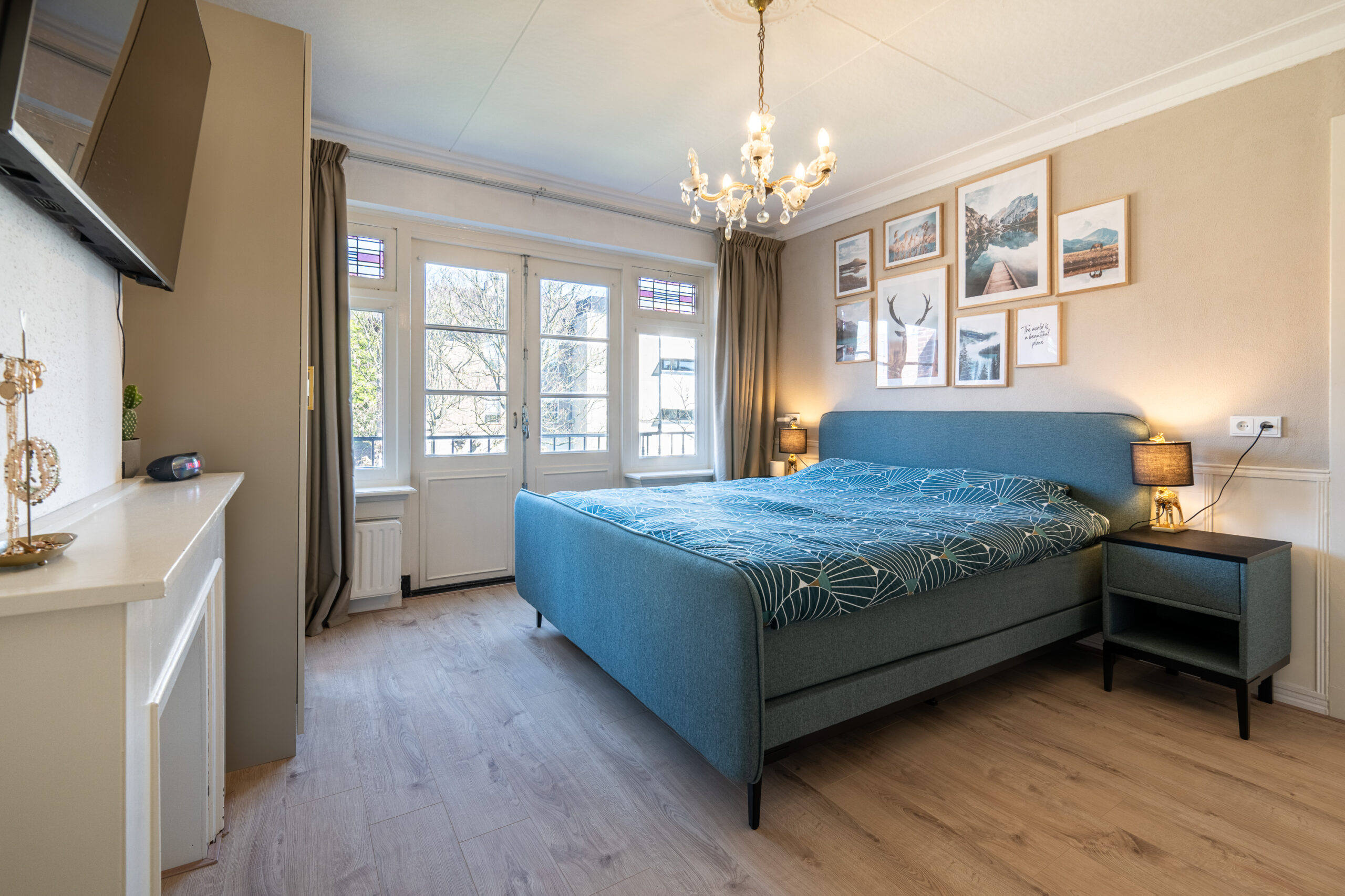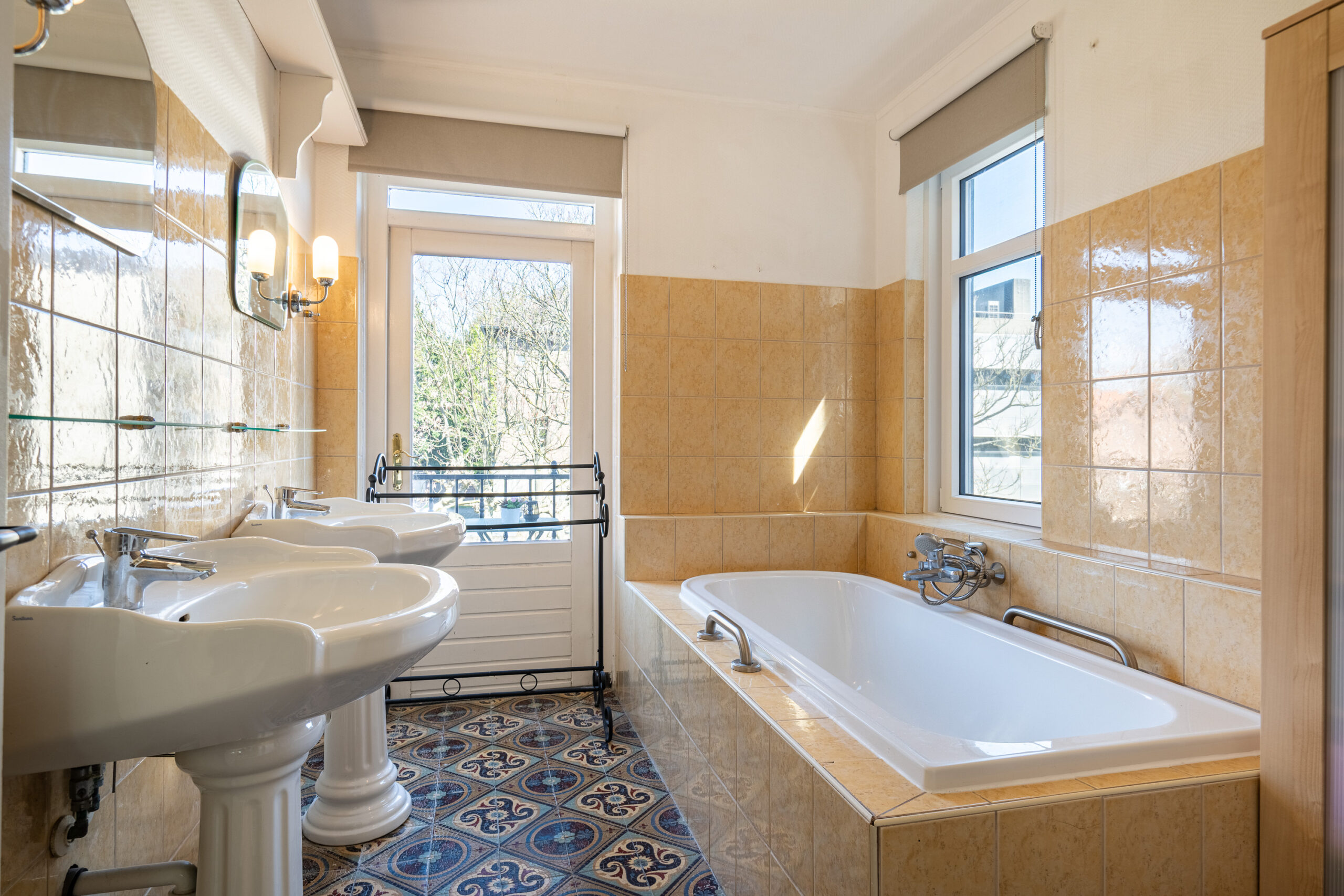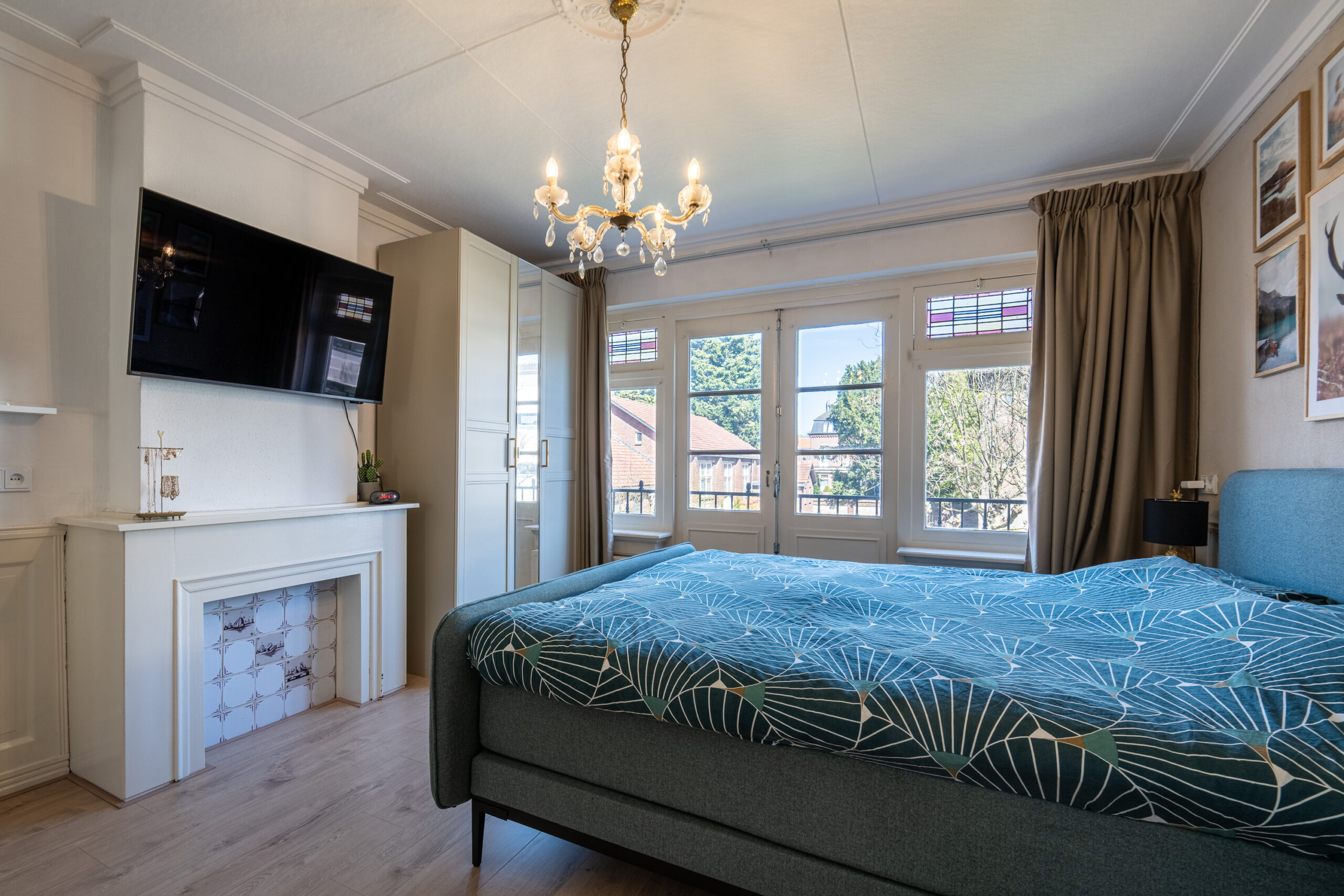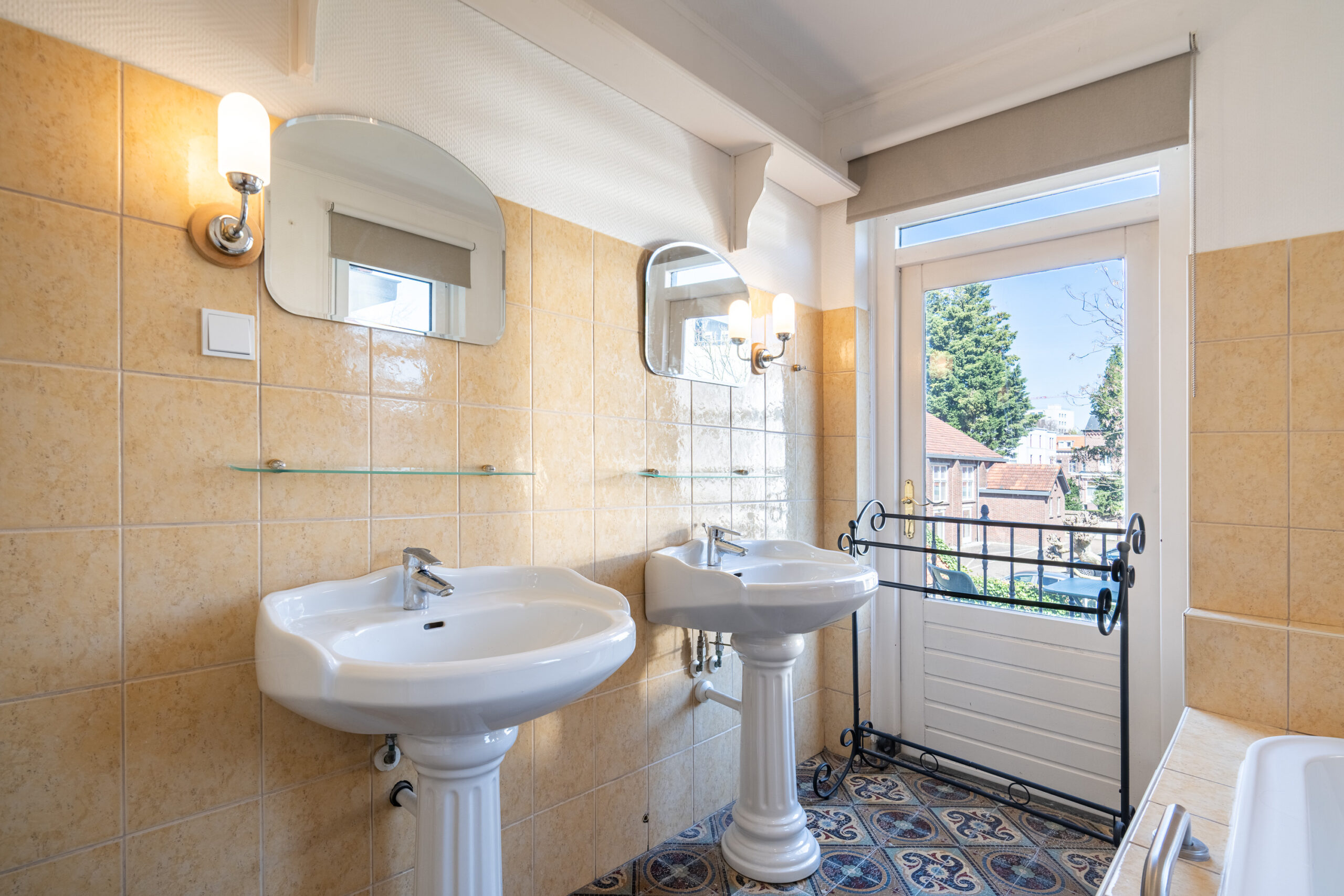 Middels statige trap toegang tot de overloop met airco unit 2 en in de zijgevel twee grote verticale en originele raampartijen met kleurrijke art deco glas-in-lood ramen. Vanuit de overloop is er toegang tot de separate toiletruimte. Aan de voorzijde badkamer 1 (ca. 6 m2) met douche en wastafel, aan de achterzijde badkamer 2 (ca. 7,5 m2) met ligbad, twee wastafels en karakteristiek tegelwerk. Aan de voorzijde ligt slaapkamer 1 (ca. 17 m2) met lichte laminaatvloer, schouwpartij en erker aan de voorzijde. Slaapkamer 2 (ca. 19 m2), eveneens met laminaatvloer en schouwpartij, ligt aan de achterzijde en biedt via openslaande deuren toegang tot het balkon (ca. 10 m2). Het brede balkon met smeedijzeren hek biedt een fraai zicht op de achtertuin.