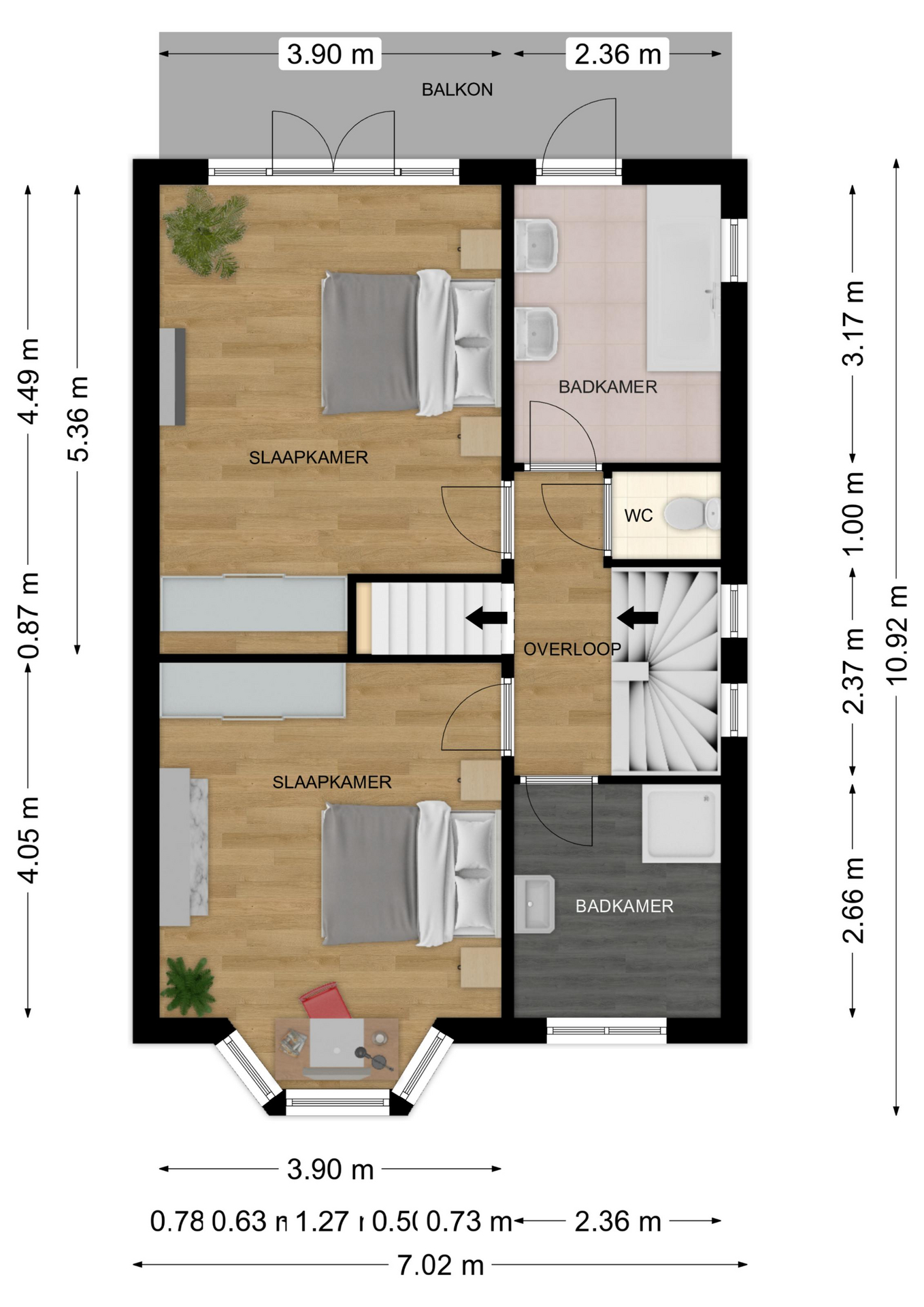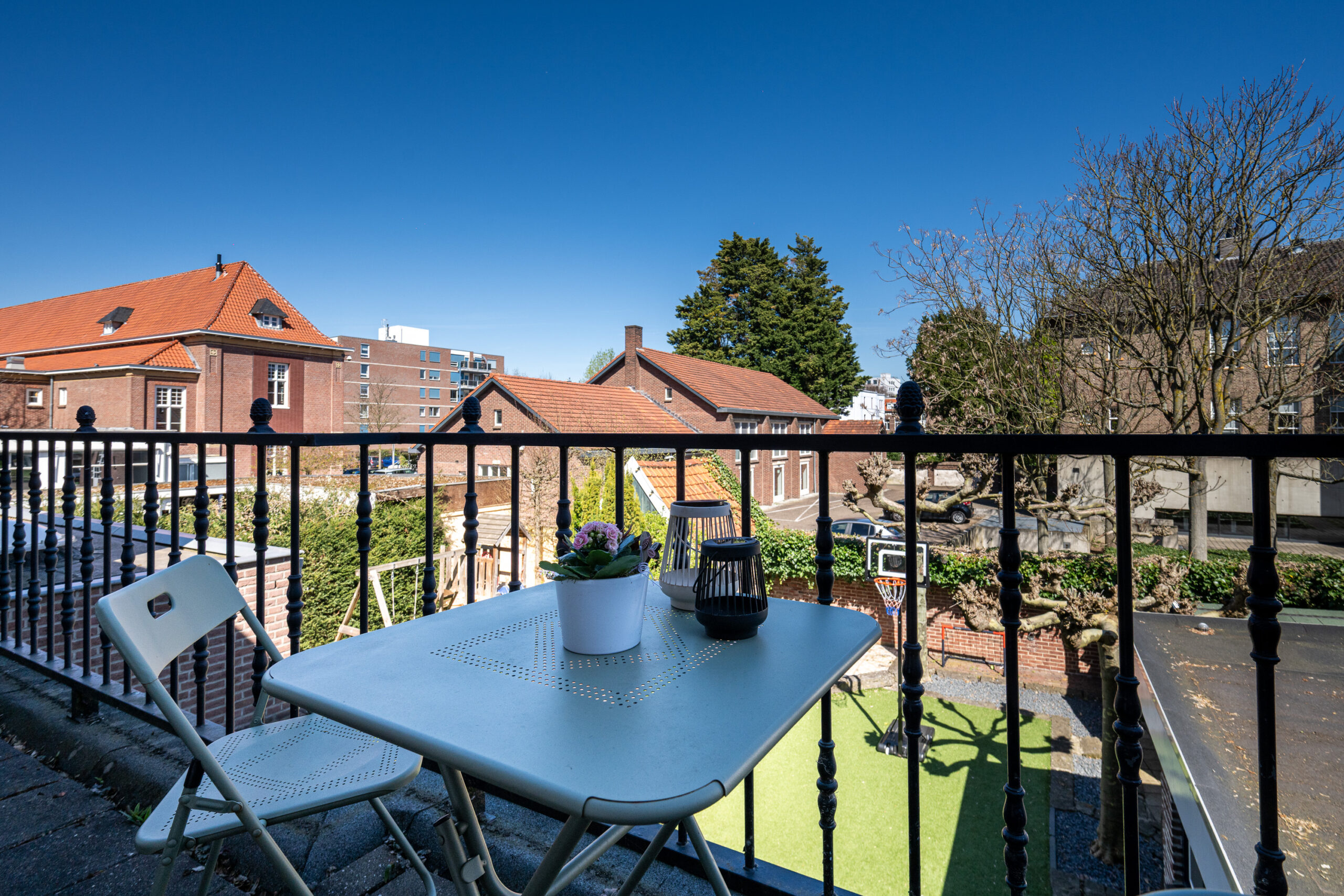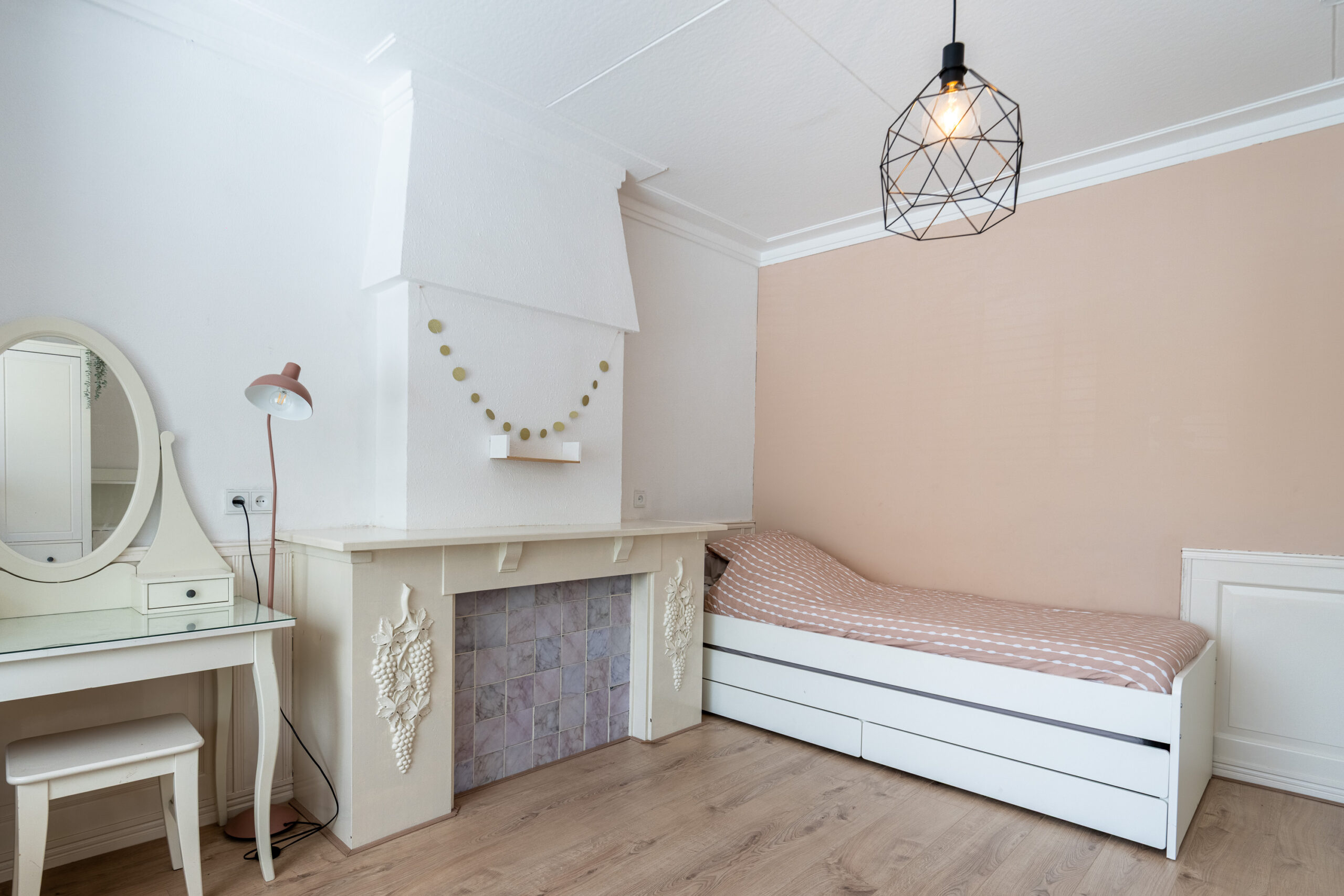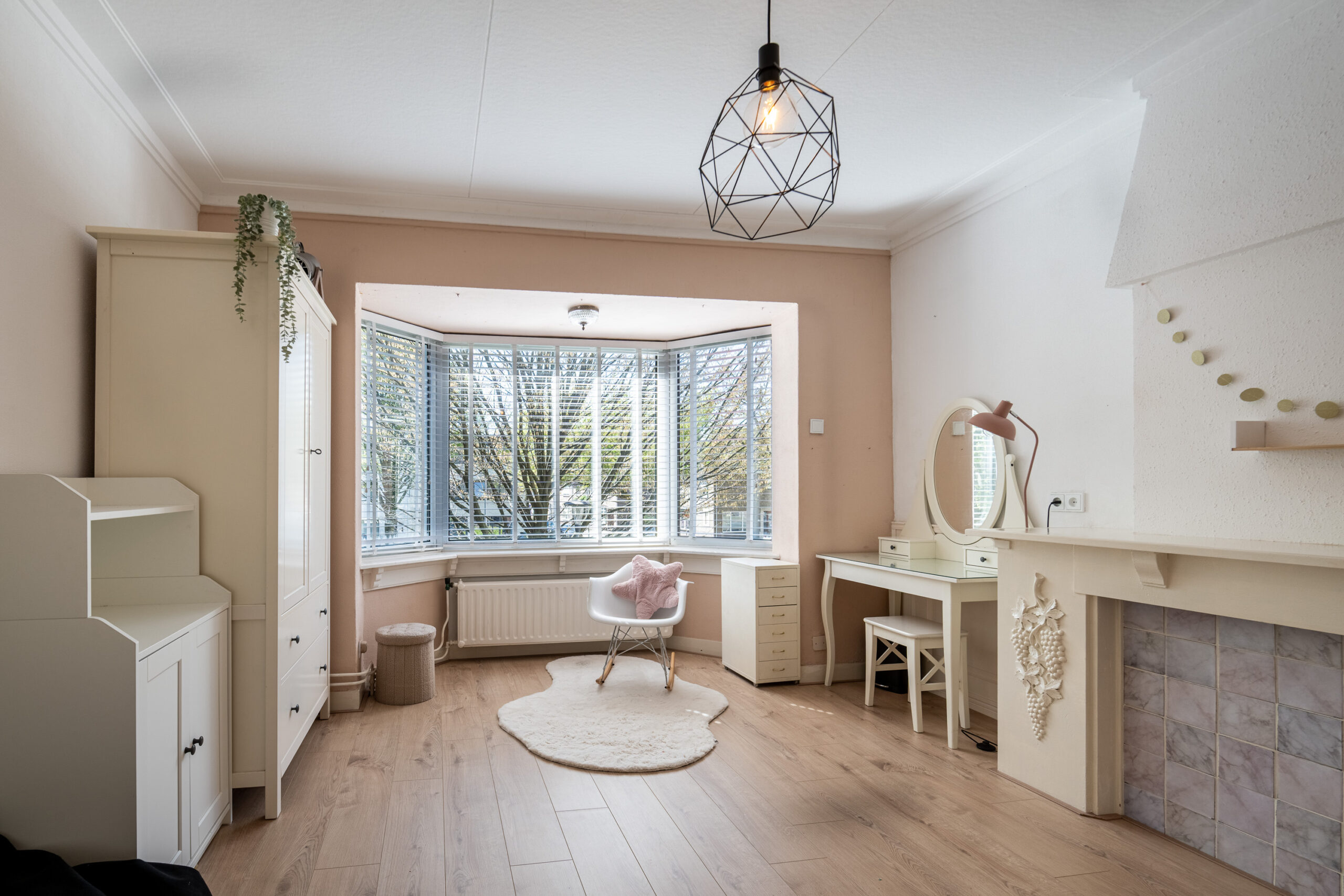 Middels statige trap toegang tot de overloop met airco unit 2 en in de zijgevel twee grote verticale en originele raampartijen met kleurrijke art deco glas-in-lood ramen. Vanuit de overloop is er toegang tot de separate toiletruimte. Aan de voorzijde badkamer 1 (ca. 6 m2) met douche en wastafel, aan de achterzijde badkamer 2 (ca. 7,5 m2) met ligbad, twee wastafels en karakteristiek tegelwerk. Aan de voorzijde ligt slaapkamer 1 (ca. 17 m2) met lichte laminaatvloer, schouwpartij en erker aan de voorzijde. Slaapkamer 2 (ca. 19 m2), eveneens met laminaatvloer en schouwpartij, ligt aan de achterzijde en biedt via openslaande deuren toegang tot het balkon (ca. 10 m2). Het brede balkon met smeedijzeren hek biedt een fraai zicht op de achtertuin.