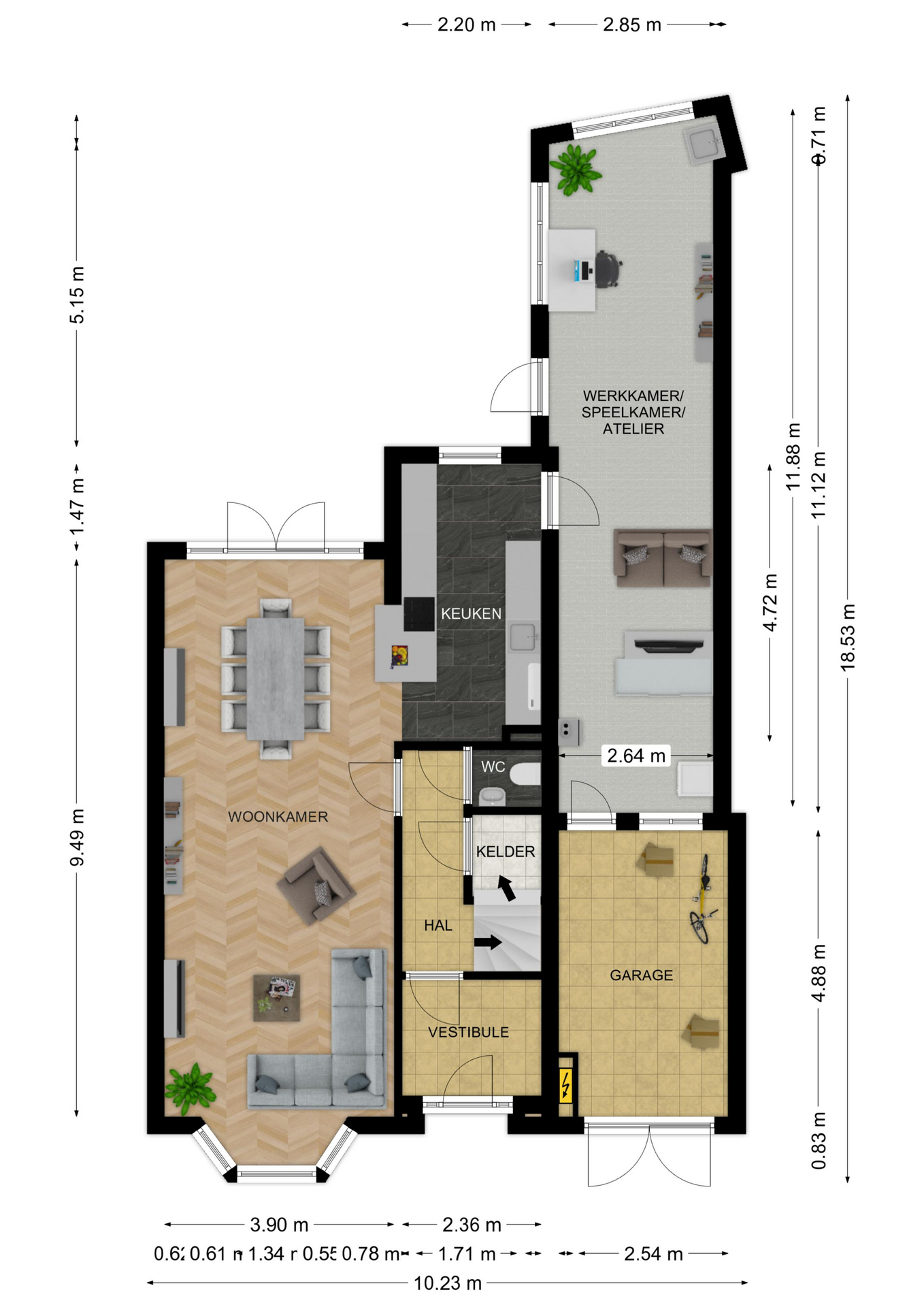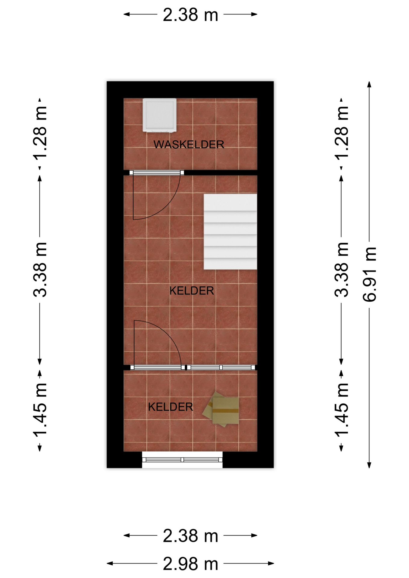 Provisiekelder (ca. 15 m2) verdeeld over drie ruimtes met o.a. opslagruimte en witgoedaansluitingen.