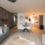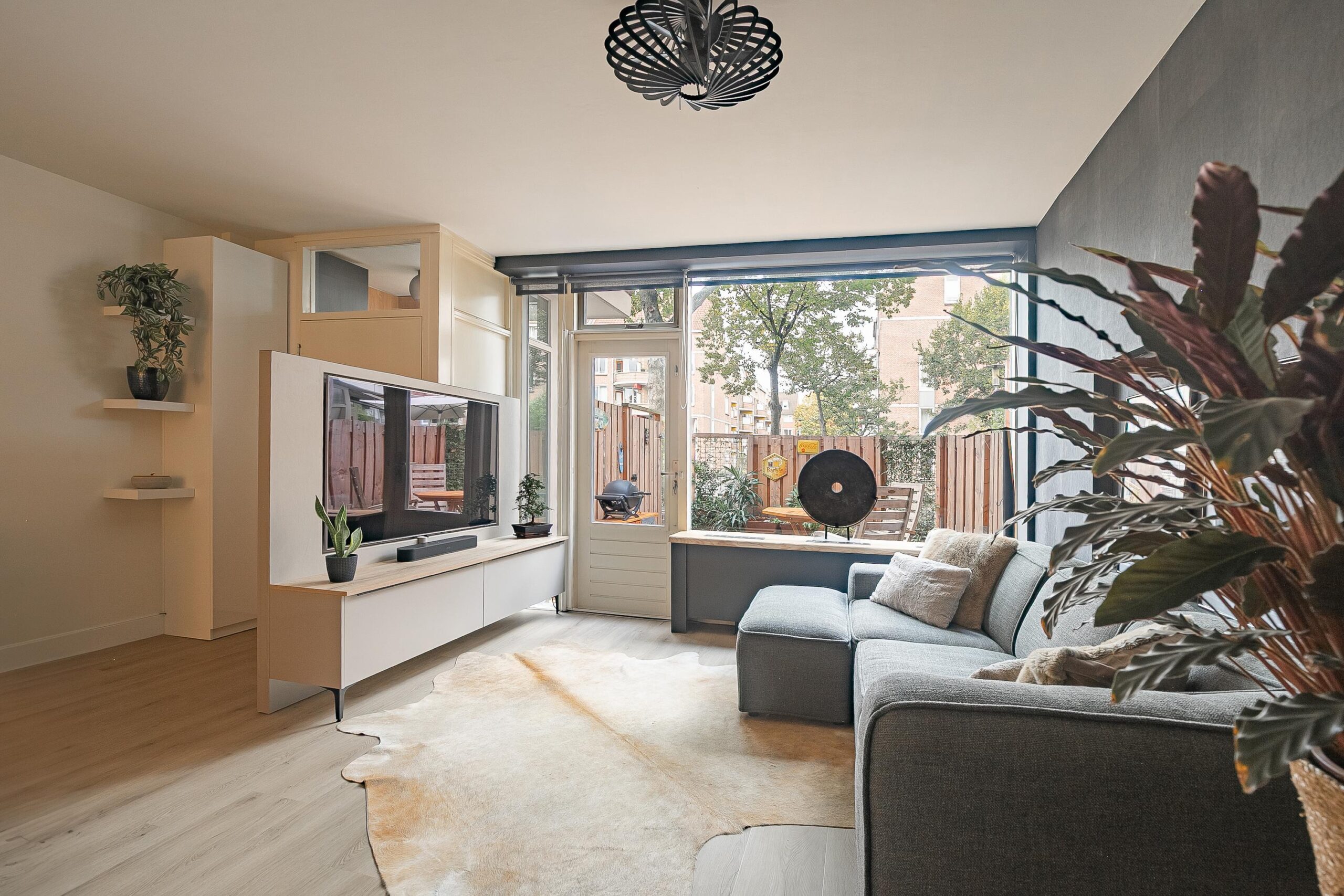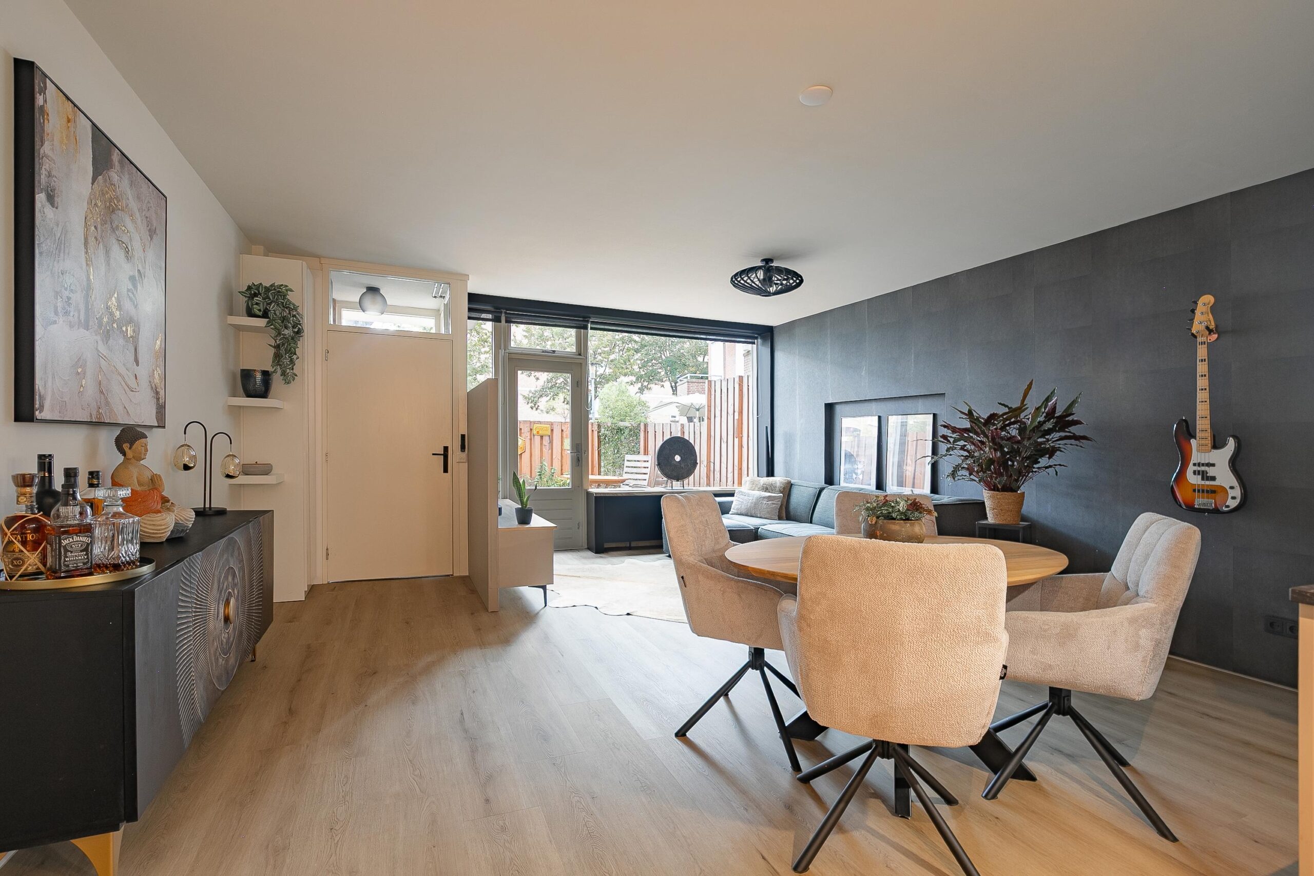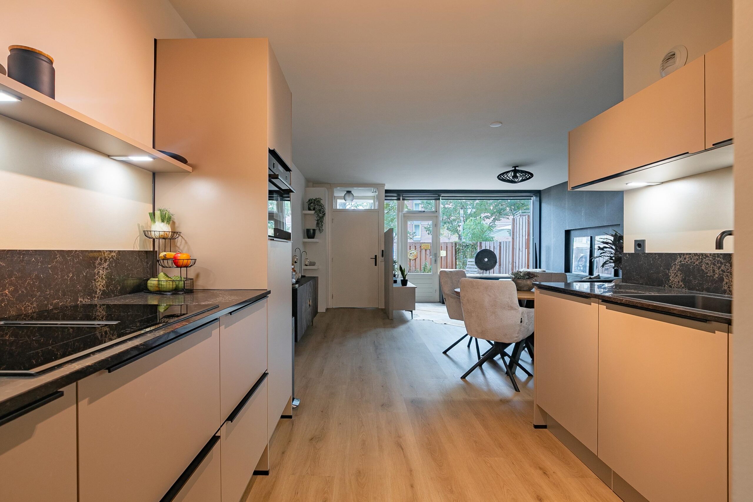 Via de entree met garderoberuimte betreed je de ruime woonkamer (ca. 28 m²), voorzien van een lichte pvc-vloer en een moderne open keuken in neutrale tinten. De keuken is uitgerust met diverse hoogwaardige inbouwapparatuur, waaronder een Quooker-kraan, inductiekookplaat met bridgefunctie en ingebouwde afzuiging, hoge koelkast, diepvries, vaatwasser en spoelbak. Onder de trap bevindt zich een handige berging.