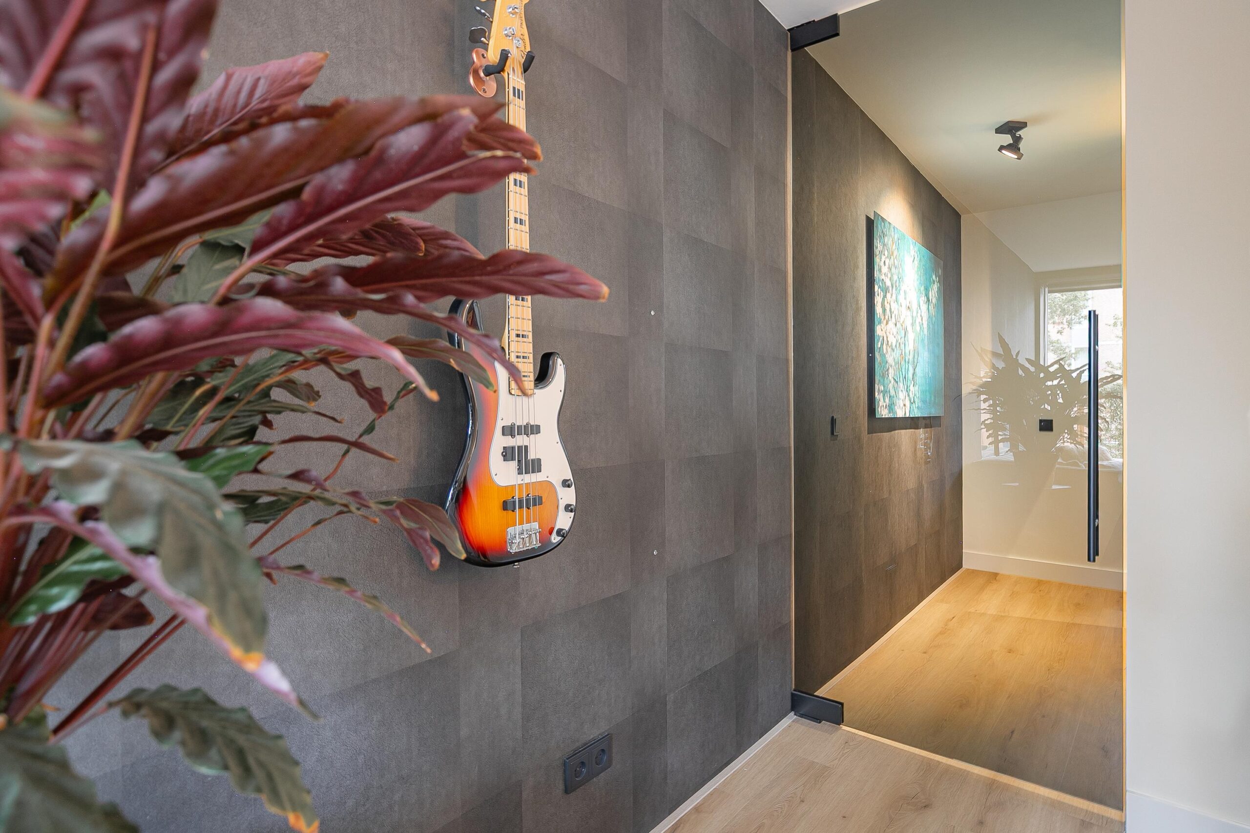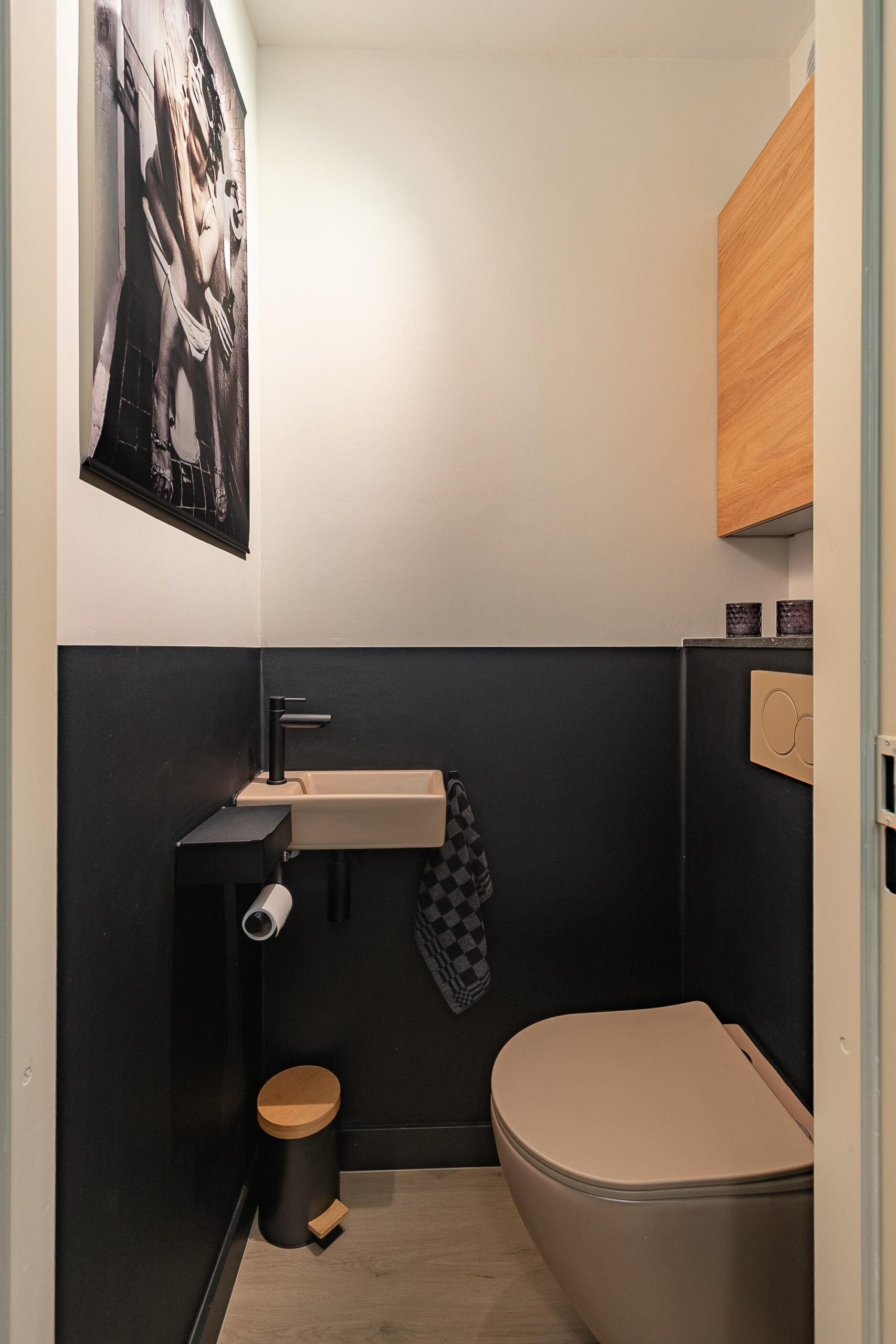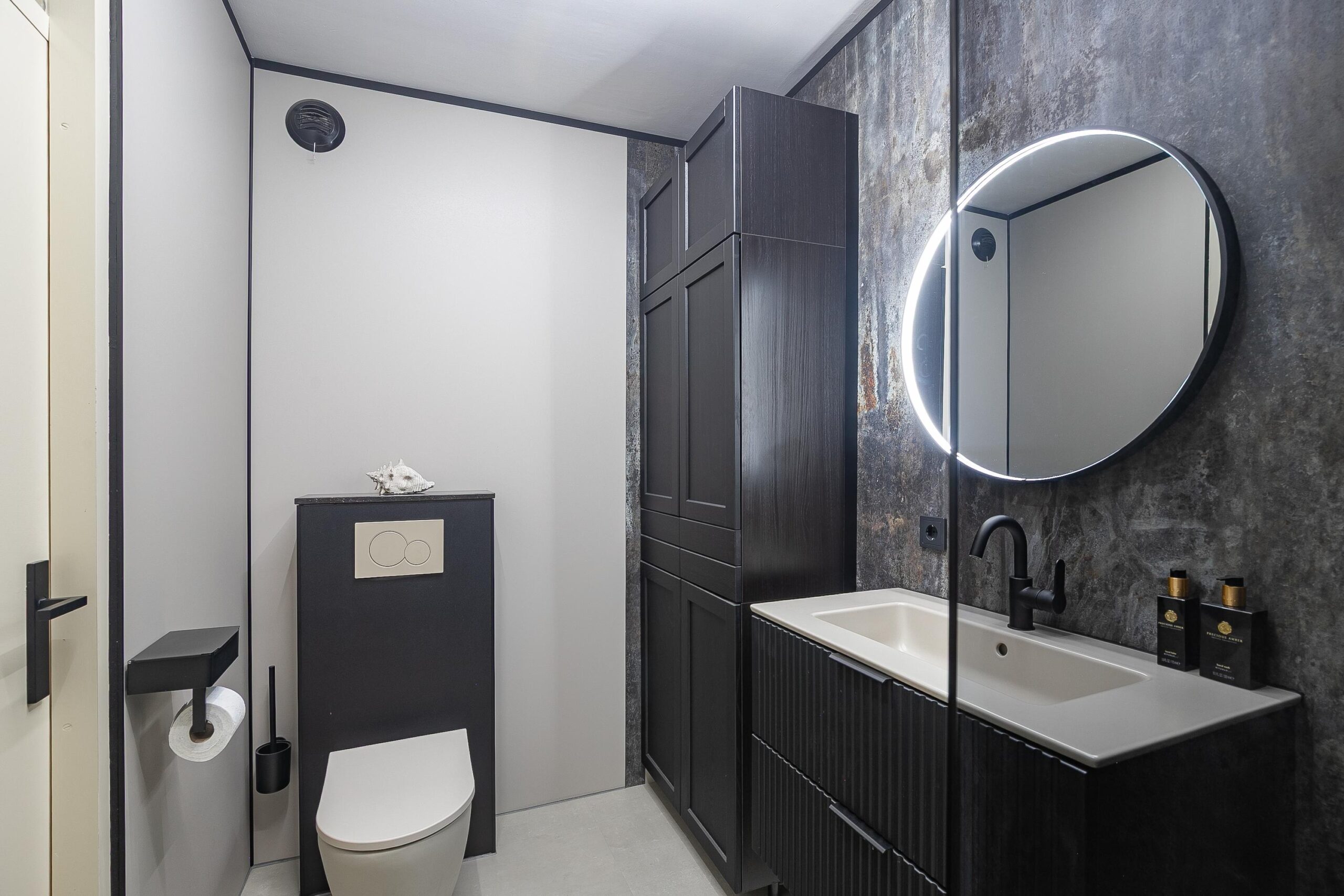 Via een glazen deur bereik je de hal met toegang tot de meterkast en de moderne toiletruimte met een hangcloset en een fonteintje.