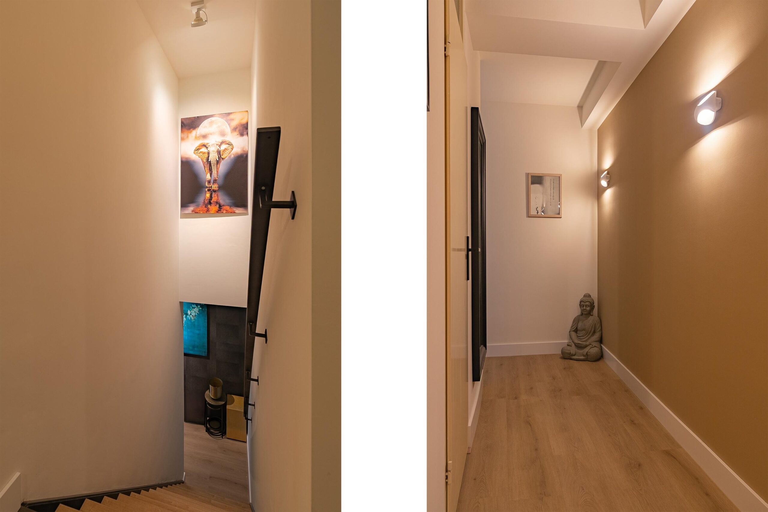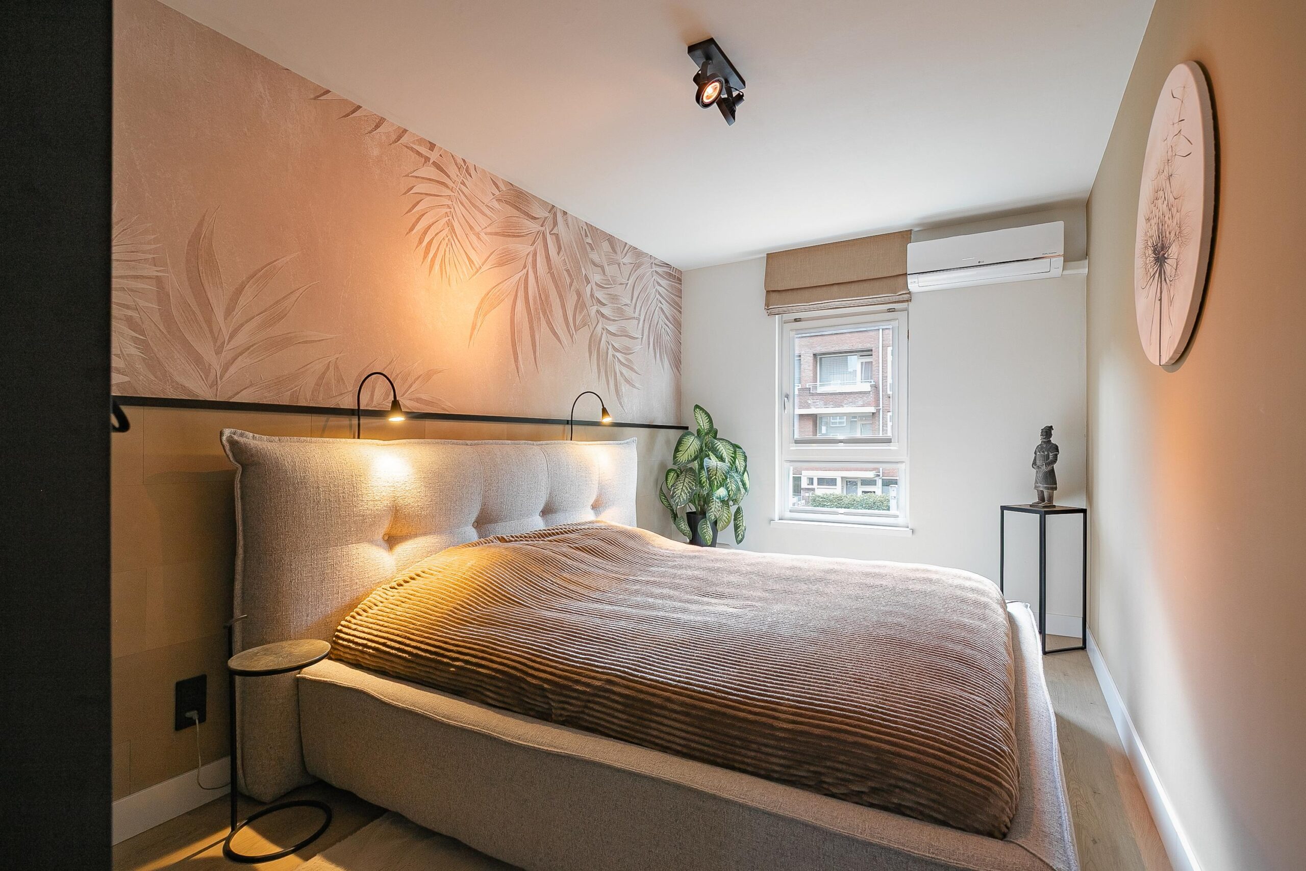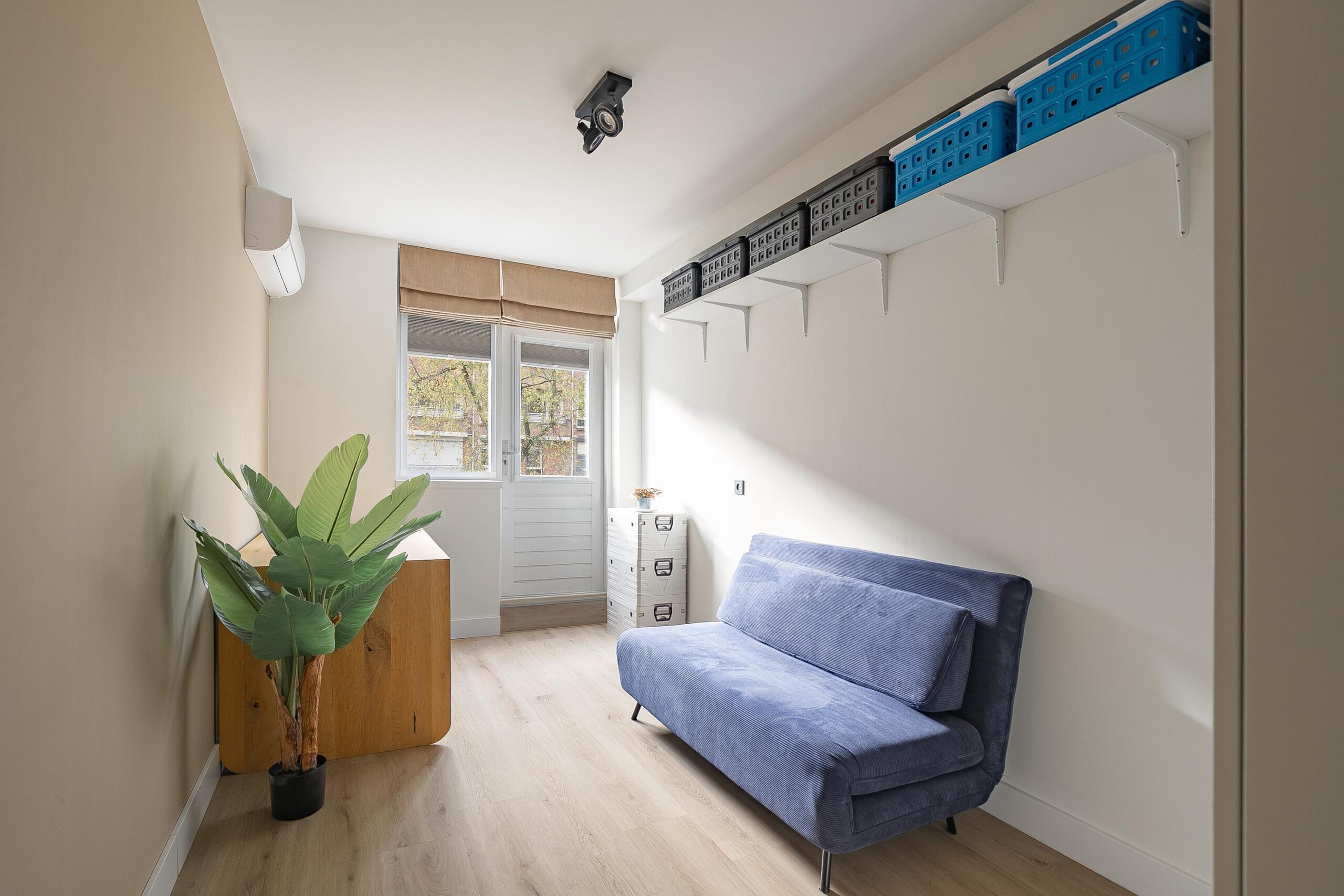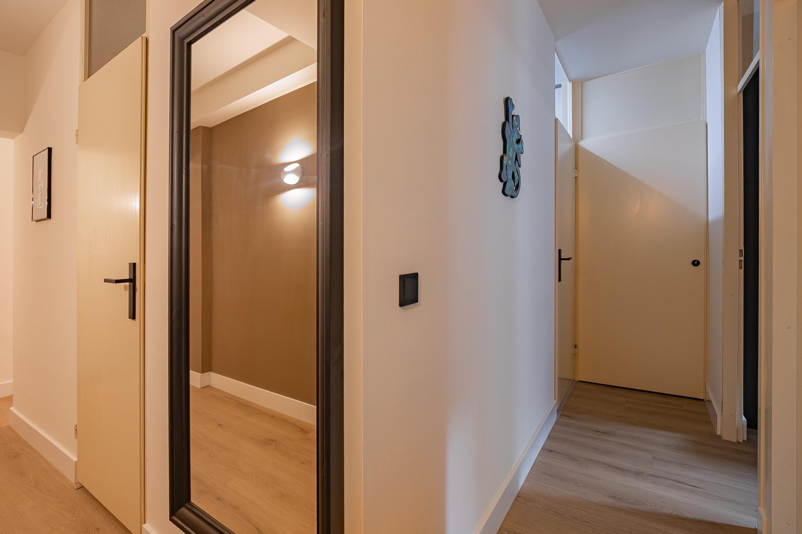 De overloop biedt toegang tot twee lichte slaapkamers (ca. 12 m² en 10 m²), beide voorzien van een pvc-vloer en airconditioning. In de muurkast bevinden zich de cv-installatie (Intergas, gehuurd uit 2021) en de aansluitingen voor de wasmachine.
