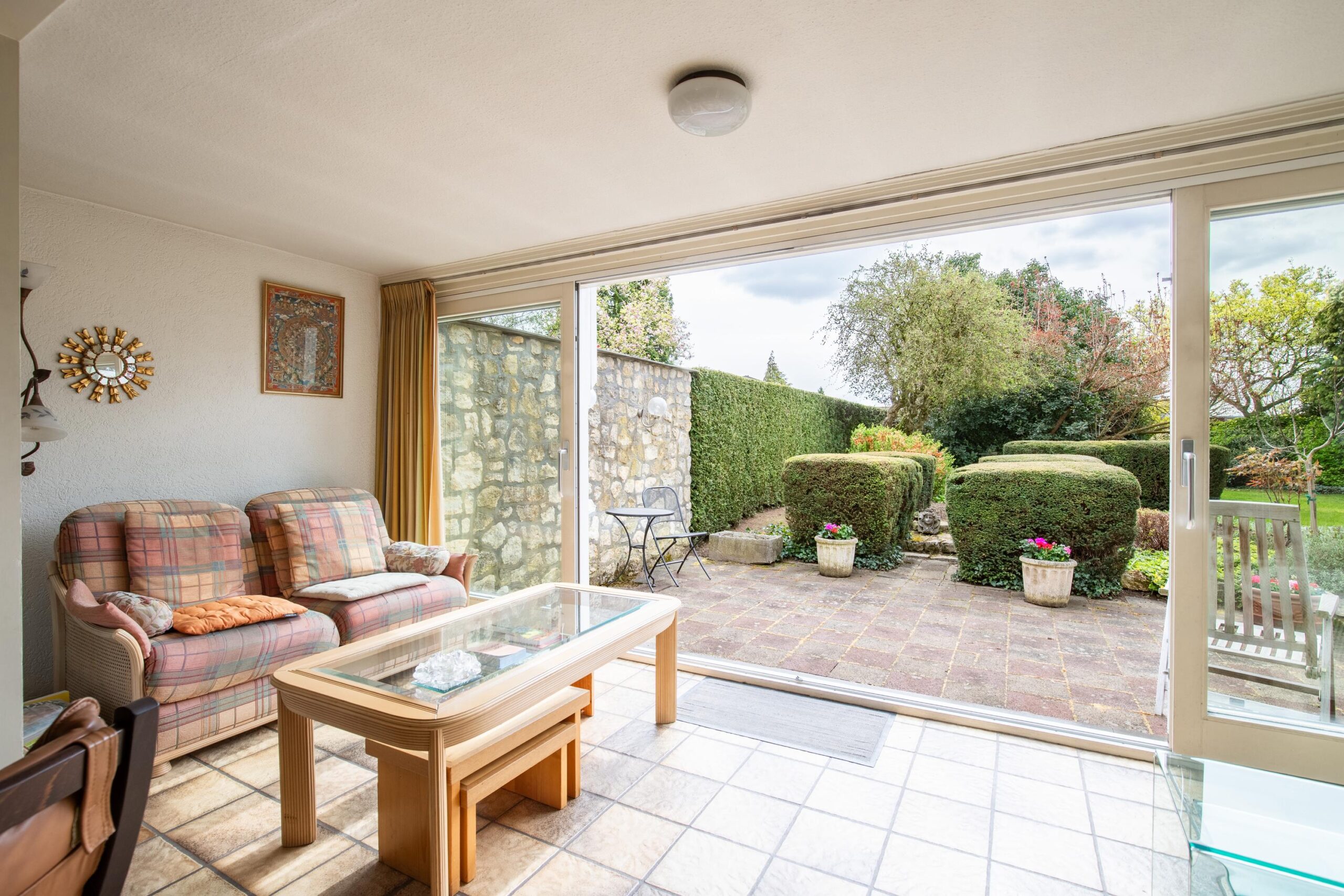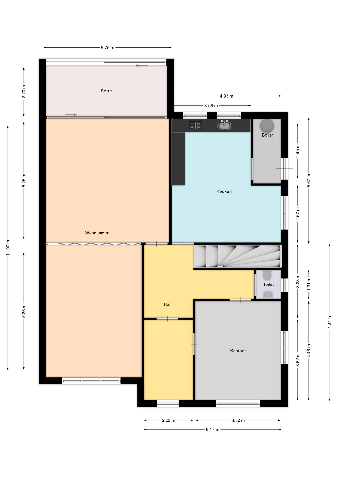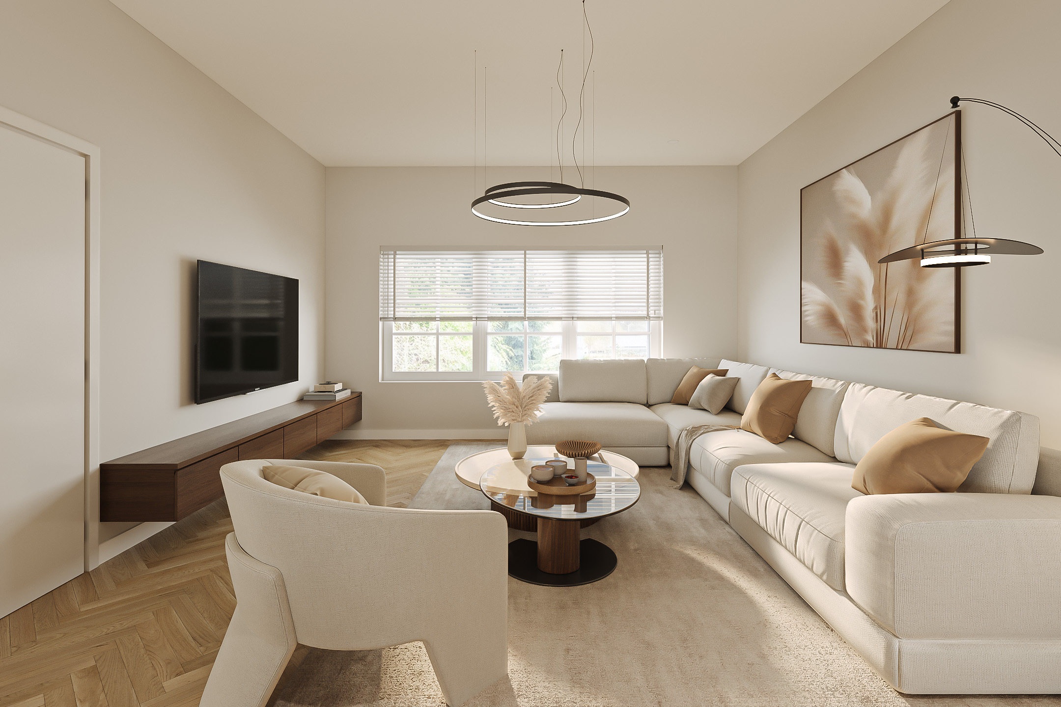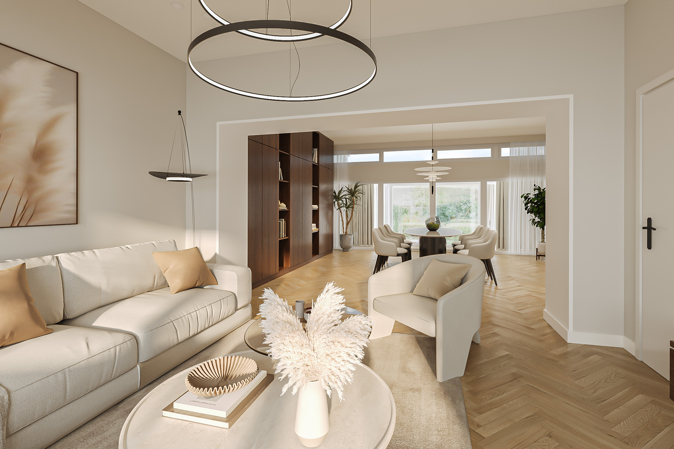 Daarnaast biedt de hal toegang tot de woonkamer en de gesloten keuken. De royale woonkamer (ca. 58 m²) is ingedeeld in een zit- en eetgedeelte, welke van elkaar gescheiden kunnen worden middels een harmonicadeur. Aan de achterzijde bevindt zich een aangebouwde serre met een dubbele schuifpui naar de achtertuin, waardoor er veel lichtinval is en een prettige verbinding met buiten ontstaat.