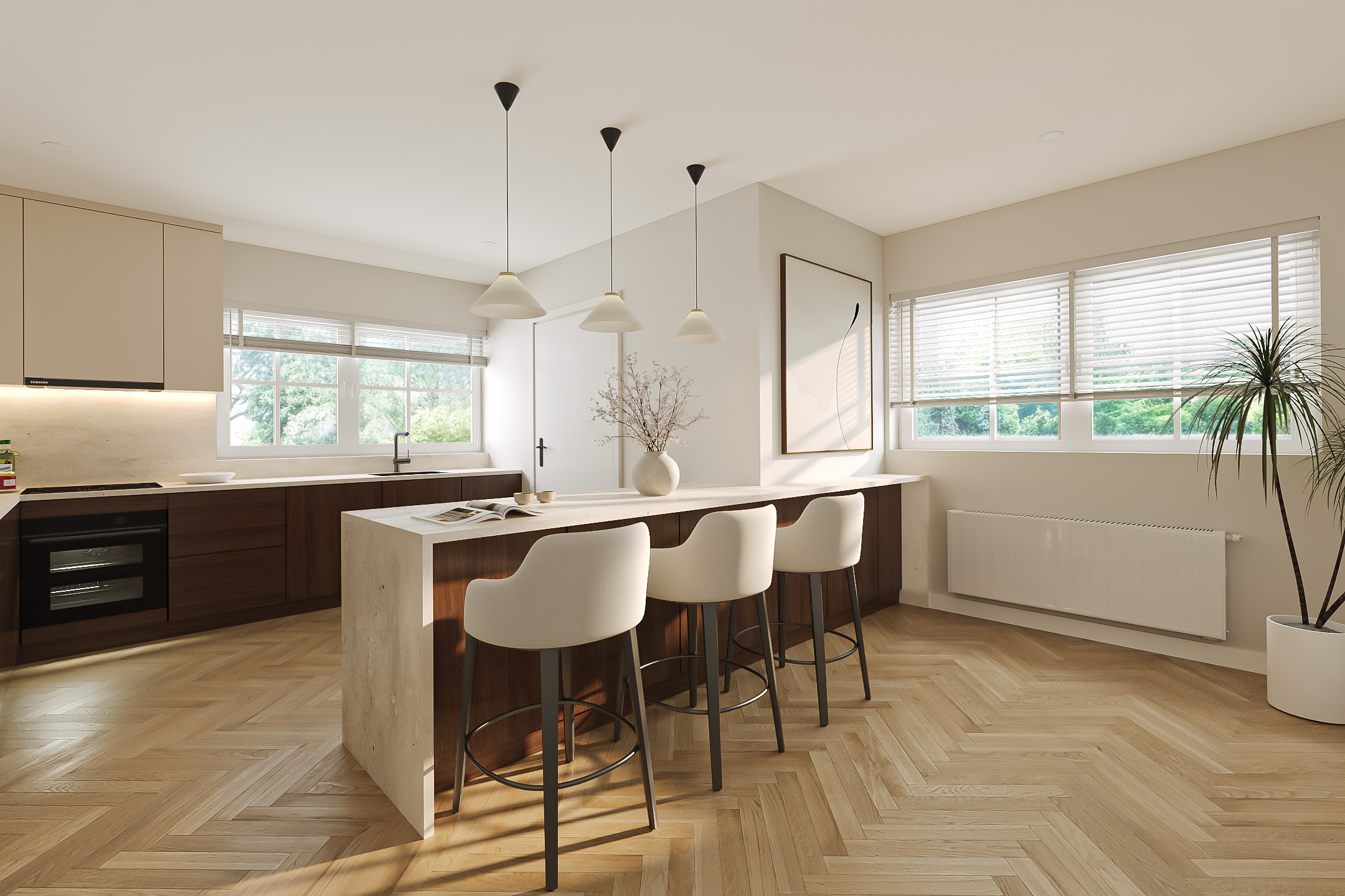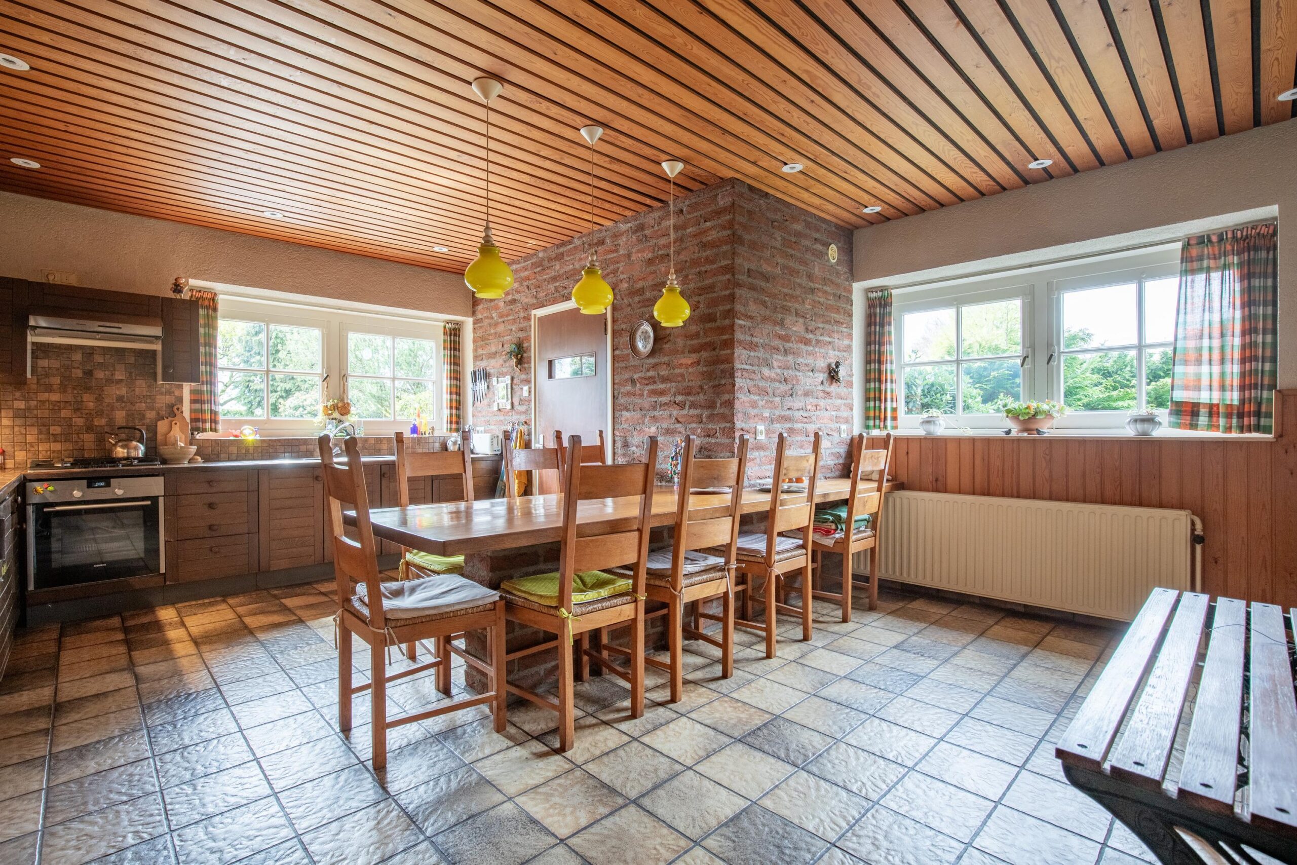 De naastgelegen, gesloten woonkeuken is ruim van opzet (ca. 24 m²) en voorzien van een L-vormige keukenopstelling. Deze is uitgerust met een 4-pits gasfornuis, koelkast, diepvries, combi-oven, afzuigkap en spoelbak. Aansluitend aan de keuken bevindt zich een praktische bijkeuken met wasmachineaansluiting, de opstelling van de boiler en een deur naar de zijtuin.