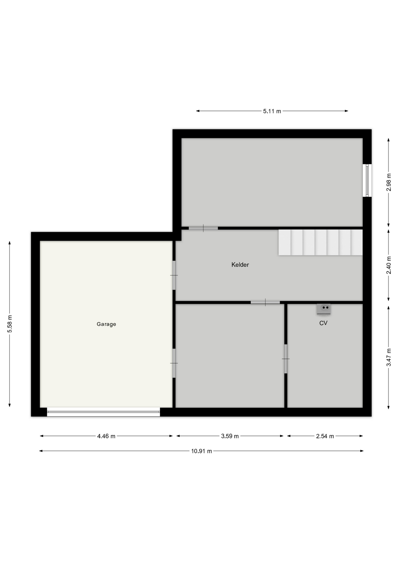 Het souterrain, bereikbaar via de keuken, is ingedeeld in vier ruimtes. Hier bevinden zich onder andere de inpandige garage, een provisieruimte en de stookruimte met opstelling van de cv-ketel (Intergas Kombi Kompakt HRE , 2025). Daarnaast is er nog een extra ruimte die naar wens te gebruiken is, bijvoorbeeld als hobby- of bergruimte.