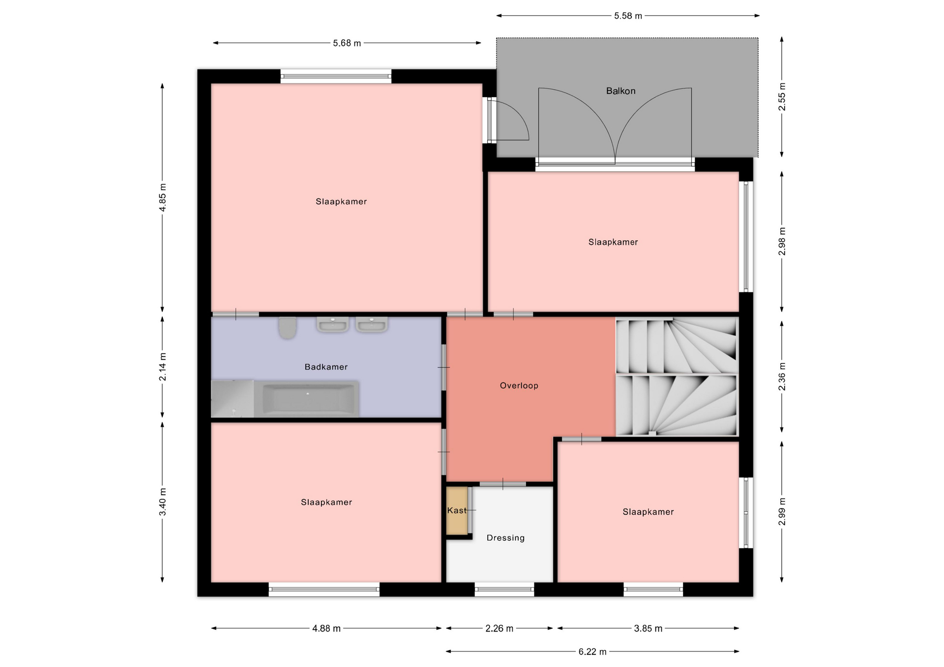 De slaapkamer van ca. 17 m² aan de achterzijde biedt middels openslaande deuren toegang tot een ruim balkon van ca. 14 m². Ook de grootste slaapkamer heeft toegang tot dit balkon. De badkamer (ca. 10 m²) is zowel vanuit de grootste slaapkamer als vanaf de overloop bereikbaar en is voorzien van een douche, ligbad, toilet en dubbele wastafel.