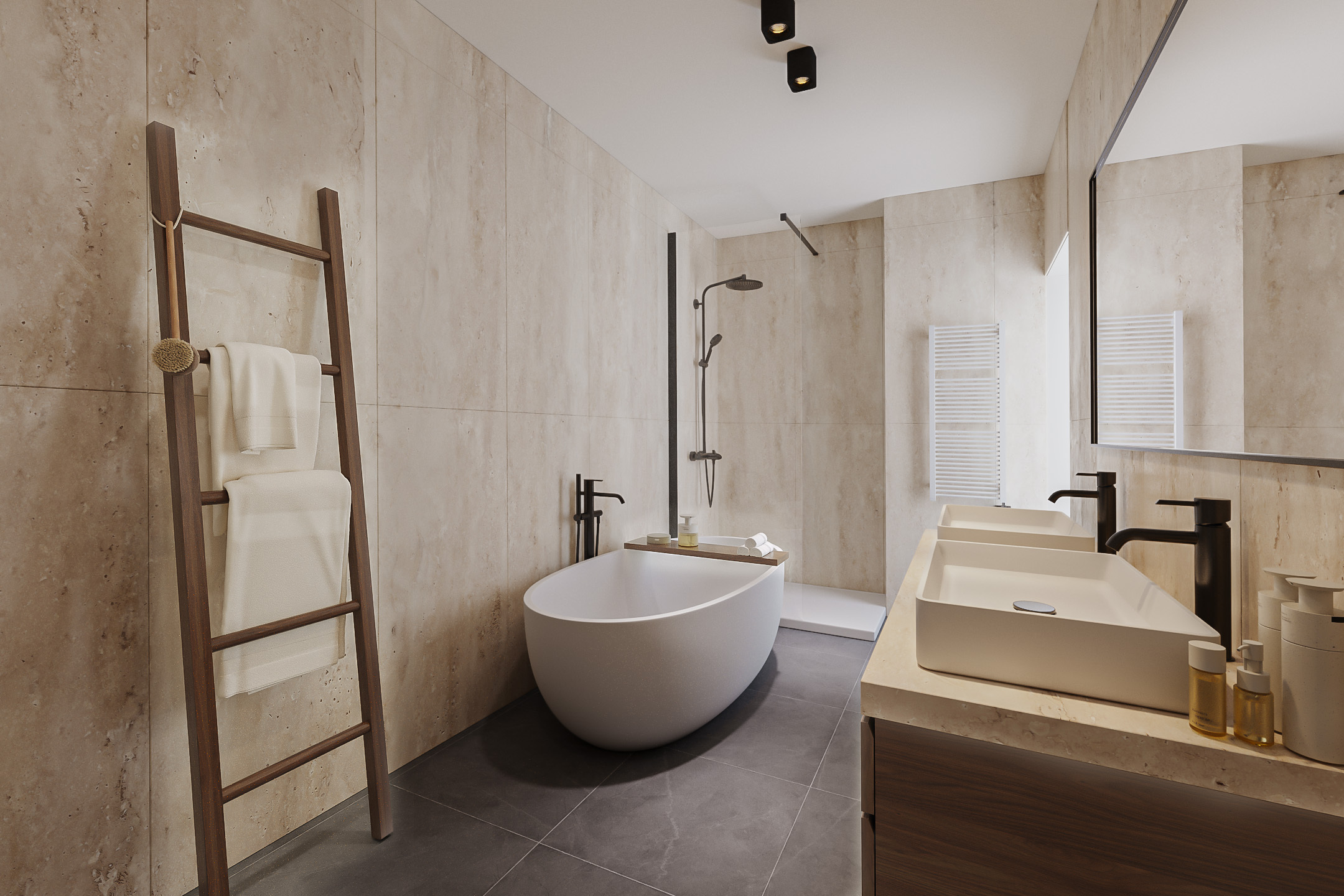 - Badkamervoorzieningen Toilet, douche, wastafel, ligbad, toilet, douche, dubbele wastafel