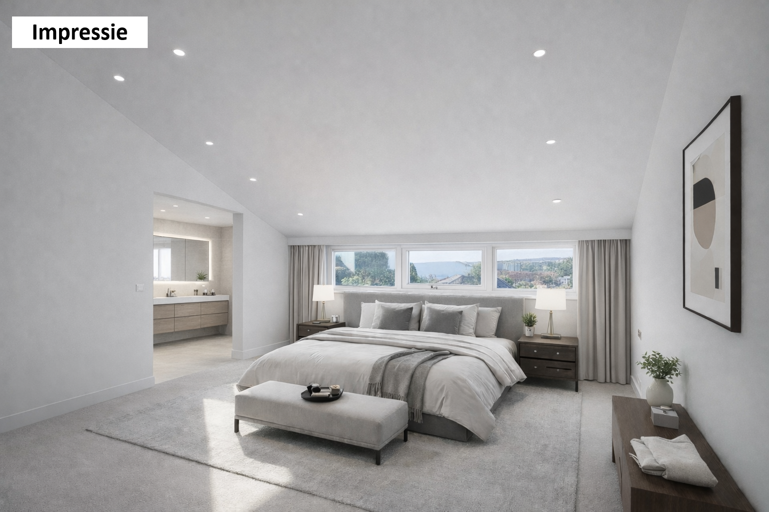 Middels het fraaie halfronde trappenhuis bereikt men de ruime overloop met toegang tot drie slaapkamers, een badkamer, separaat toilet en een portaal. De slaapkamers aan de voorzijde zijn ca. 7 en 9.5m² groot en beschikken over mooi uitzicht. De badkamer is ca. 4m² groot en beschikt over een douche, wastafel, dakraam en toegang tot een bergruimte. De master bedroom is aan de achterzijde gelegen (ca. 17m²) en voorzien van een badkamer en-suite. Deze badkamer (ca. 6m²) beschikt over een ligbad-/douchecombinatie, wastafel en een dakkapel. Het portaal van ca. 8m² heeft zicht op de woonkamer maar is eenvoudig te transformeren tot extra slaapkamer.