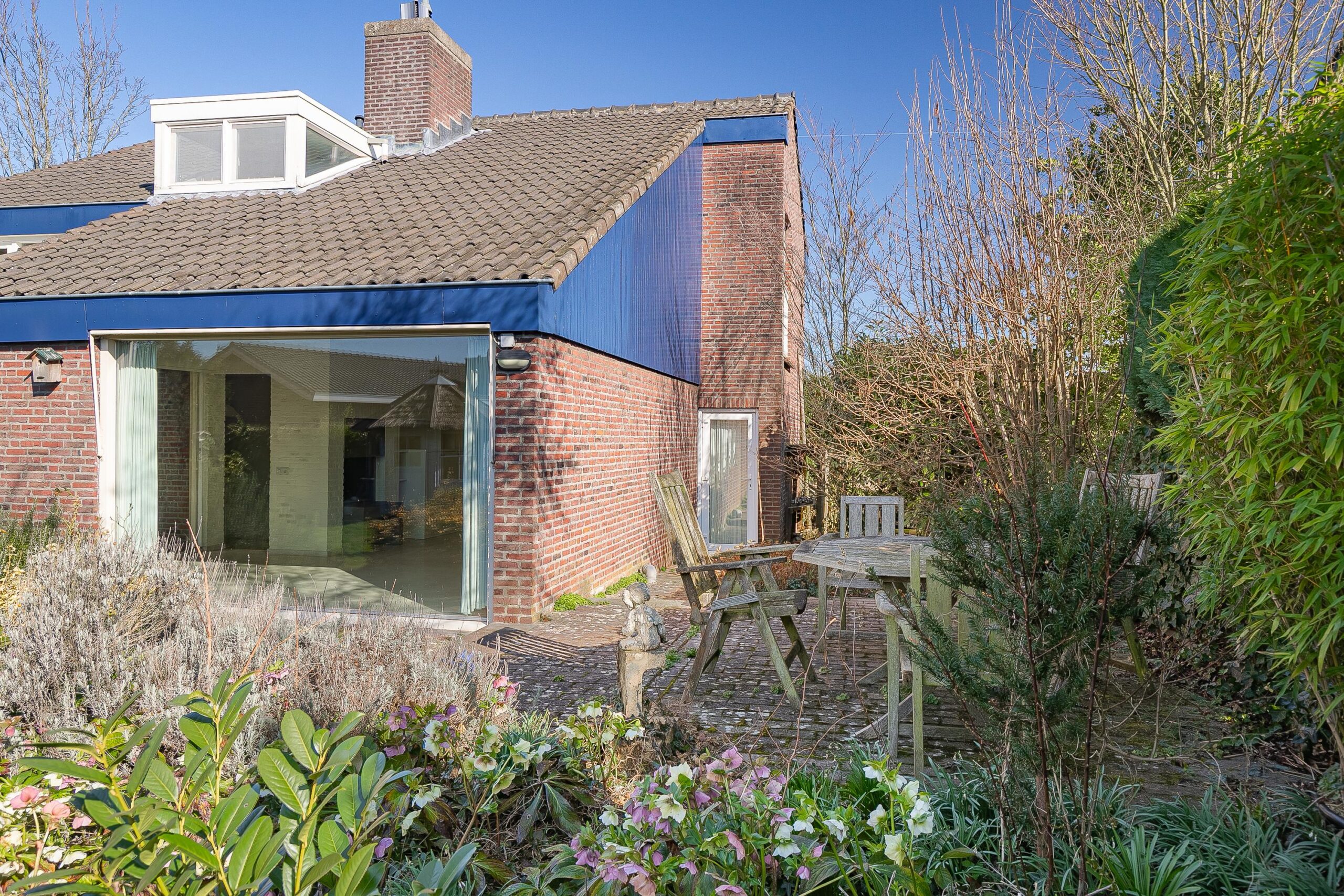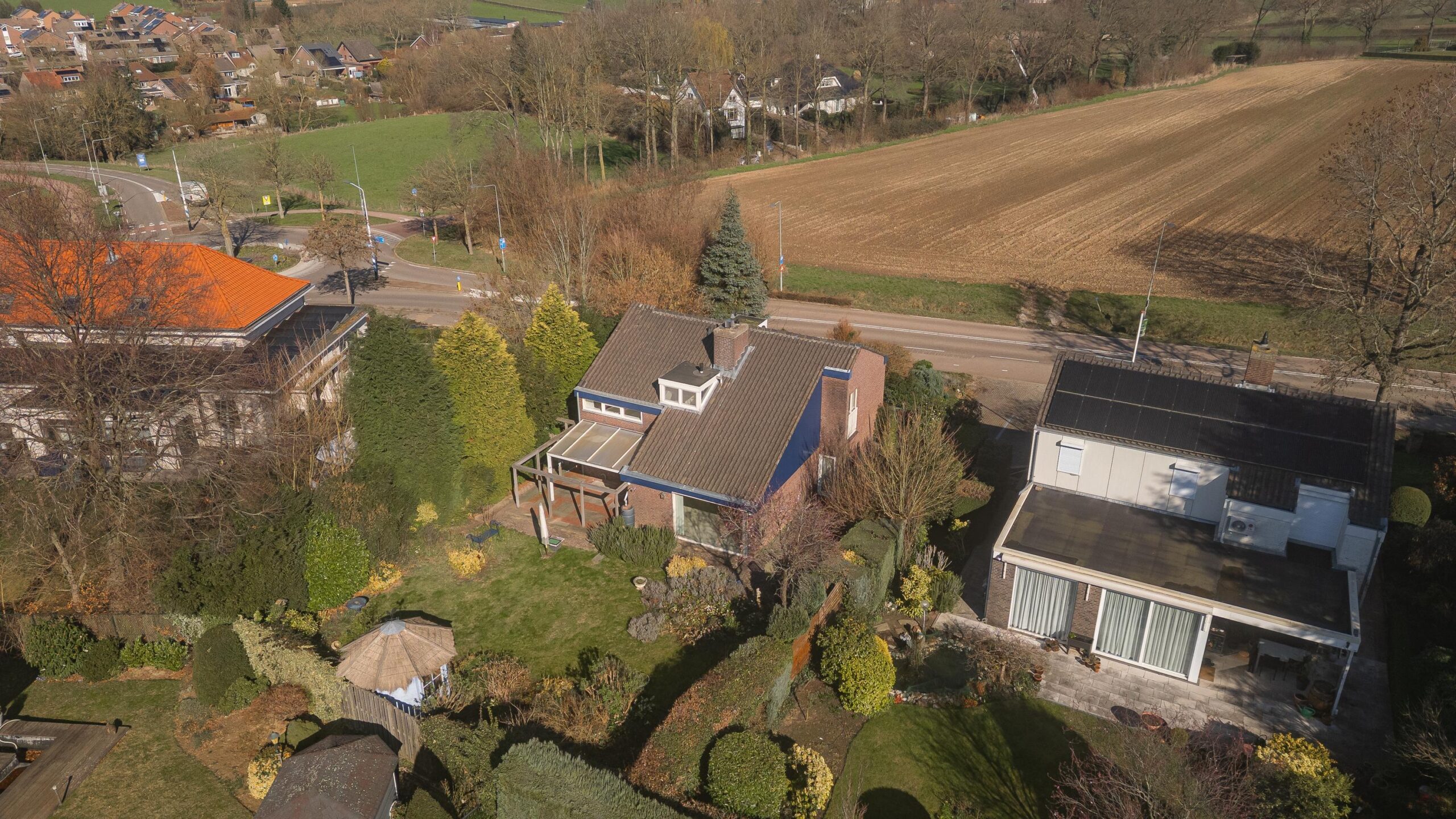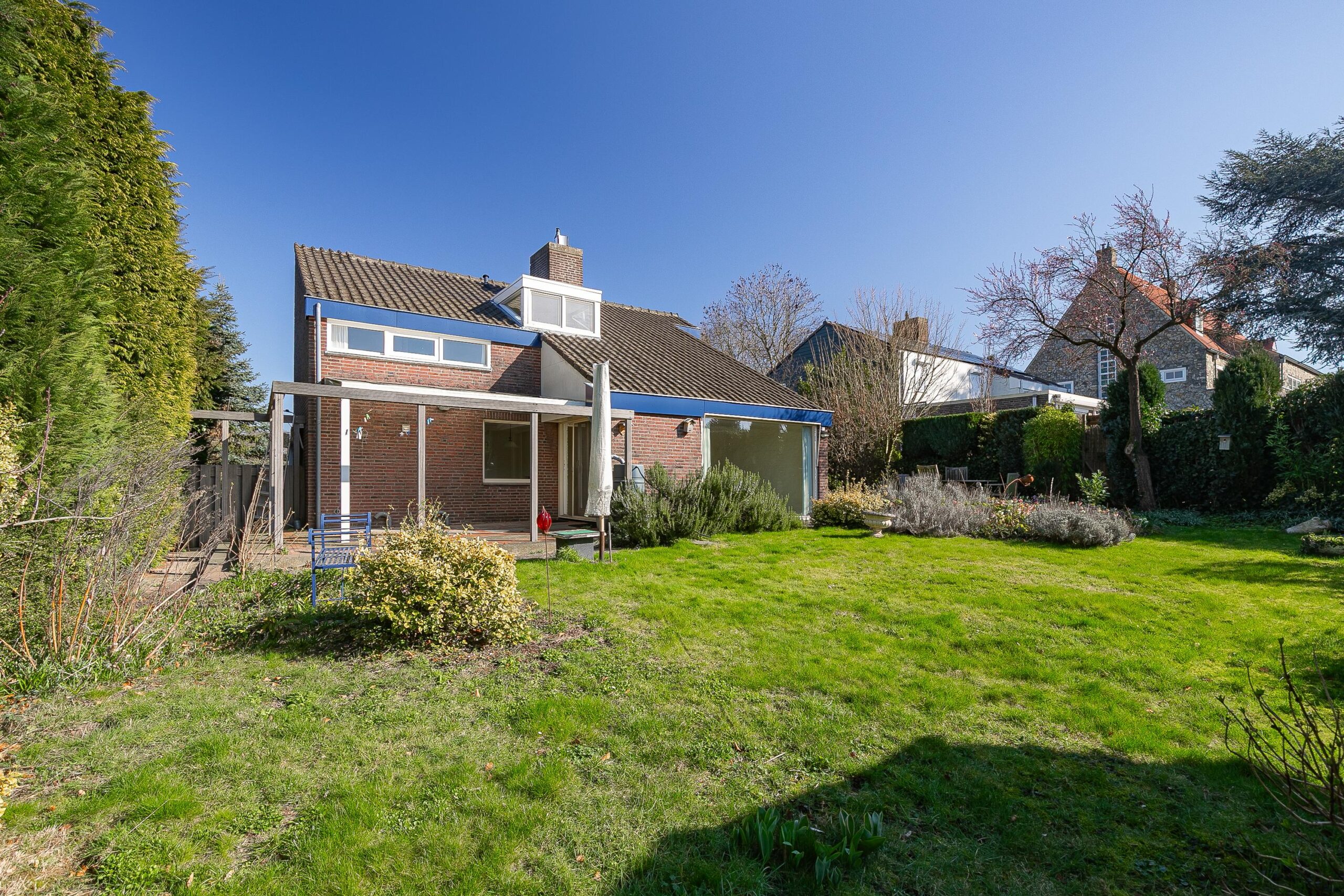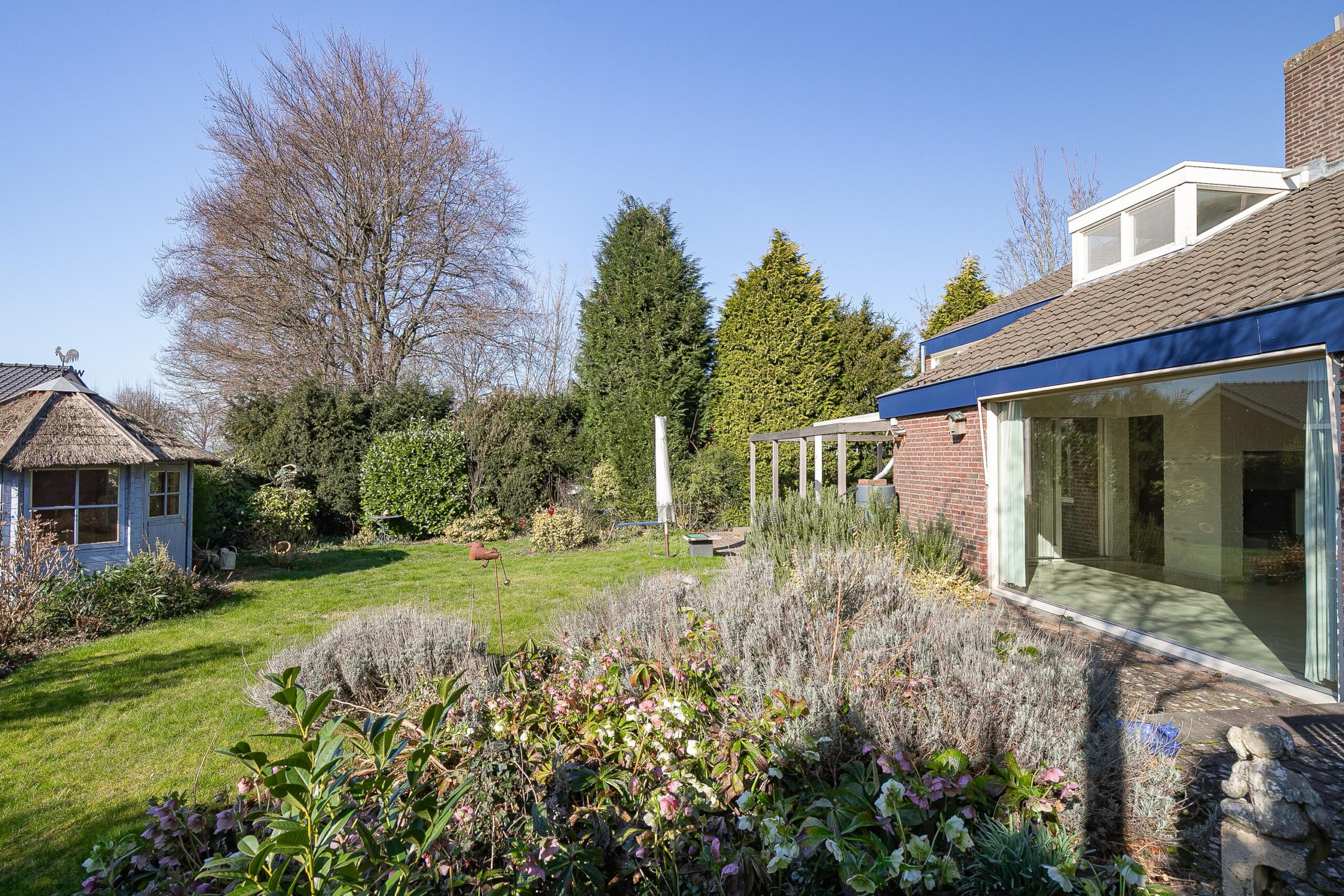 De woning is centraal gepositioneerd op het perceel, wat resulteert in royale buitenruimtes aan zowel de voor- als achterzijde. De zonnige achtertuin is privé gelegen en biedt diverse terrassen / zithoekjes met overkappingen, een fijn gazon, diverse volwassen beplanting, een praktisch tuinhuis en een dubbele achterom. De voortuin met riante oprit beschikt over panoramisch uitzicht over de velden.