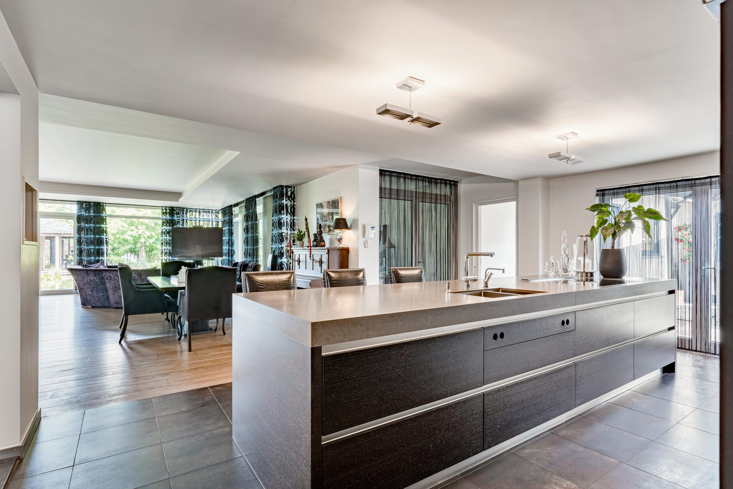 – Ruime leefkeuken in wengéhout met kookeiland in graniet, uitgerust met inductiekookplaat, dampkap, stoomoven, heteluchtoven, koffiemachine, koelkast en vaatwasser