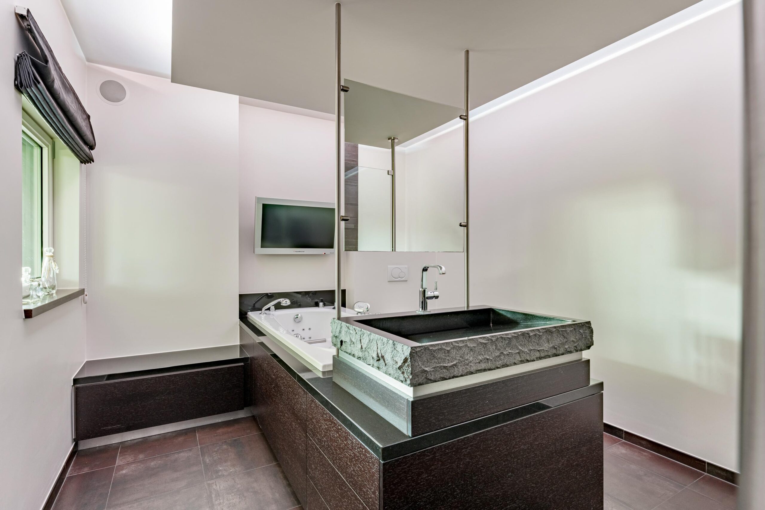 – Tweede badkamer met ligbad, douche, bidet, toilet en twee ronde wastafels