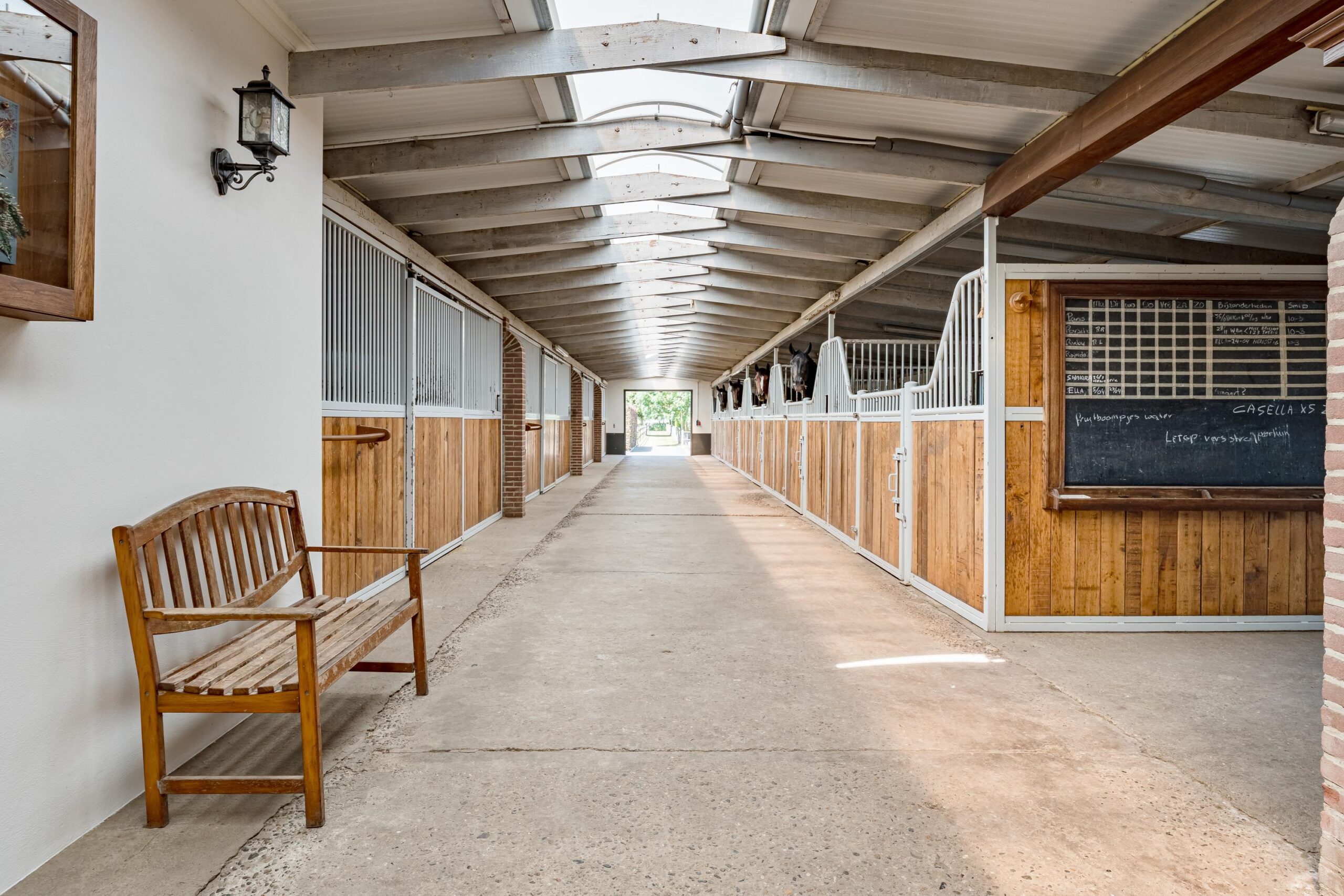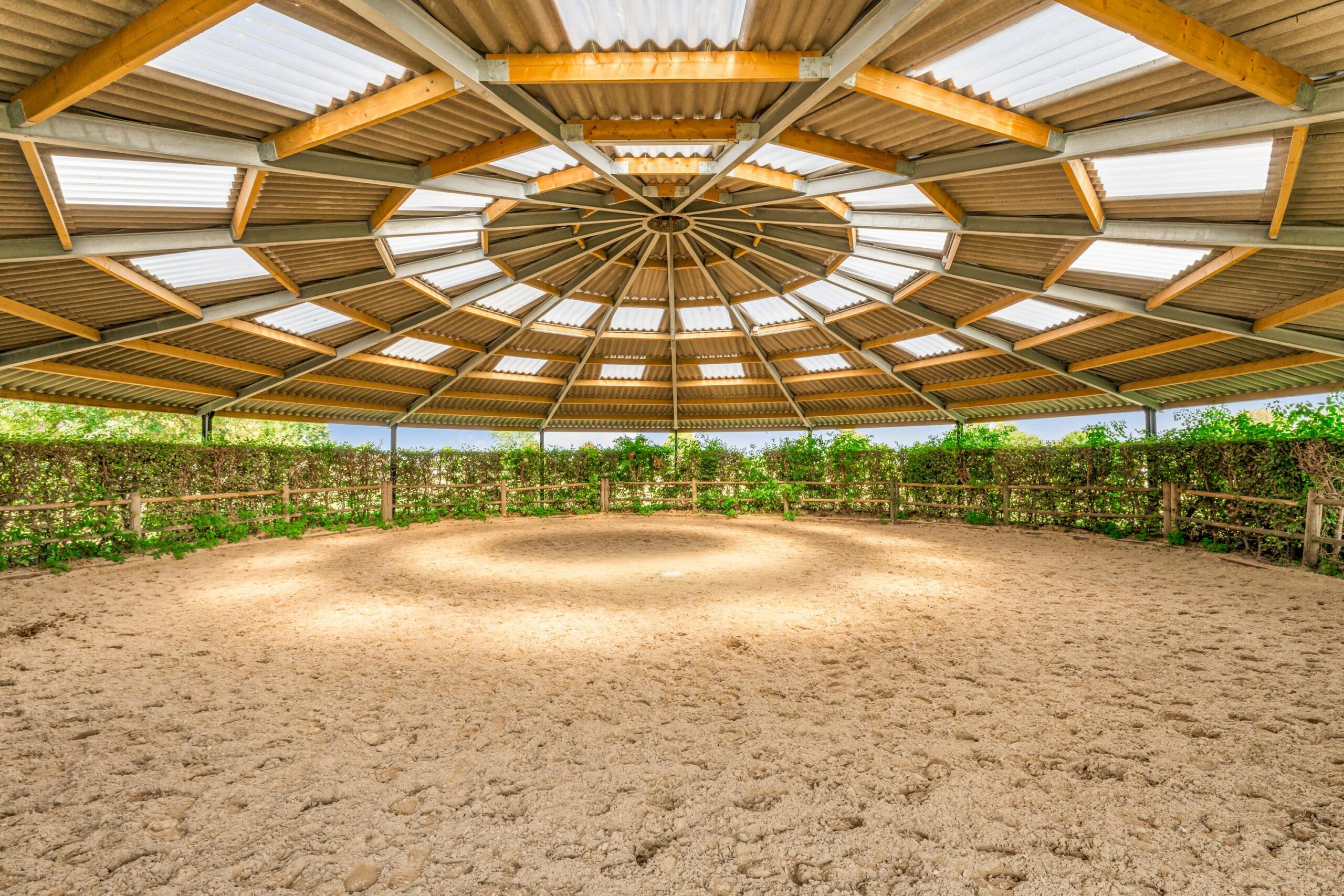 – Paardenboxen met betonnen vloer, gegalvaniseerd metalen frame en hardhouten panelen, uitgerust met voederbakken, verwarmde drinkbakken en een vliegwerende vernevelingsinstallatie