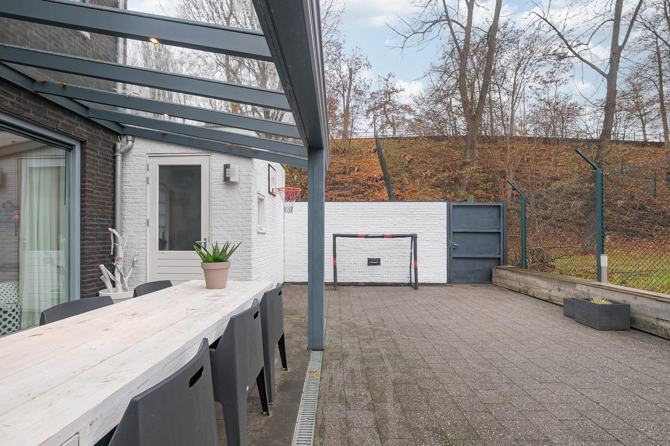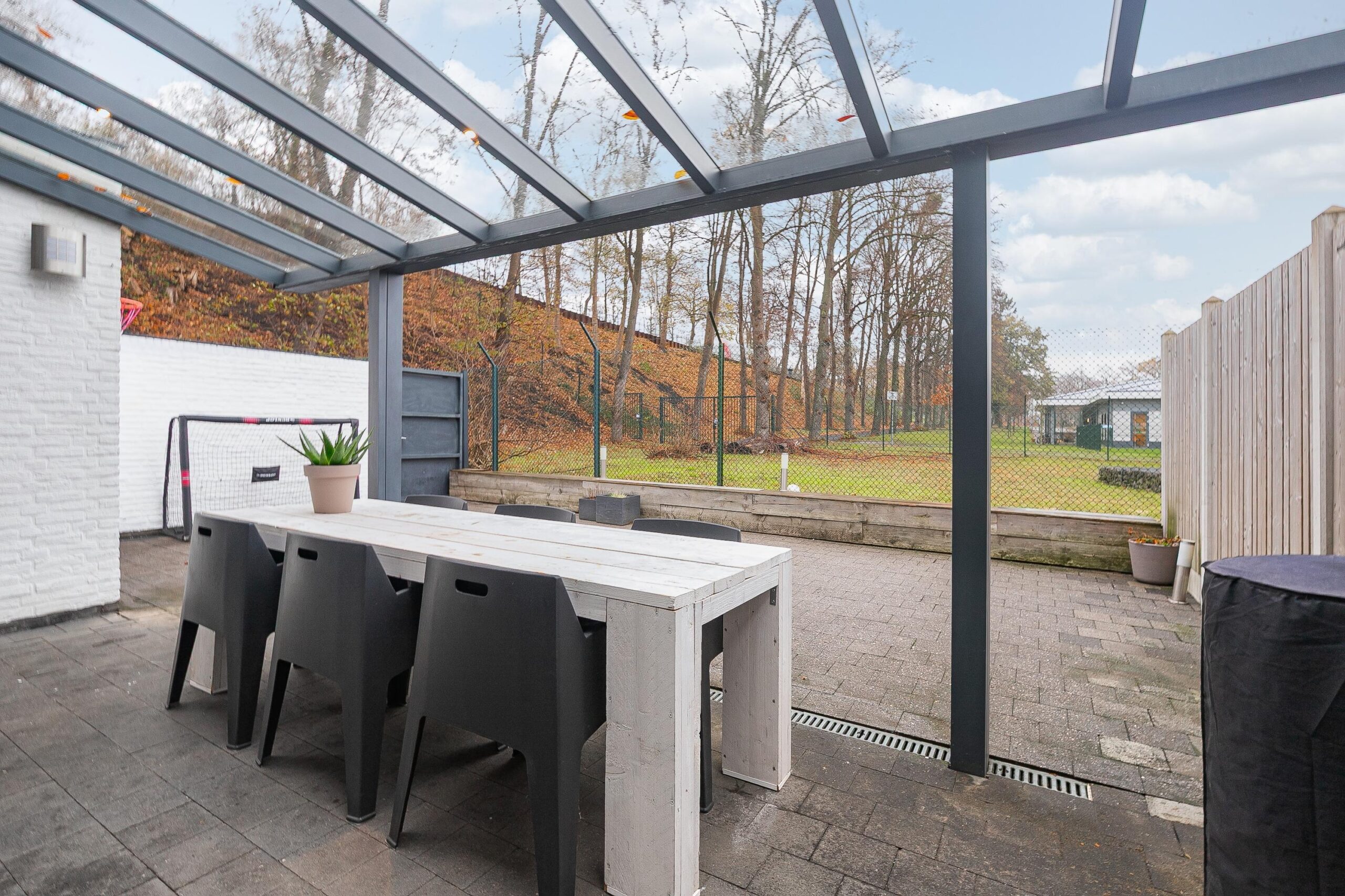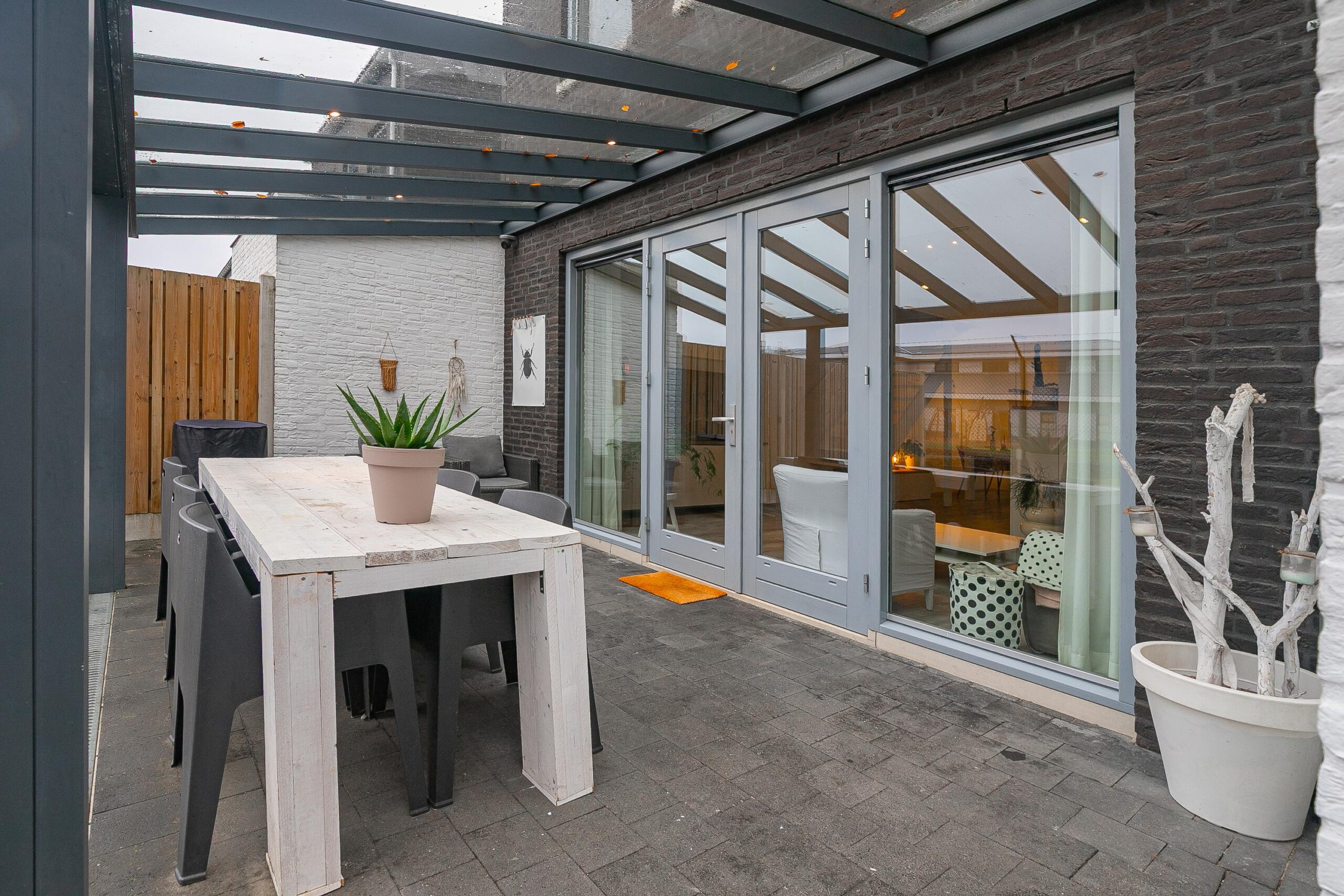 Onderhoudsvrije tuin met terrasoverkapping met verlichting, zijingang met afsluitbare poort en toegang naar de garage.