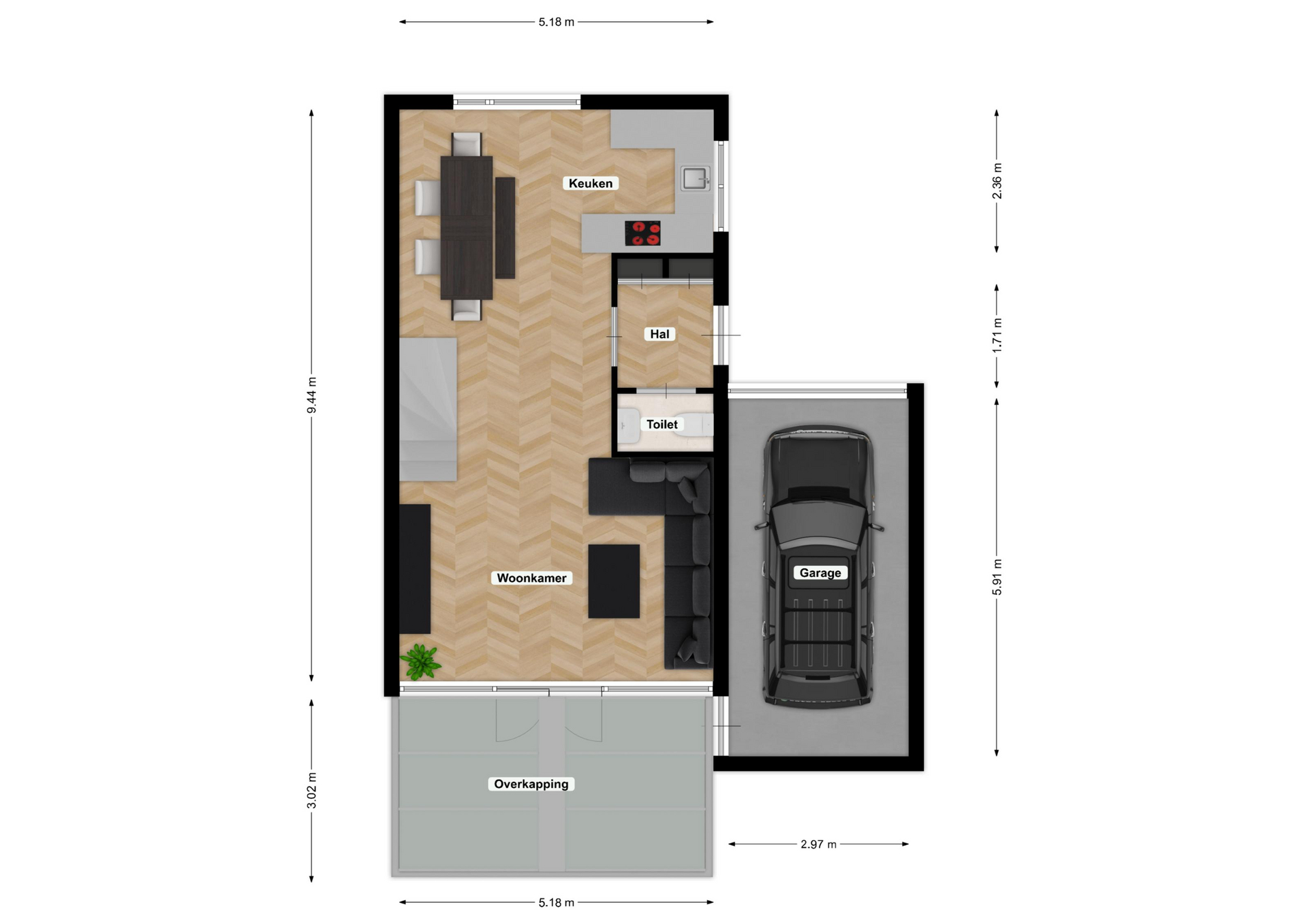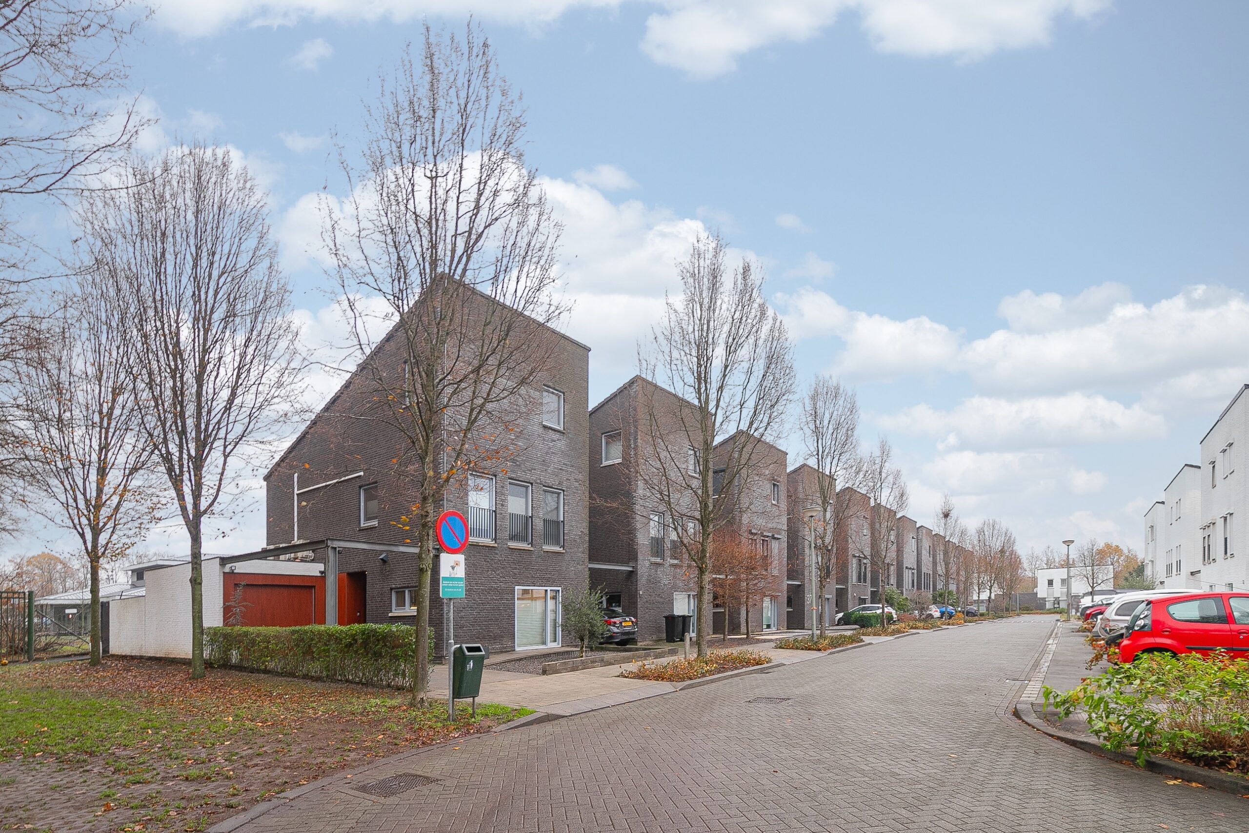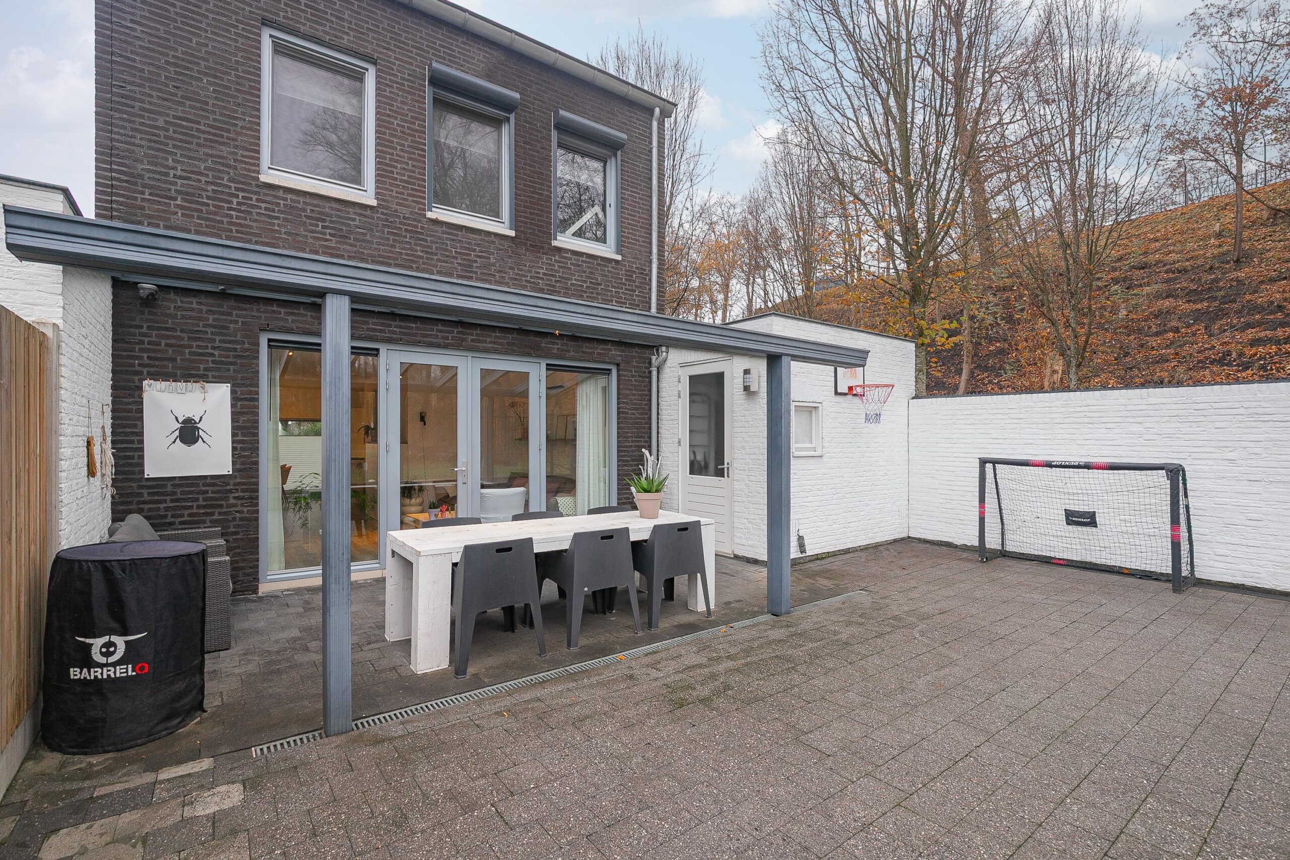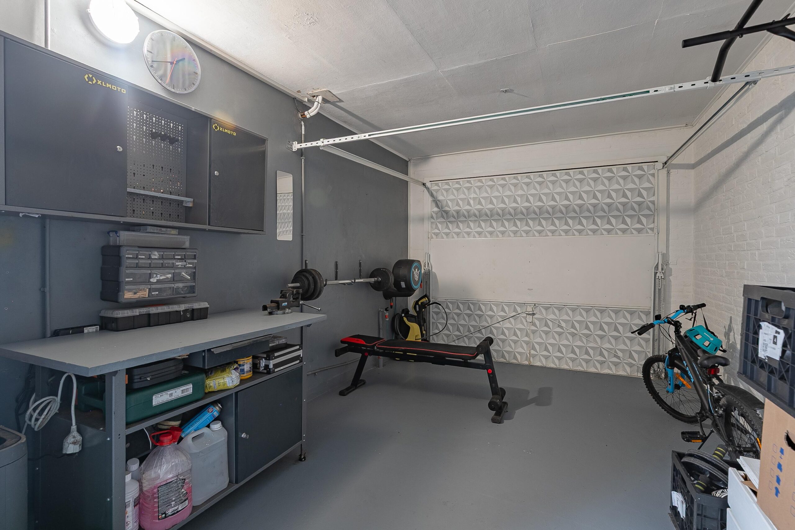 Onderhoudsvrije tuin met terrasoverkapping met verlichting, zijingang met afsluitbare poort en toegang naar de garage.
