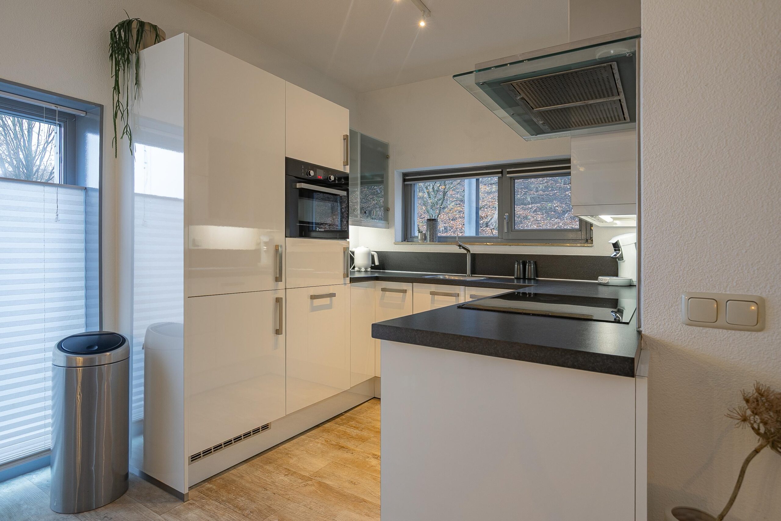 Hoogglans keuken in U-vorm inclusief navolgende apparatuur: inductiekookplaat, afzuigkap, koel- vriescombinatie,