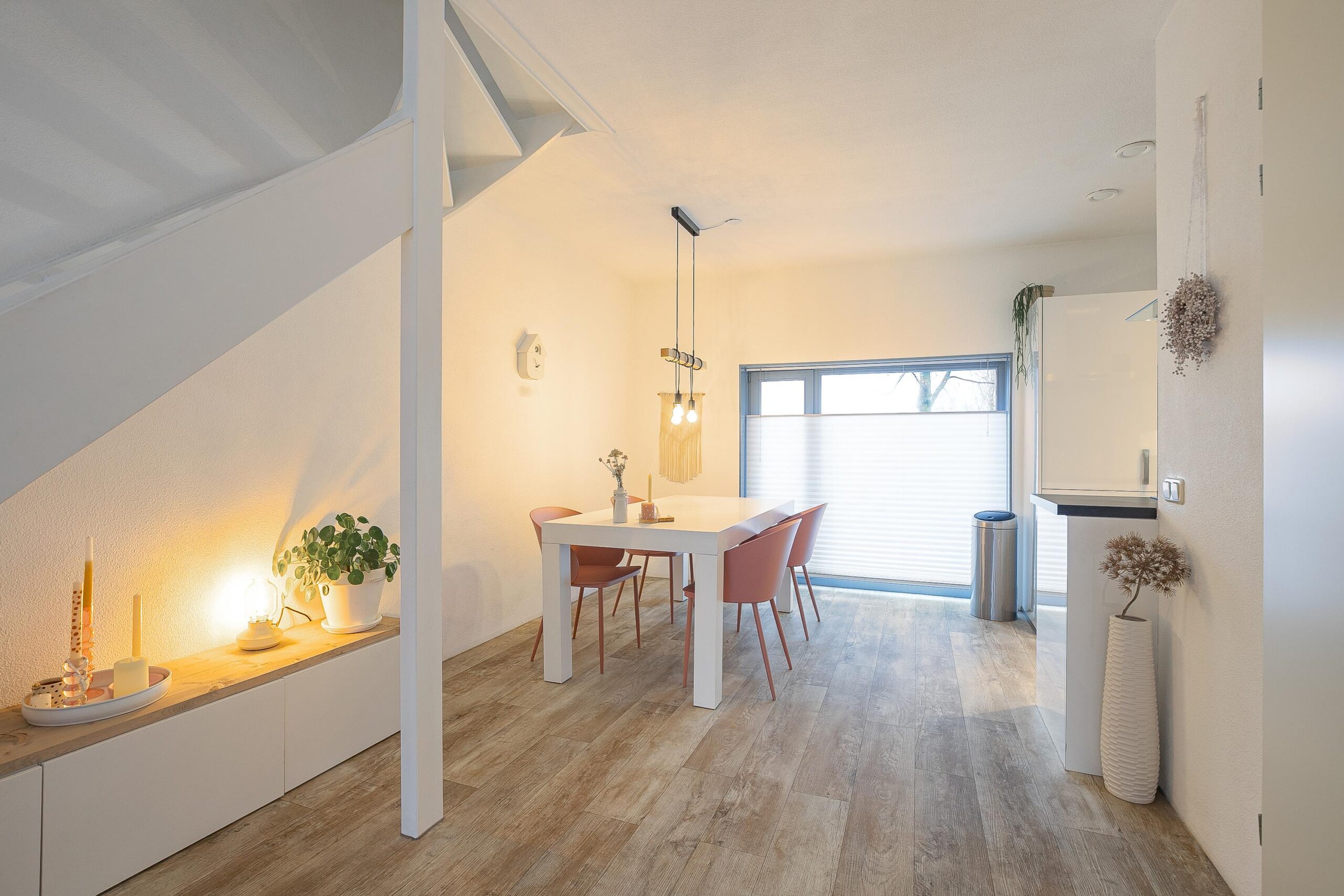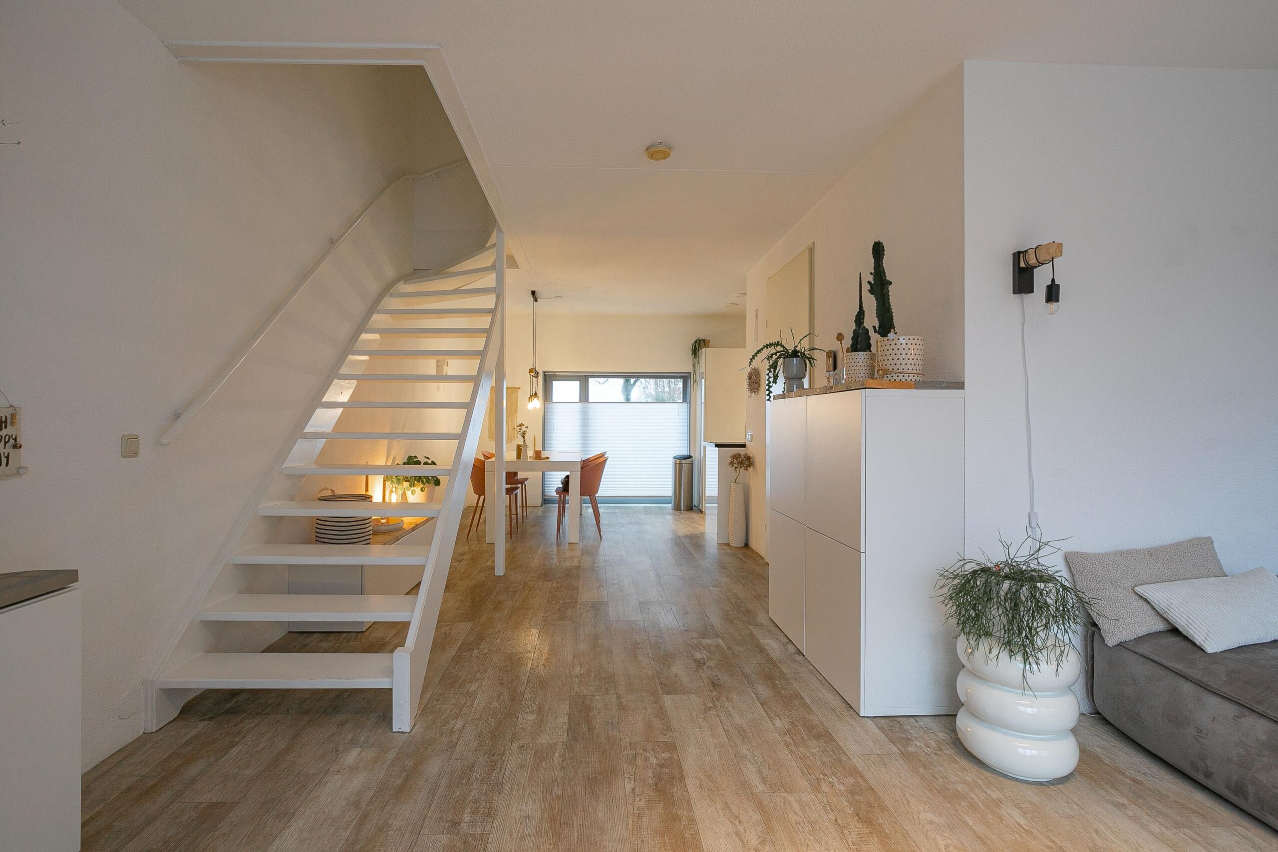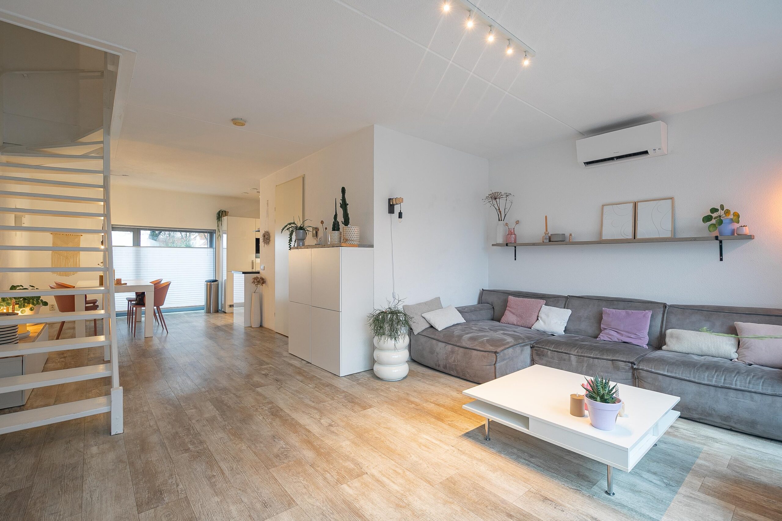 Sfeervolle woonkamer met PVC vloer, airco installatie, trap naar 1e verdieping en toegang naar de