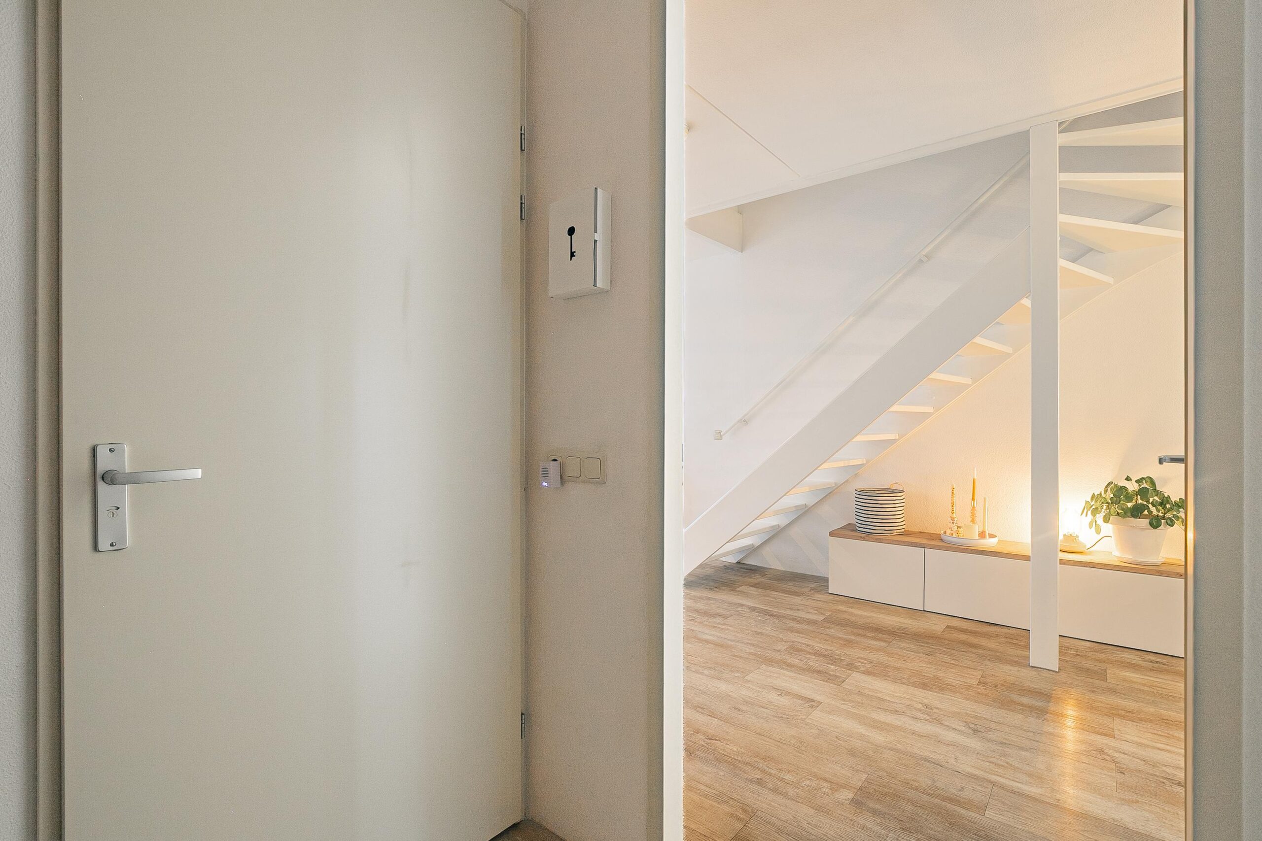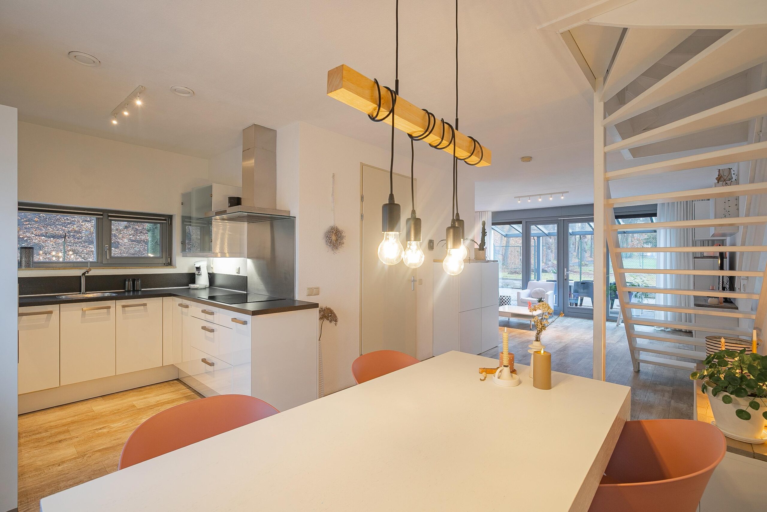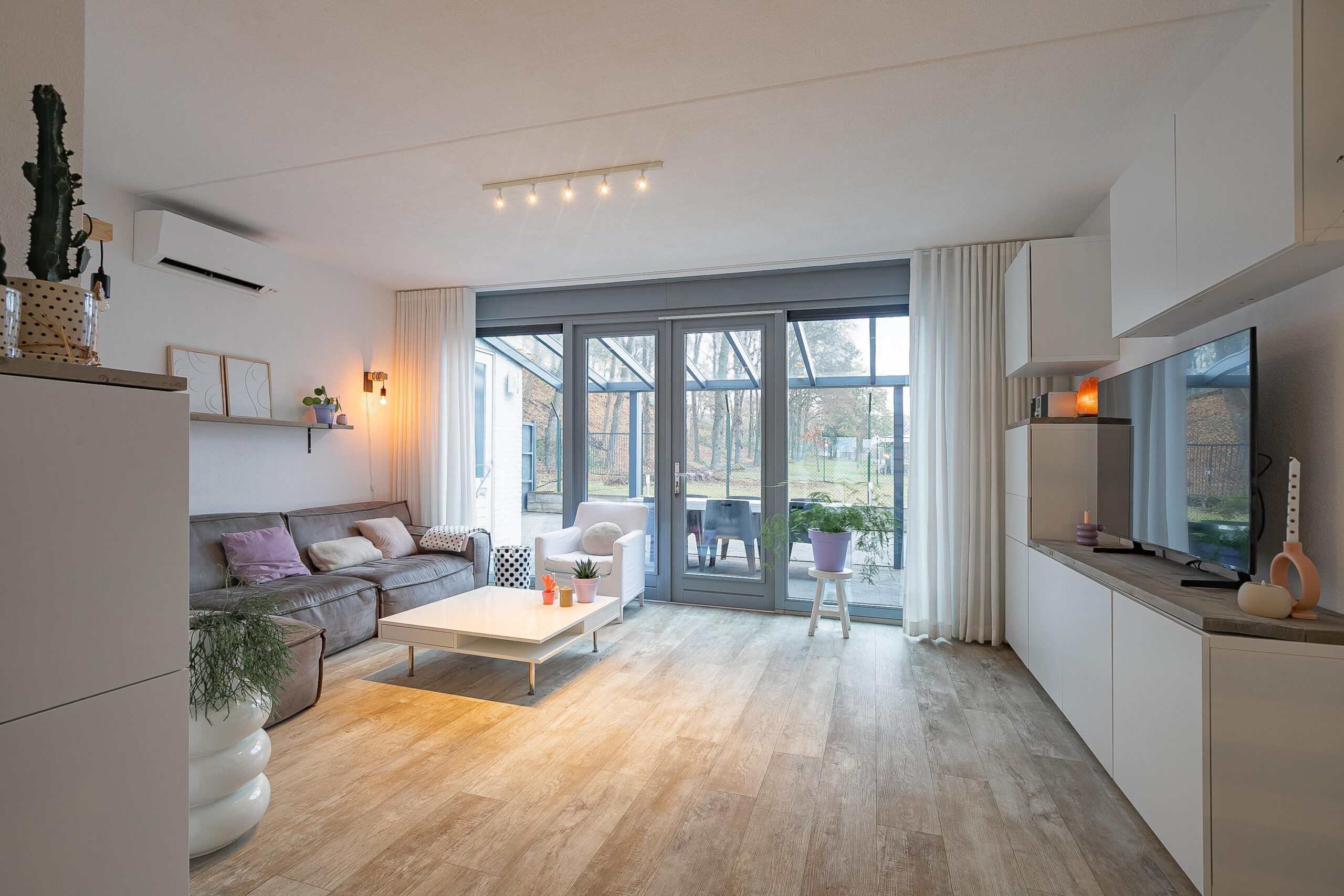 Sfeervolle woonkamer met PVC vloer, airco installatie, trap naar 1e verdieping en toegang naar de