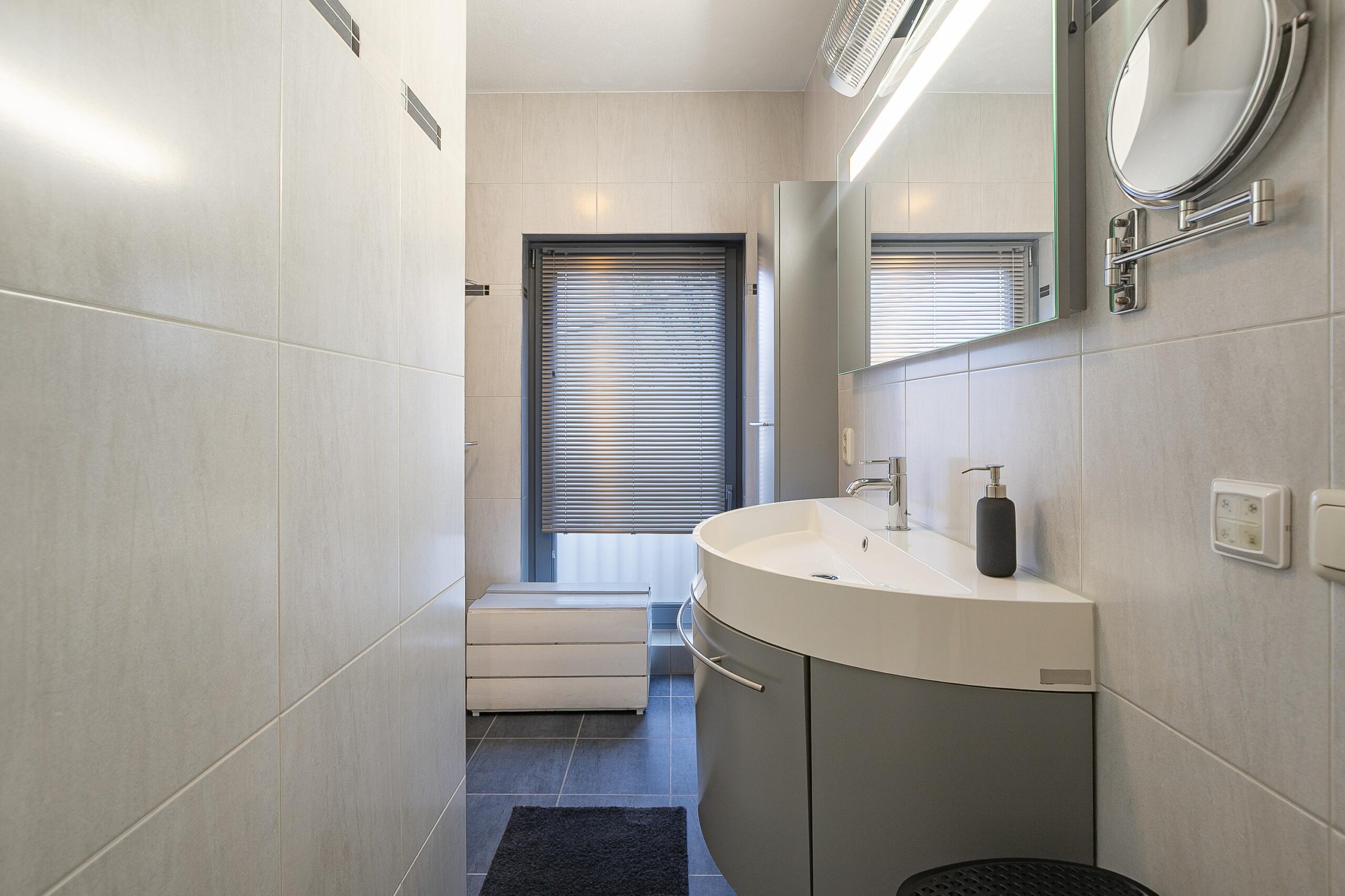 Geheel betegelde badkamer met inloop douche, badmeubel met aparte kast, design radiator en elektrische