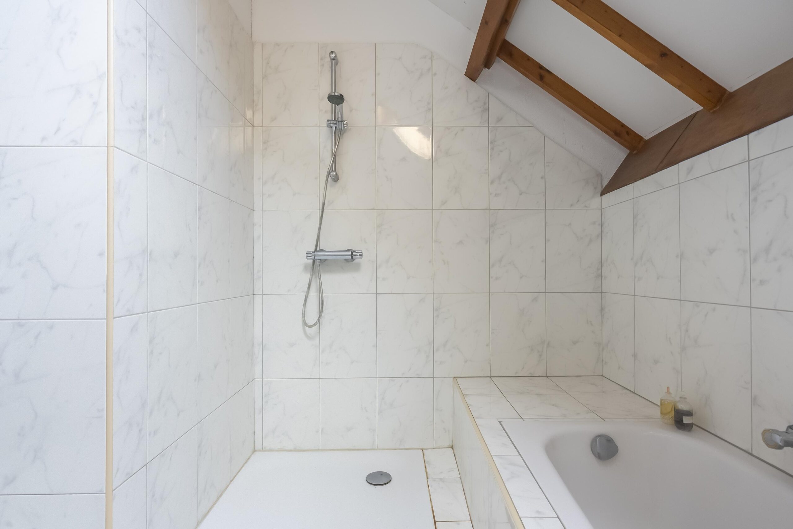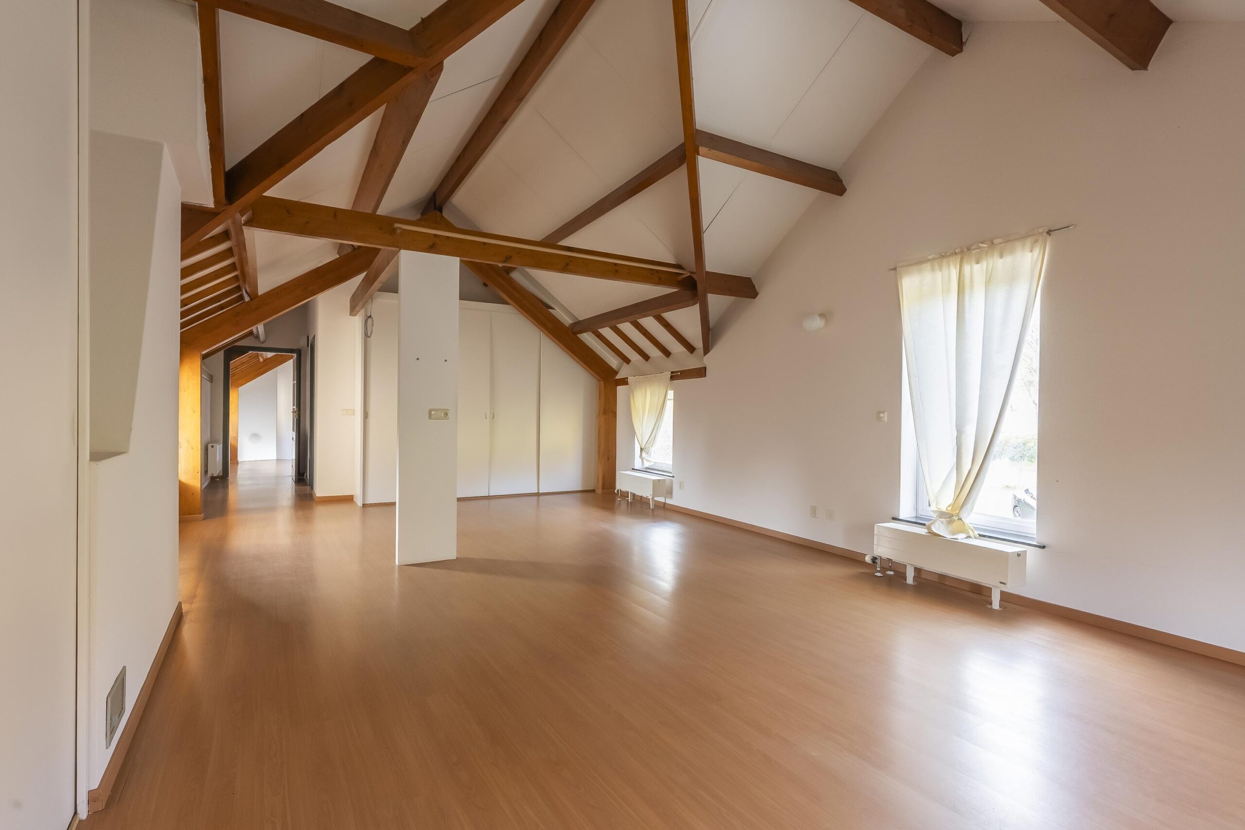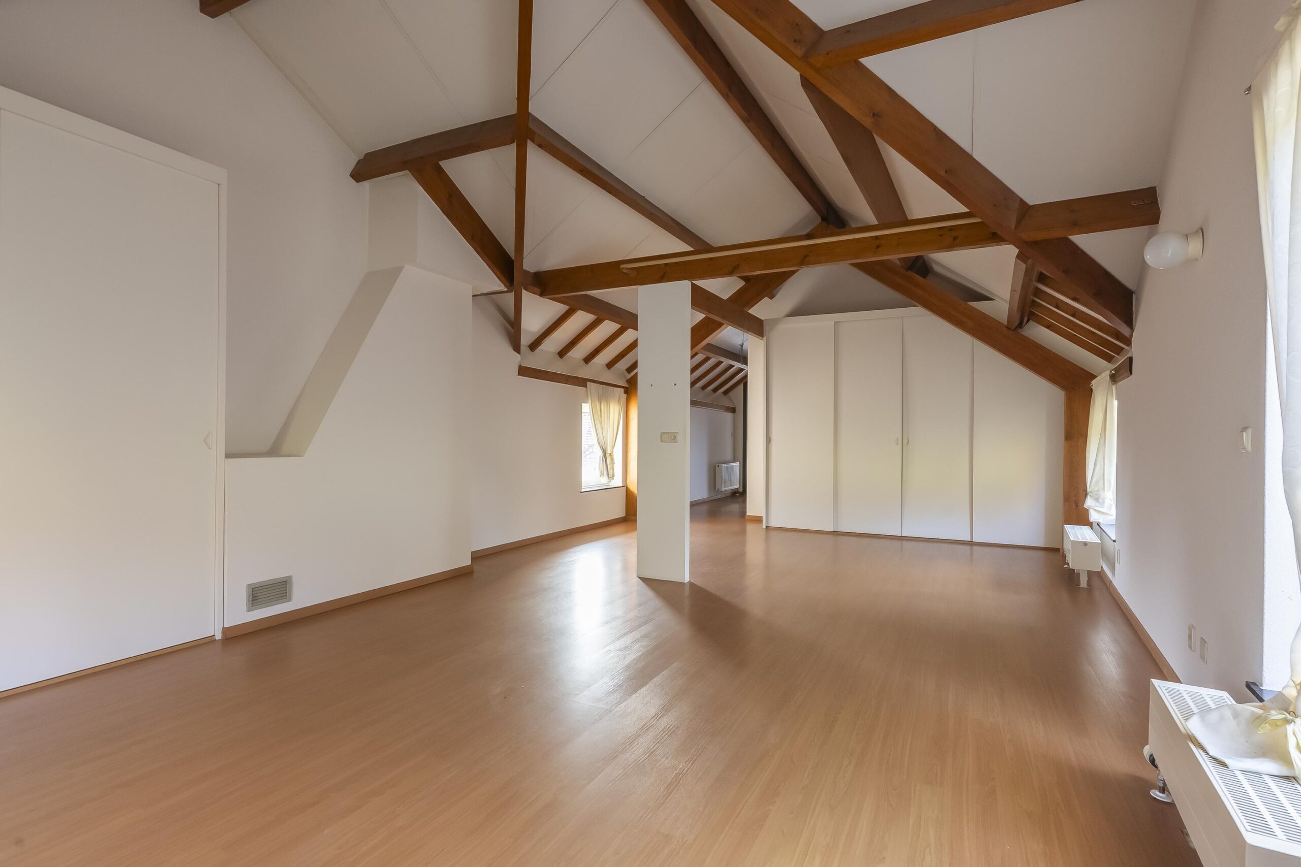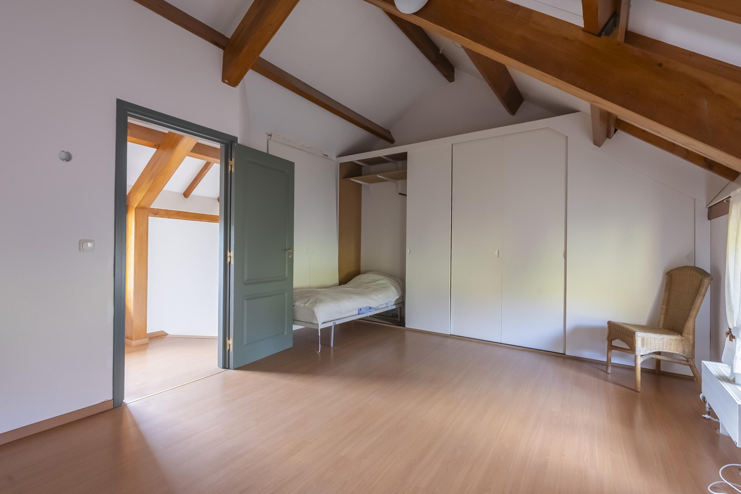 Aan het einde van de brede corridor bevinden zich twee zeer royale slaapkamers. Beide ruimtes hebben laminaatvloeren en vaste kastenwanden, terwijl de grootste slaapkamer desgewenst eenvoudig kan worden gesplitst. Zichtbare houten spanten en unidek dakisolatie geven de vertrekken een karakteristieke uitstraling. De ruim opgezette badkamer is grotendeels betegeld en voorzien van douche, ligbad, tweede vrijhangend toilet en wastafelmeubel met ingebouwde verlichting.