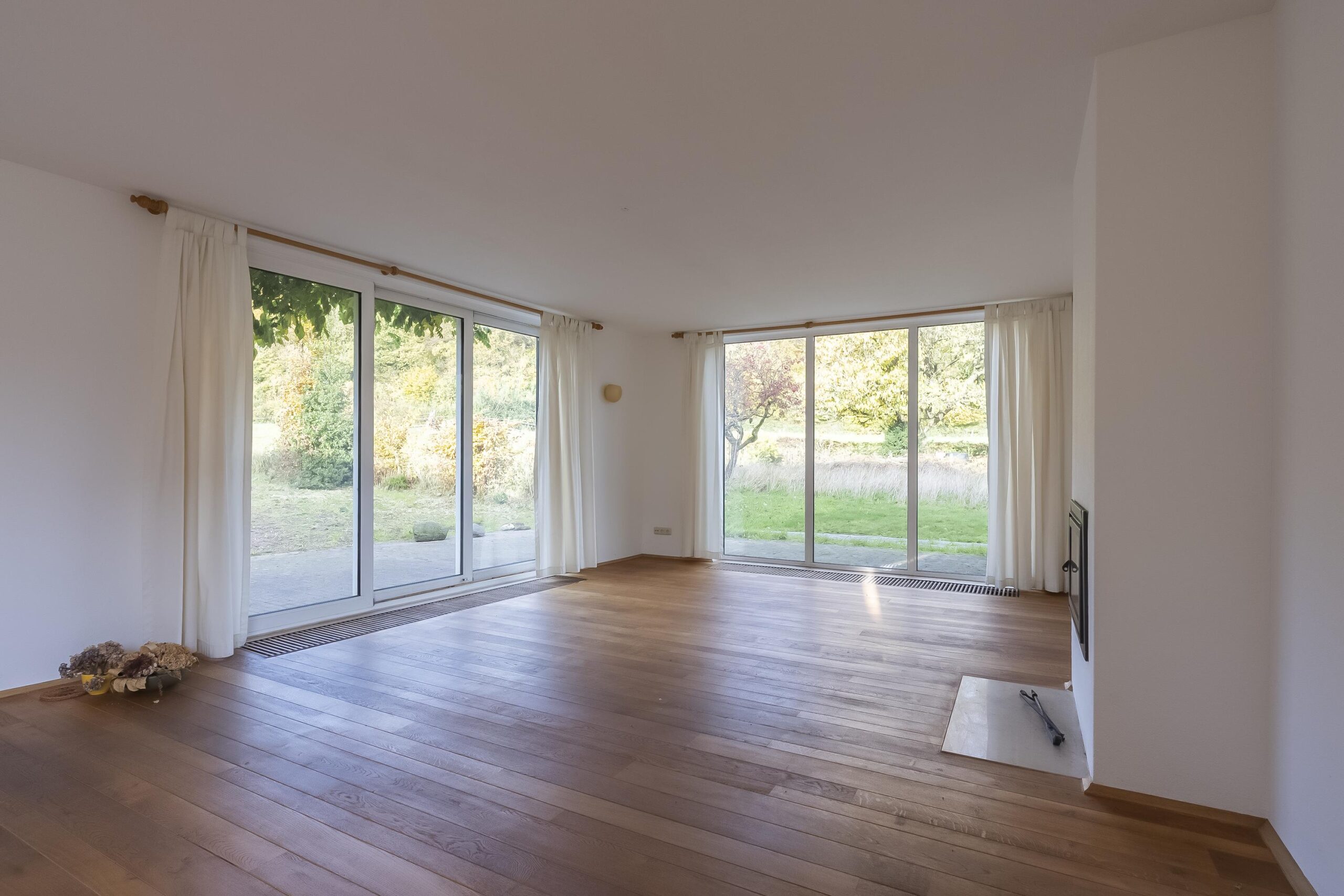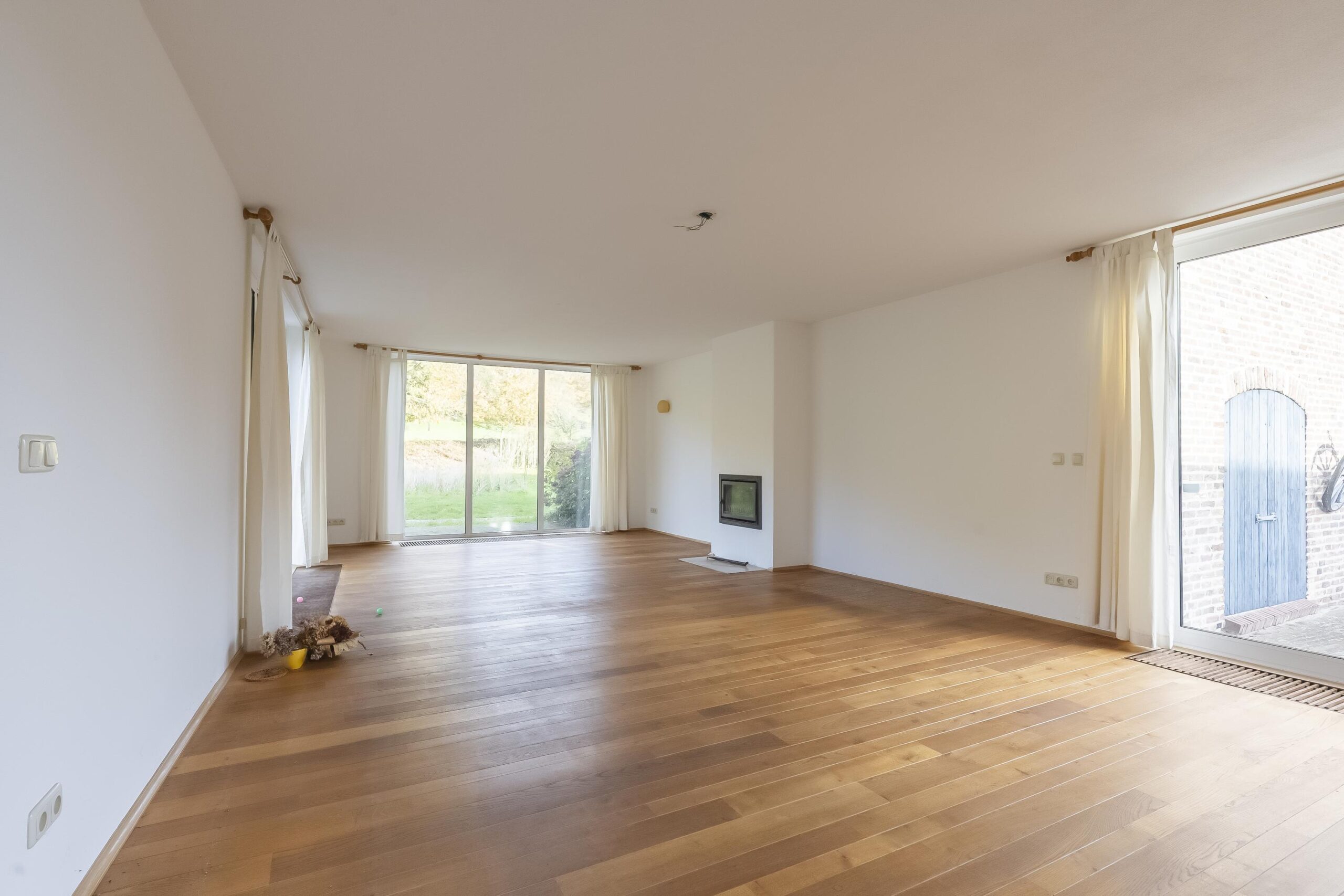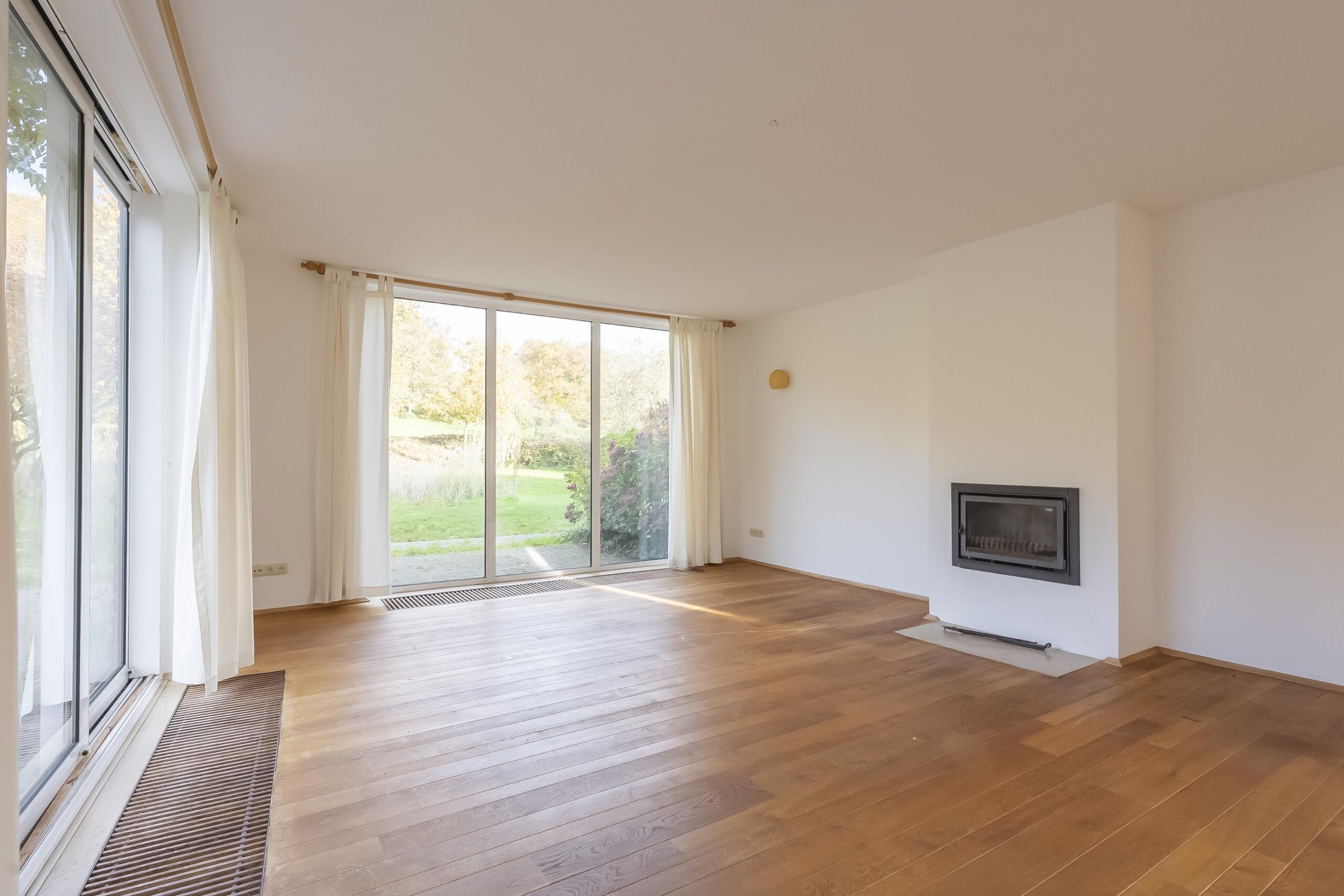 De hoofdwoning wordt betreden via een ruime hal met beukenhouten trap en een modern betegeld toilet met fontein. Karakteristieke dubbele deuren geven toegang tot de riante living, waar grote raampartijen en twee schuifpuien zorgen voor royale lichtinval en een weids uitzicht op bos en omliggende weilanden. De woonkamer is voorzien van een massief eikenhouten vloer en een sfeervolle open haard met inzet-houtkachel. Eén schuifpui opent naar het terras aan de zijkant, de andere naar de tweede binnenplaats.