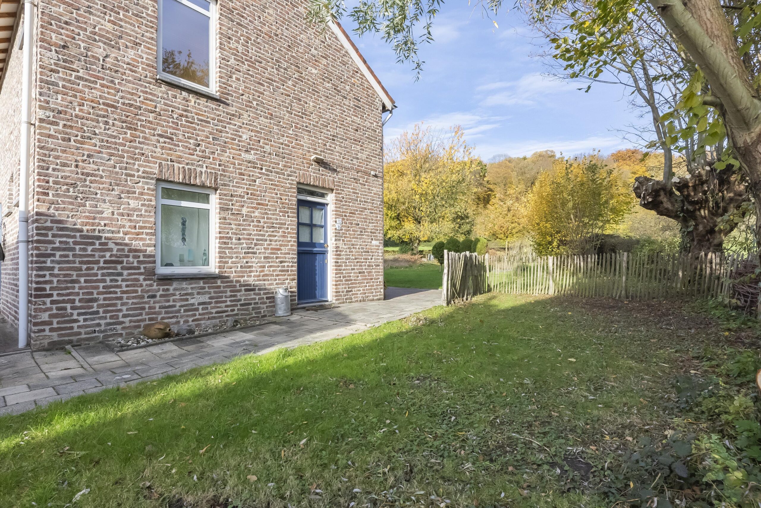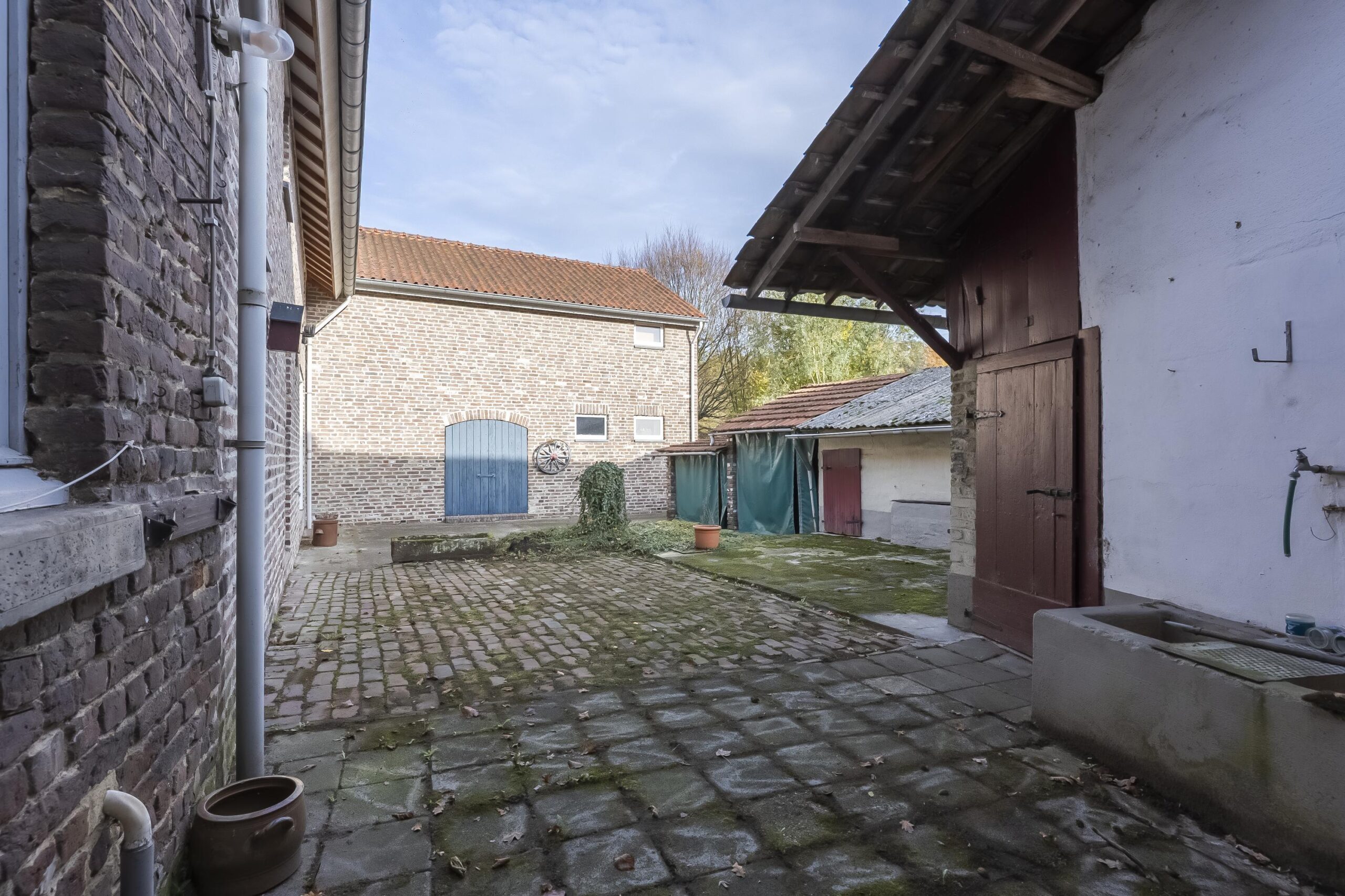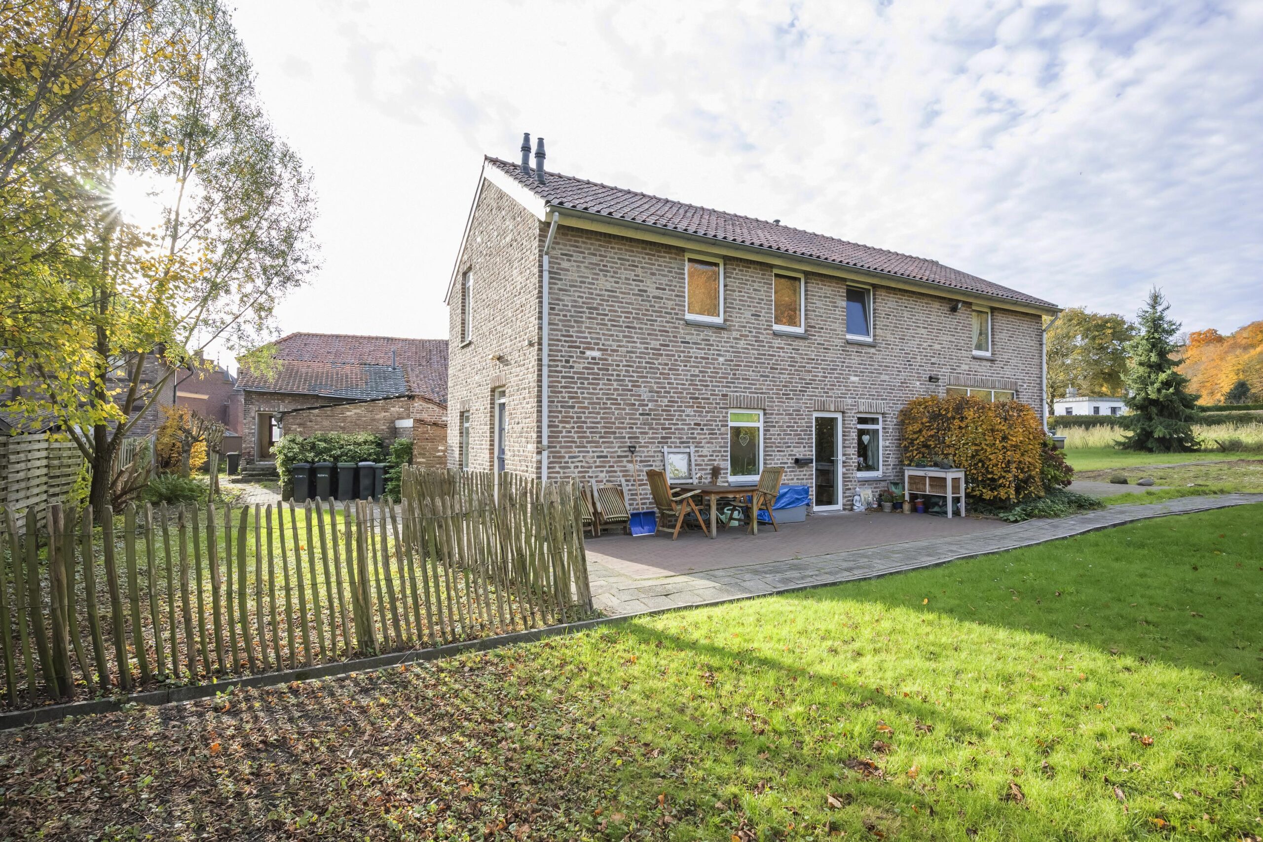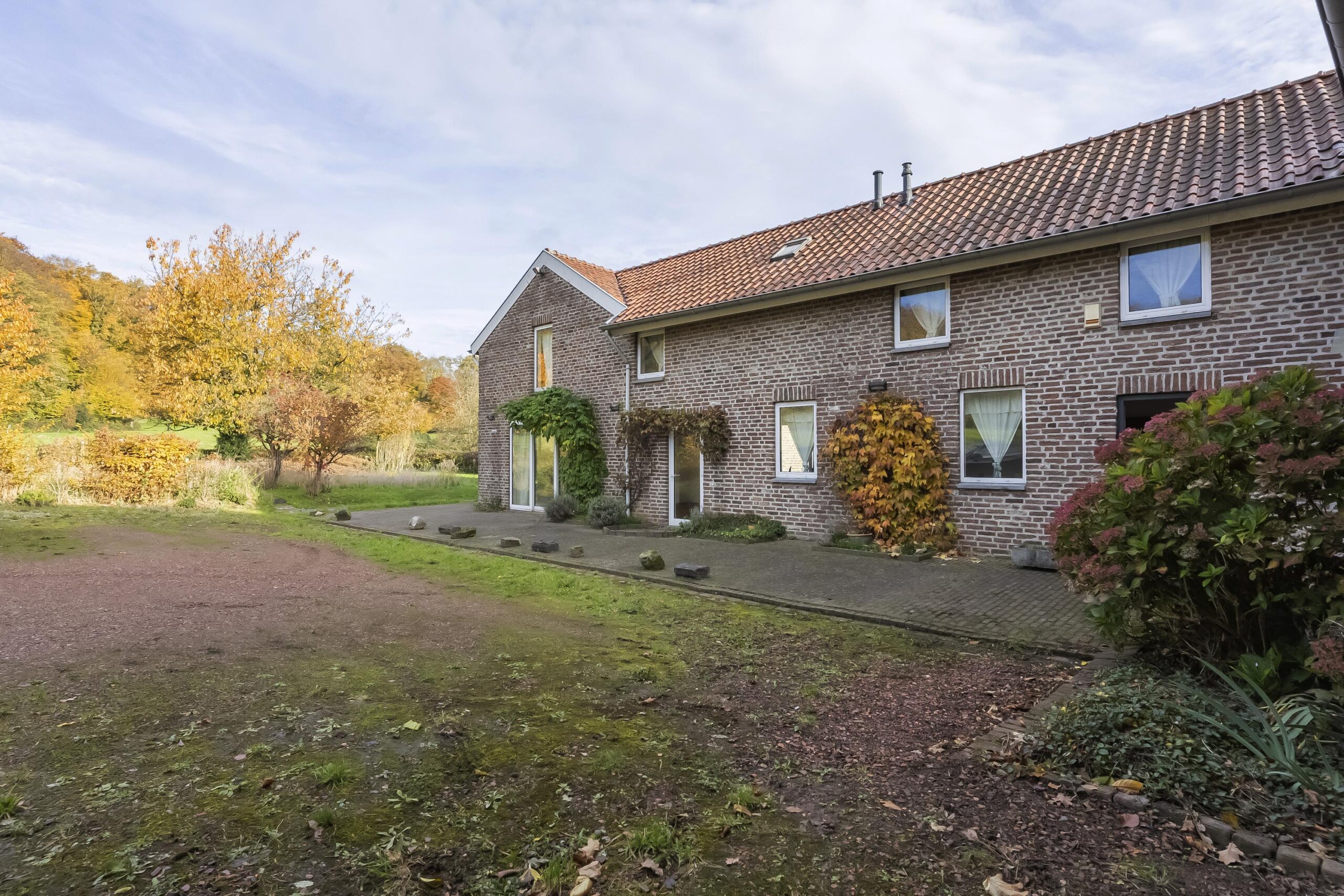 Het gehele complex wordt omgeven door uitbundig groen en beschikt over twee karaktervolle binnenplaatsen die als natuurlijke verbindingen tussen de verschillende gebouwen fungeren. De tuin strekt zich rondom het complex uit en gaat vloeiend over in de omliggende natuur. Vanaf diverse plekken ontvouwt zich een panoramisch uitzicht over open landerijen en de uitgestrekte bossen van Rimburg, wat een gevoel van ruimte, rust en vrijheid creëert. Het perceel beslaat circa 2.475 m² en biedt een directe verbondenheid met het landschap.