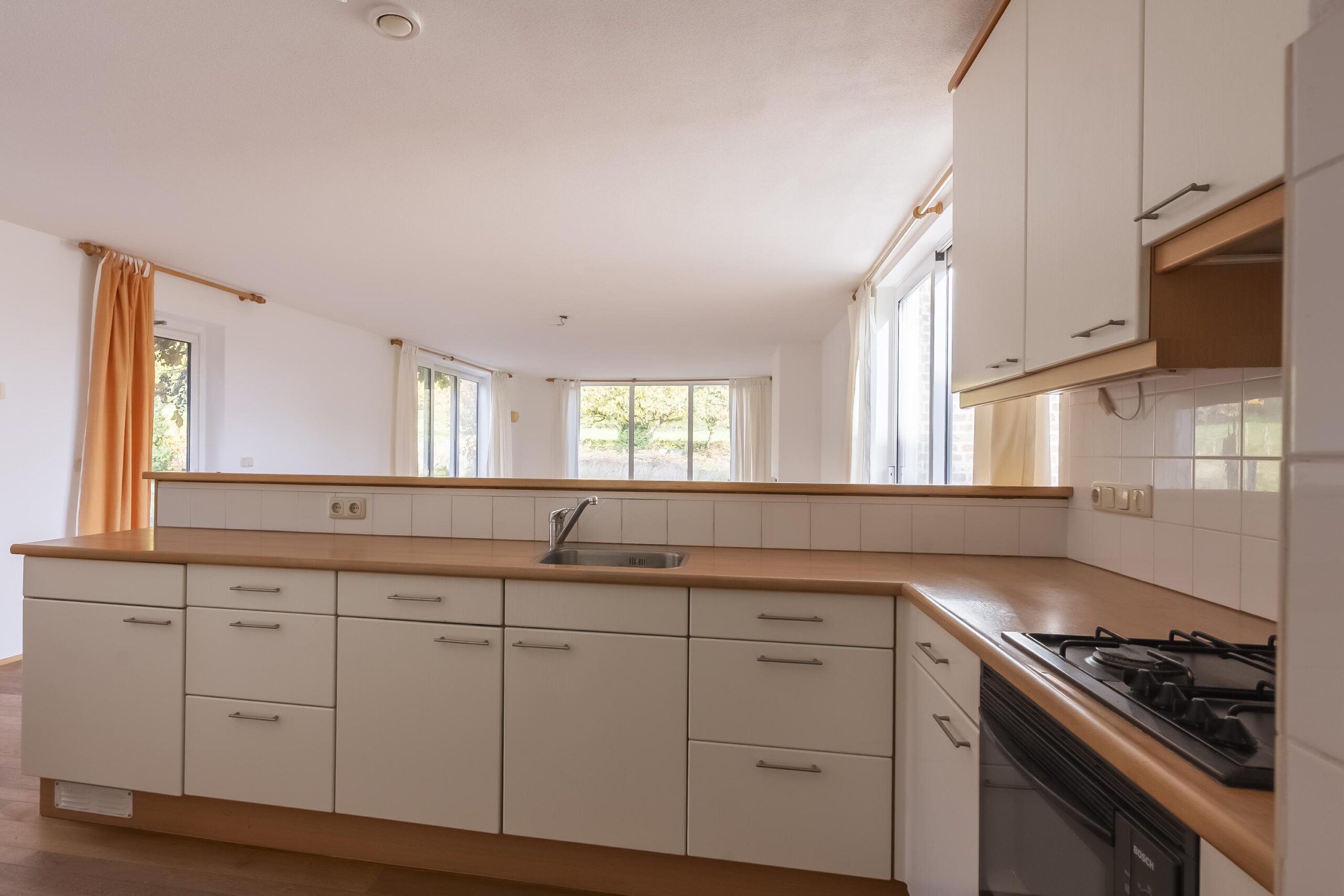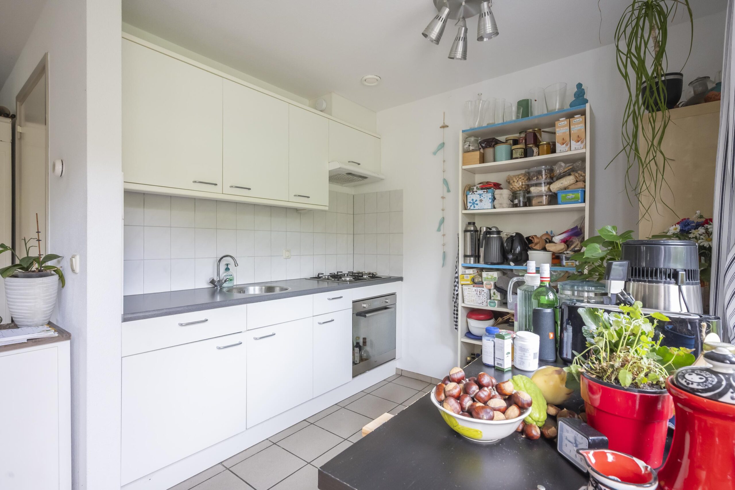 De betegelde open keuken is uitgerust met een eenvoudige maar functionele keukeninstallatie. Aangrenzend ligt de bijkeuken met plavuizenvloer, witgoedaansluiting, extra toegang tot de binnenplaats en de combi cv-ketel (Remeha, huur – Volta).