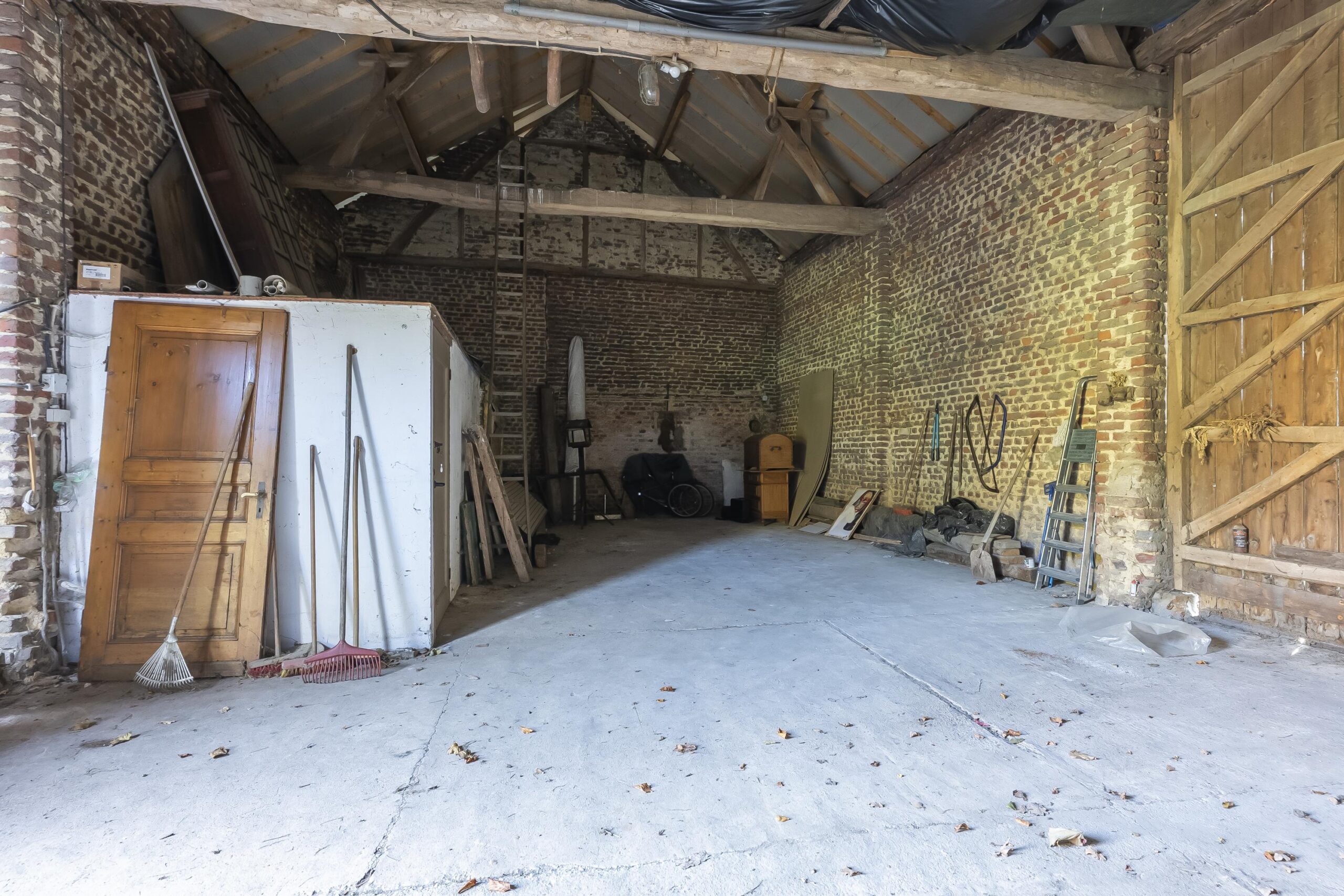 De voormalige hooischuur, gelegen naast de hoofdwoning, wordt gekenmerkt door imposante dubbele boerderijpoorten en fraaie eiken spanten. In de ruimte zijn een toiletgroep en douche aanwezig. Dankzij de vorm, hoogte en authentieke uitstraling biedt deze schuur uitstekende mogelijkheden voor transformatie tot woning, atelier of gastenverblijf, onder voorbehoud van benodigde vergunningen.