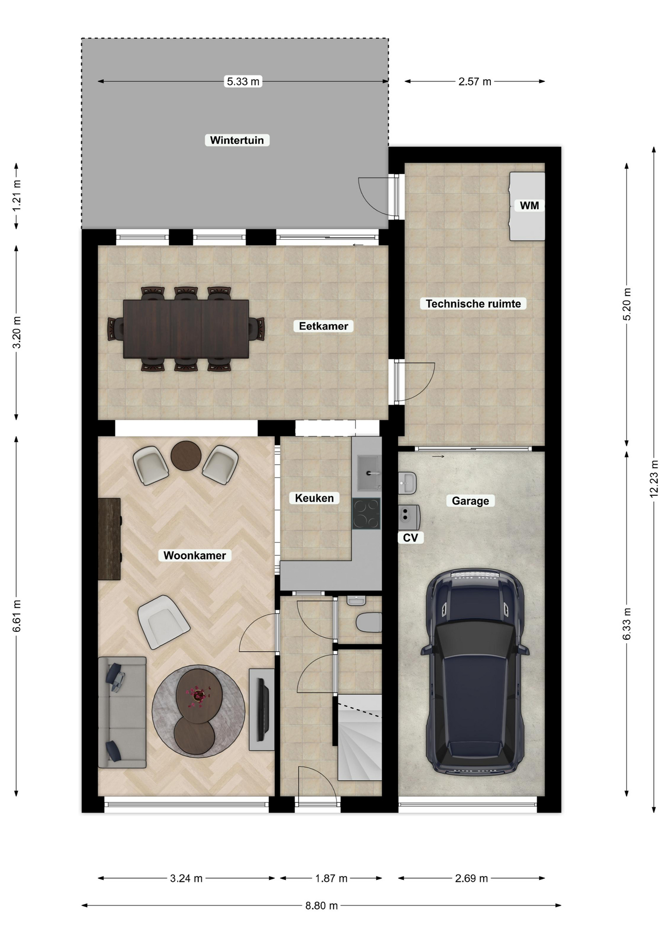 De garage met sectionaalpoort meet circa 6,33 m x 2,69 m en heeft een hoogte van 2,60 m.