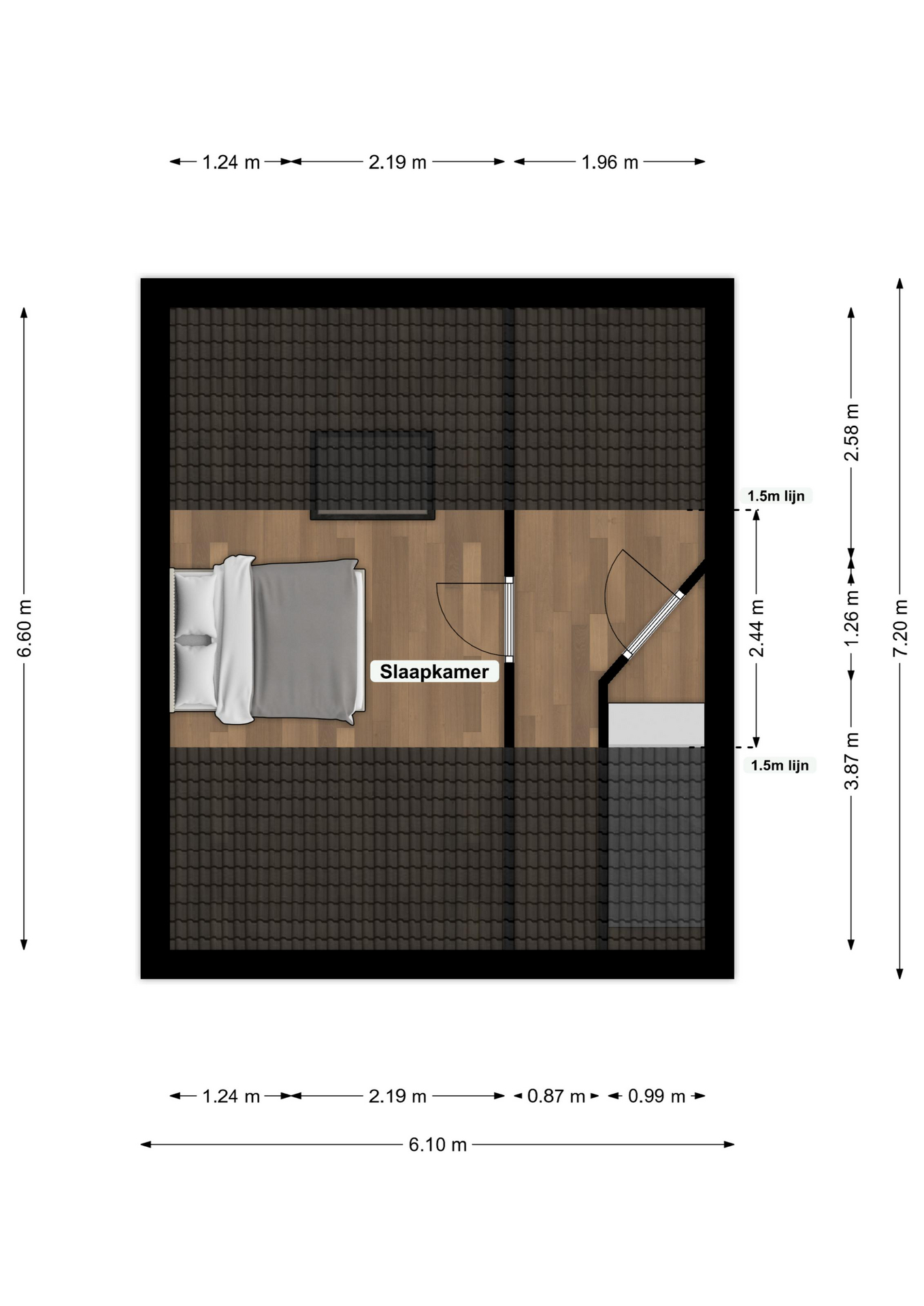 De slaapkamer is ca 5.40m x 3.44m