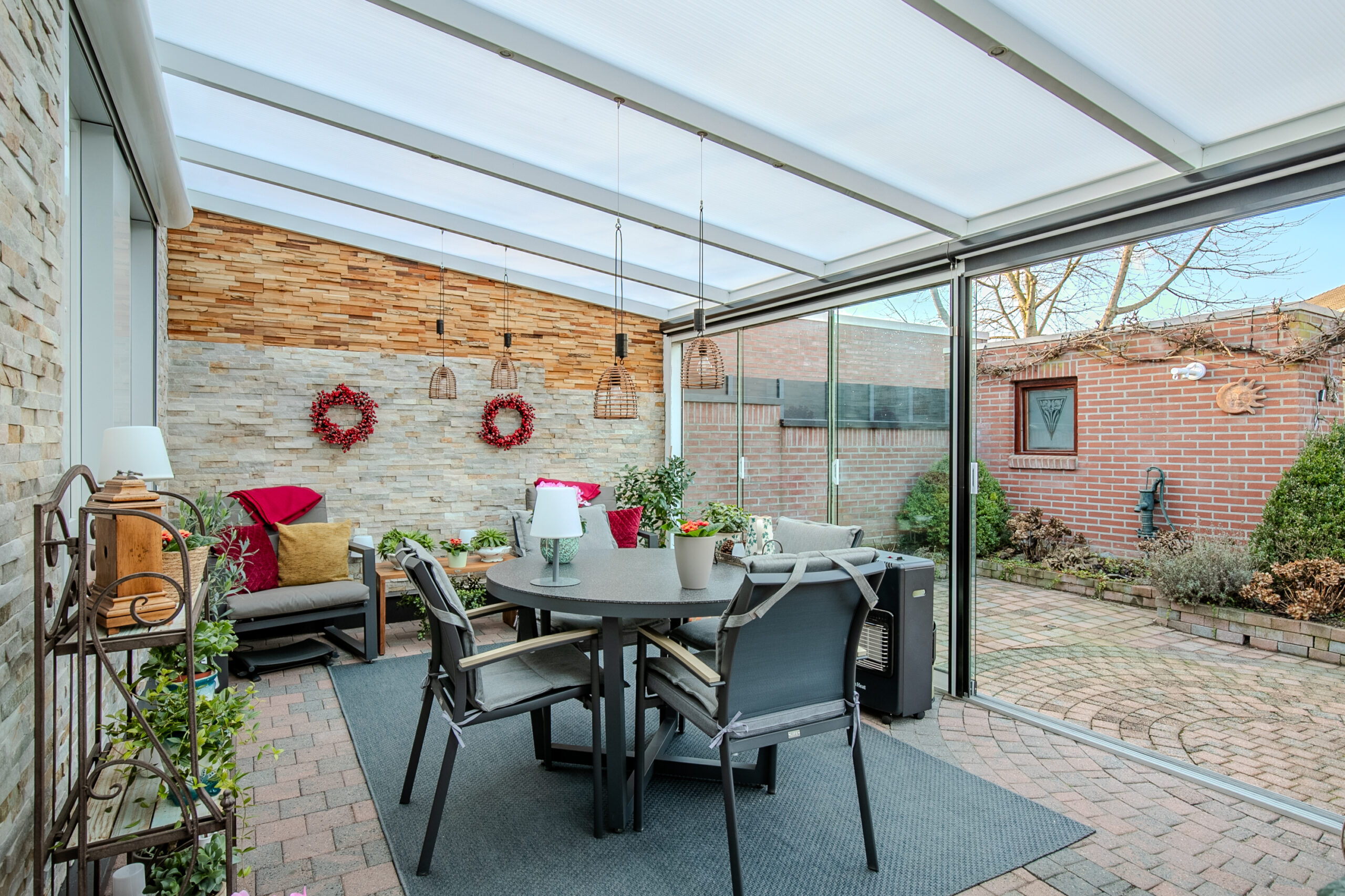 De middels glazen schuifdeuren afgesloten serre/wintertuin heeft een oppervlakte van circa 20 m².