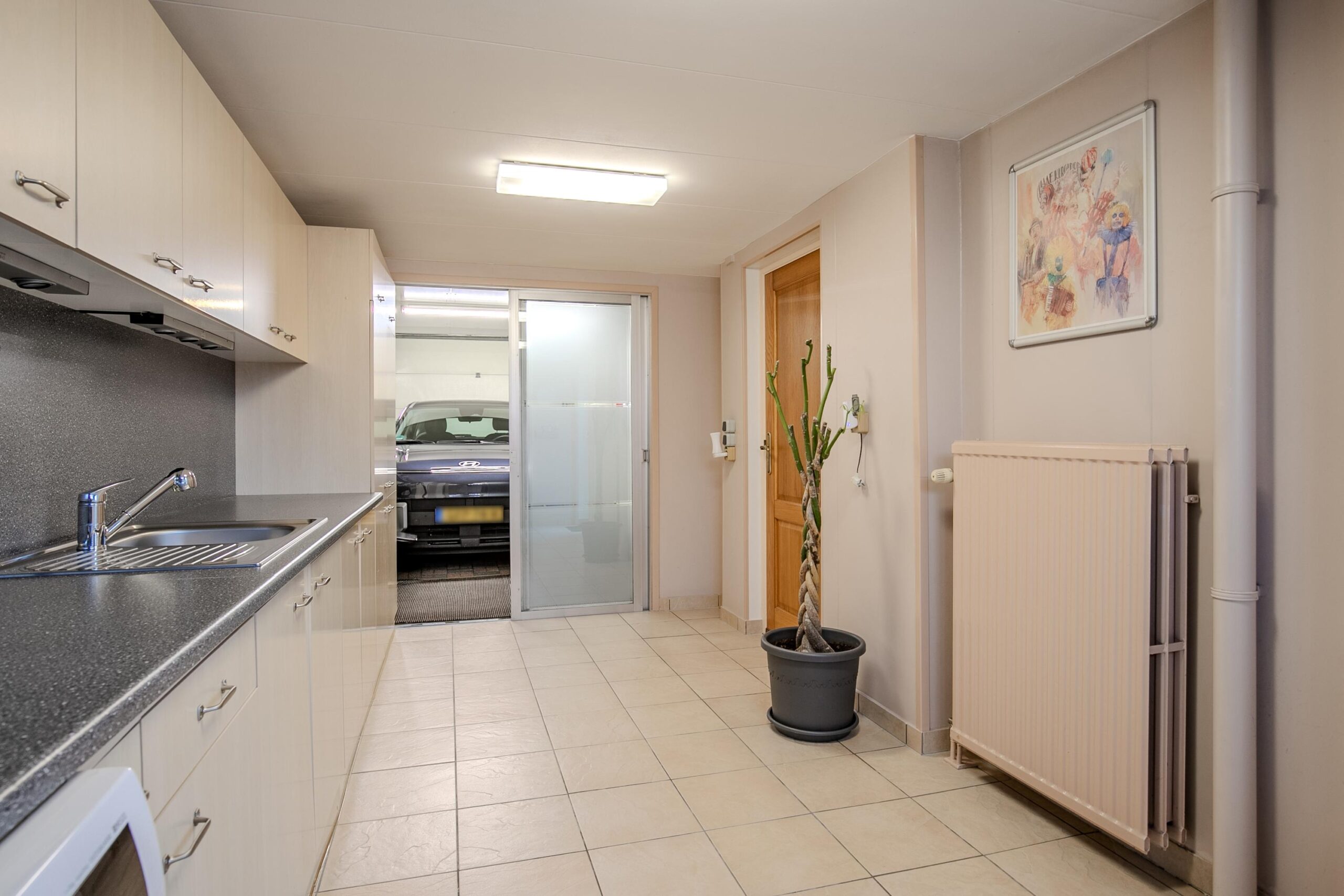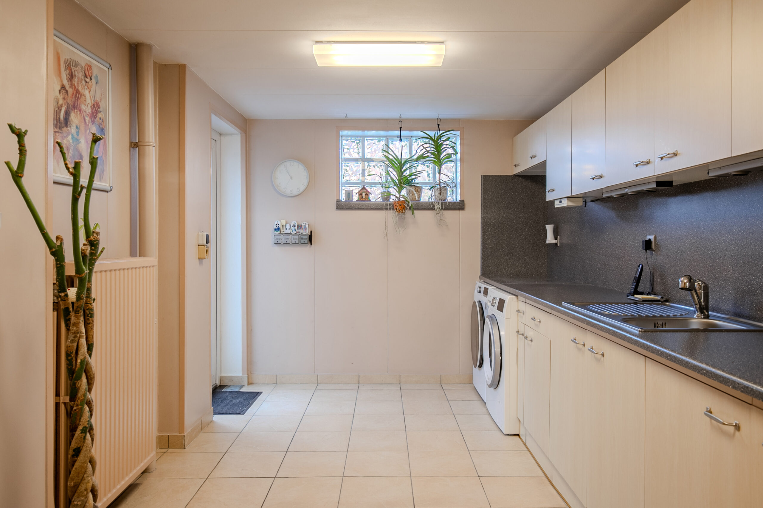 Vanuit de eetkamer heeft u toegang tot de ruime bijkeuken en de garage. De bijkeuken is circa 13,5 m² groot en beschikt over een aansluiting voor de wasmachine en een keukenblok.
