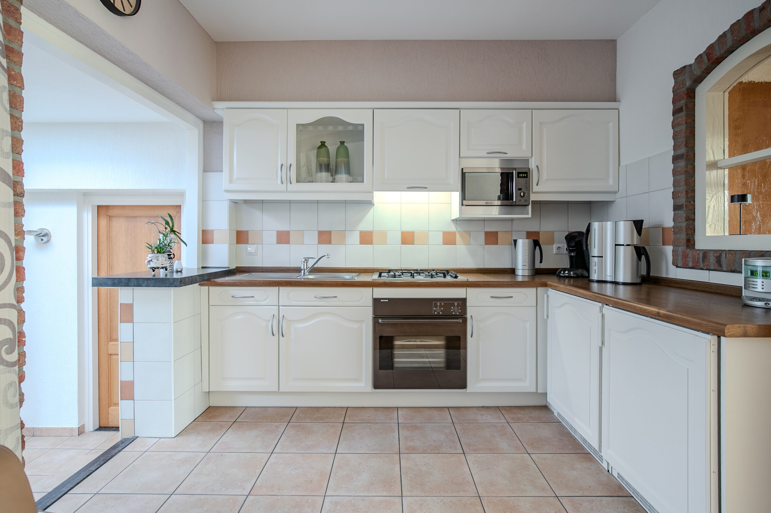 De hoekopgestelde keukeninrichting is uitgerust met de volgende apparatuur: 4-pits gaskookplaat, afzuigkap, oven, magnetron, koelkast en diepvries.