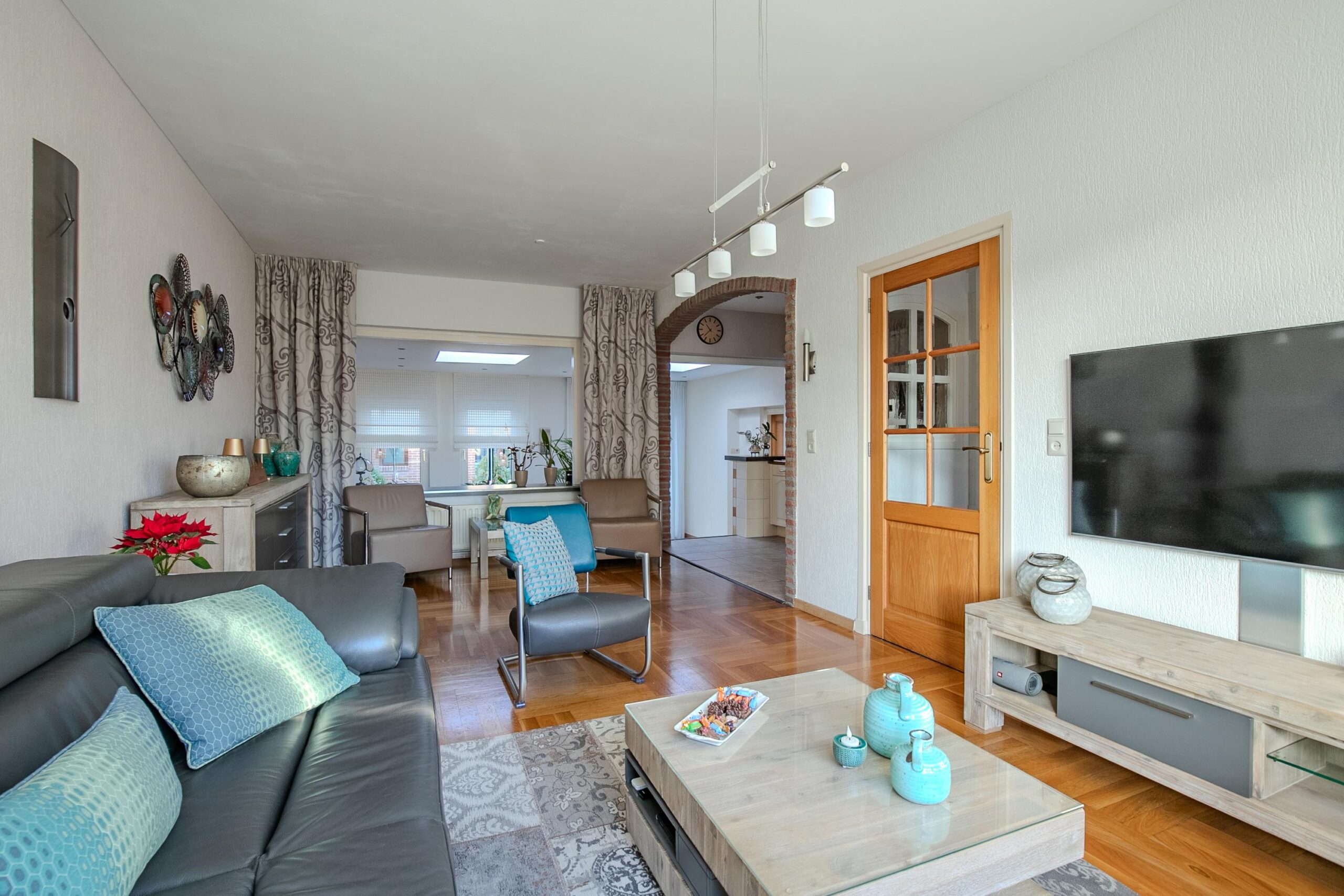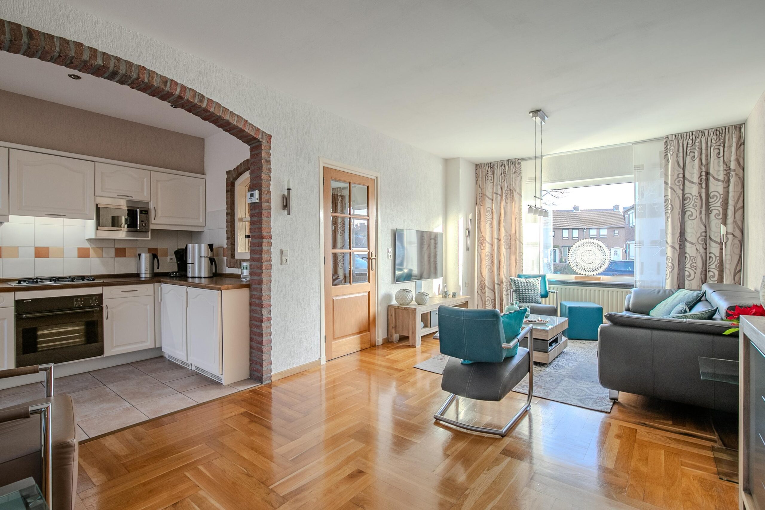 De woonkamer en keuken zijn samen circa 27 m² groot en beschikken over grote raampartijen, wat zorgt voor een prettige lichtinval. De woonkamer is voorzien van een parketvloer, terwijl de keuken en de met enkele treden lager gelegen eetkamer zijn afgewerkt met een tegelvloer. De eetkamer heeft een oppervlakte van circa 17 m².