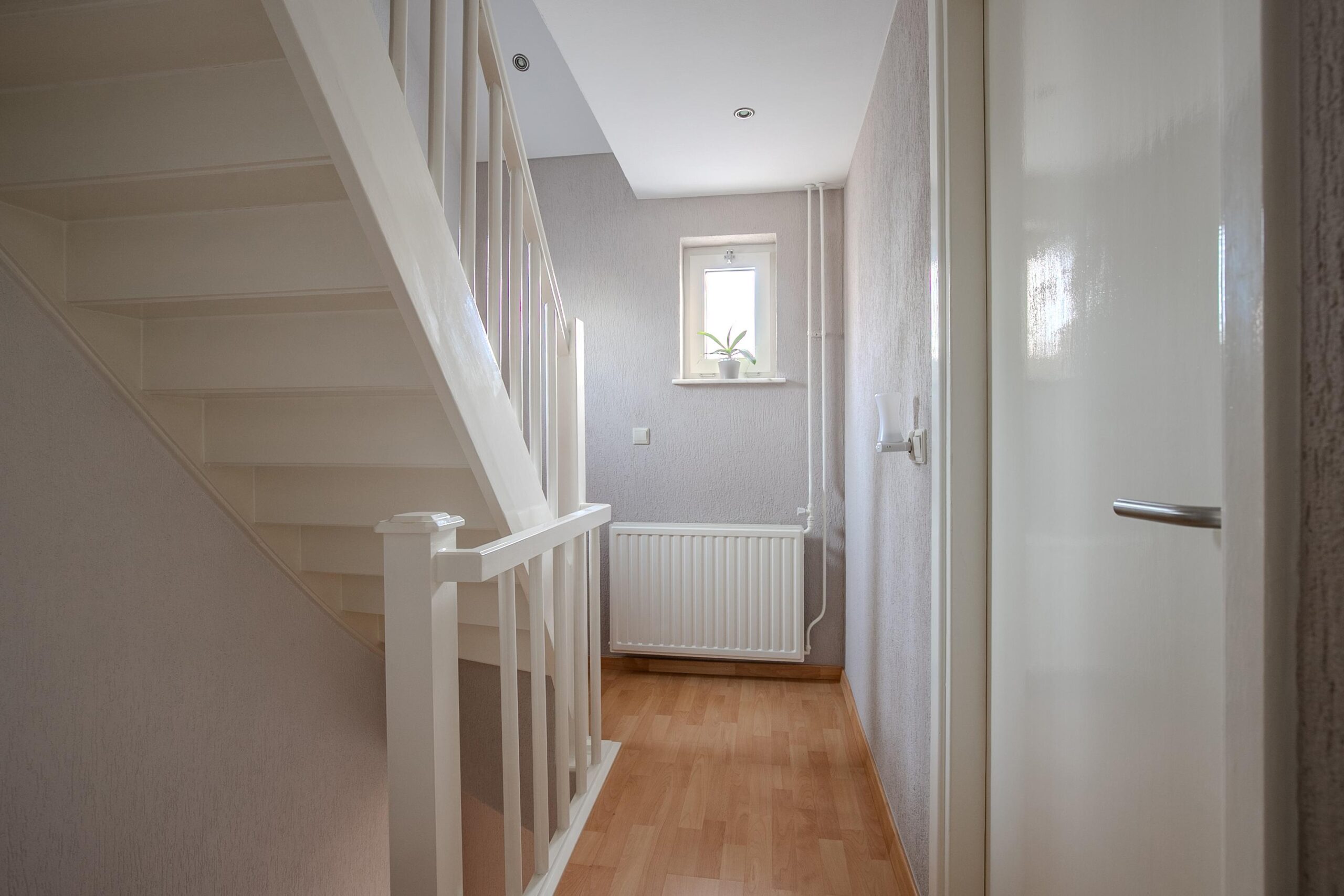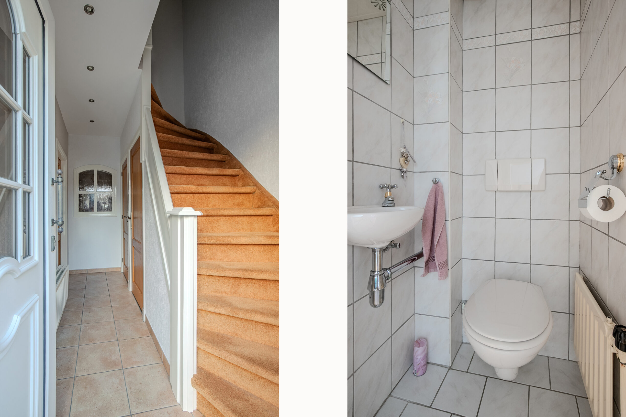 Via de hal/entree met meterkast, trapopgang en geheel betegelde toiletruimte met zwevend toilet en fonteintje, bereikt u de woonkamer en de open keuken.