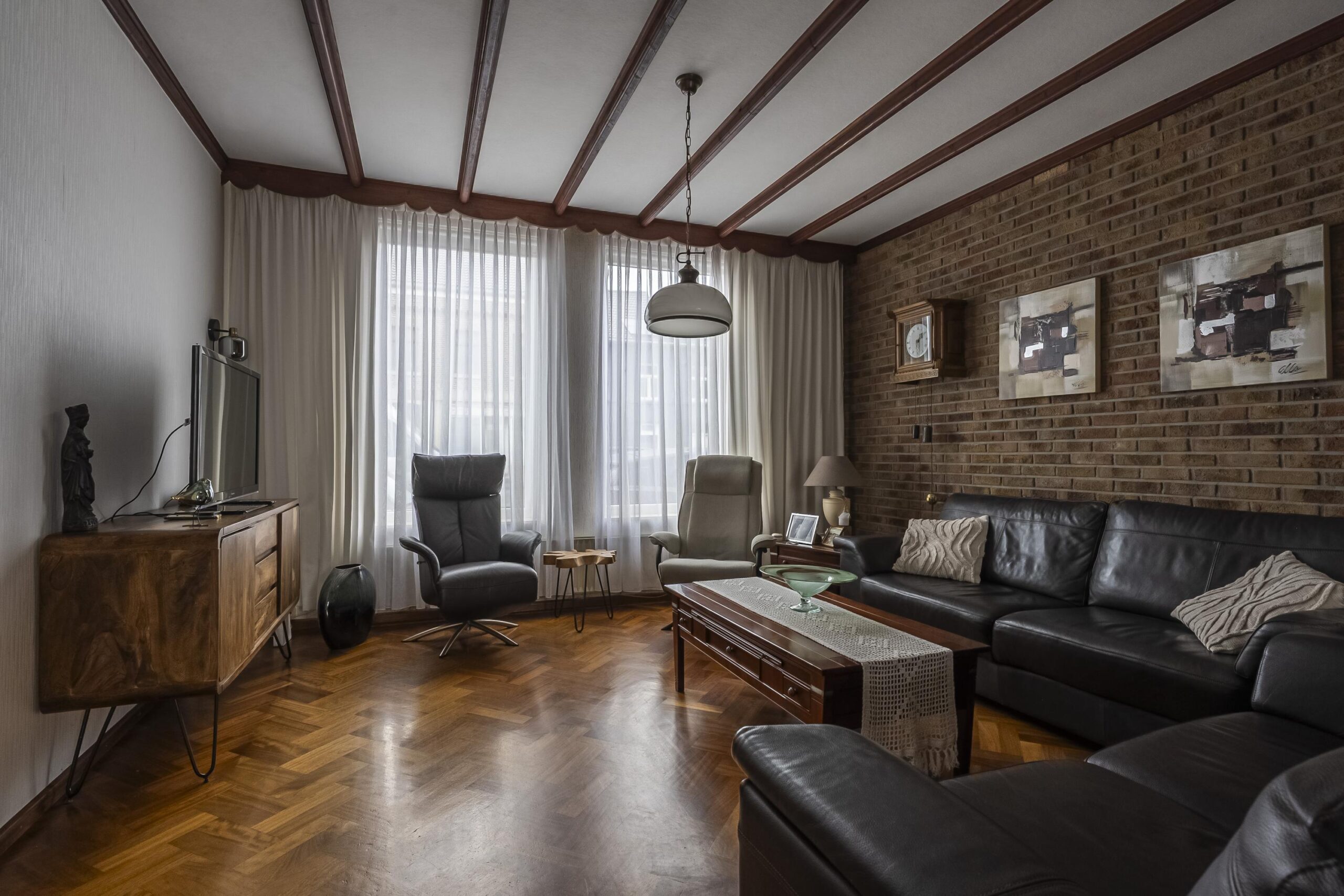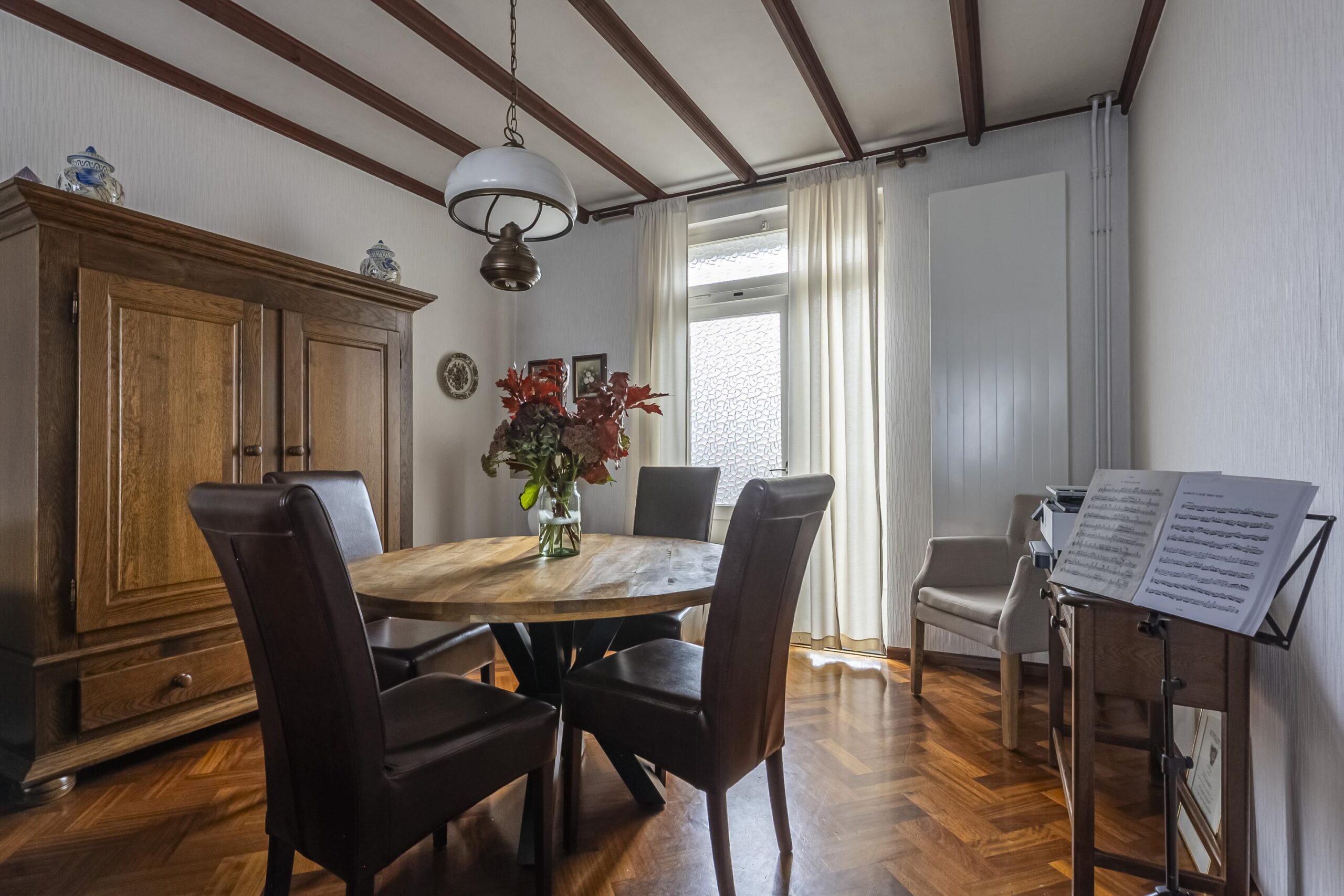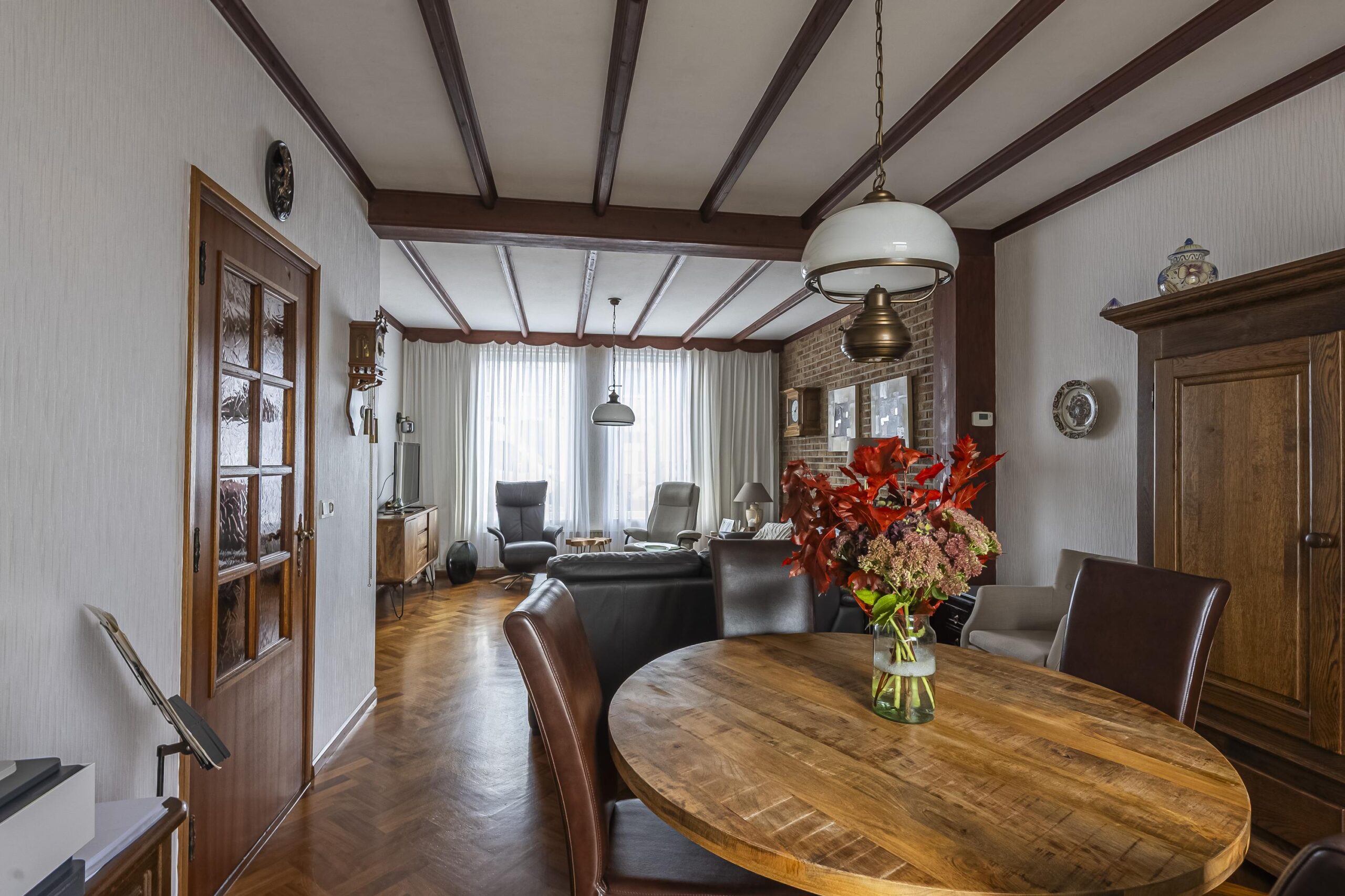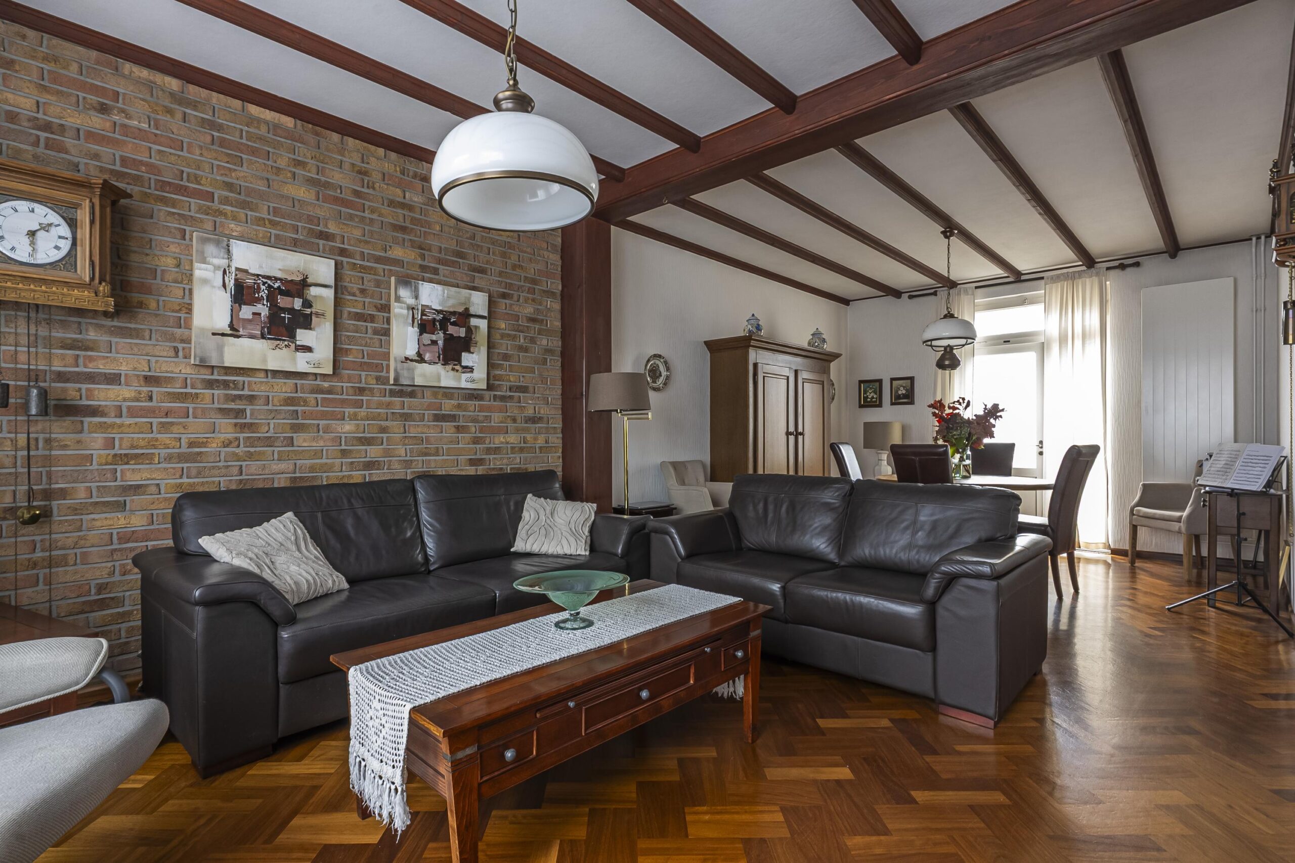 De sfeervolle woonkamer is voorzien van een parketvloer en openslaande deur naar de tuin.