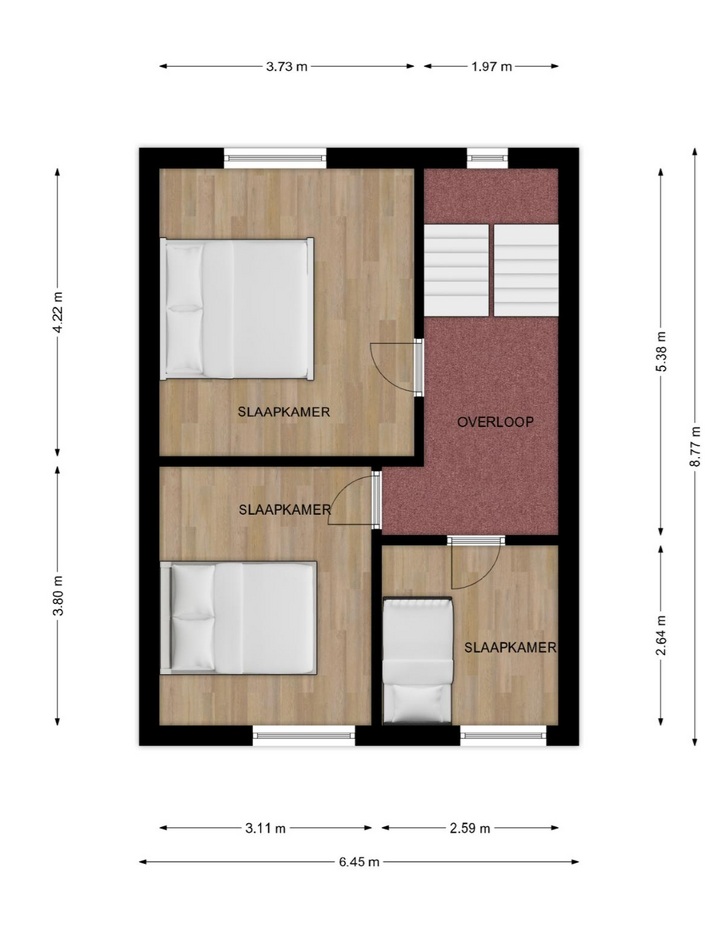 De slaapkamers zijn respectievelijk groot ca. 16 m², 12 m² en 7 m².