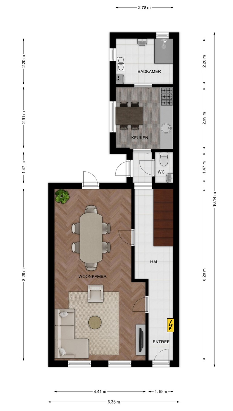 Middels de hal/entree met trapopgang, meterkast en deels betegelde toiletruimte met staand toilet komt u in de woonkamer.