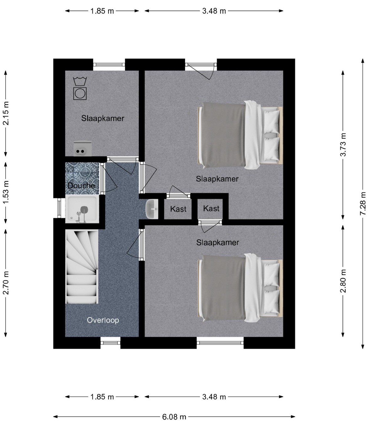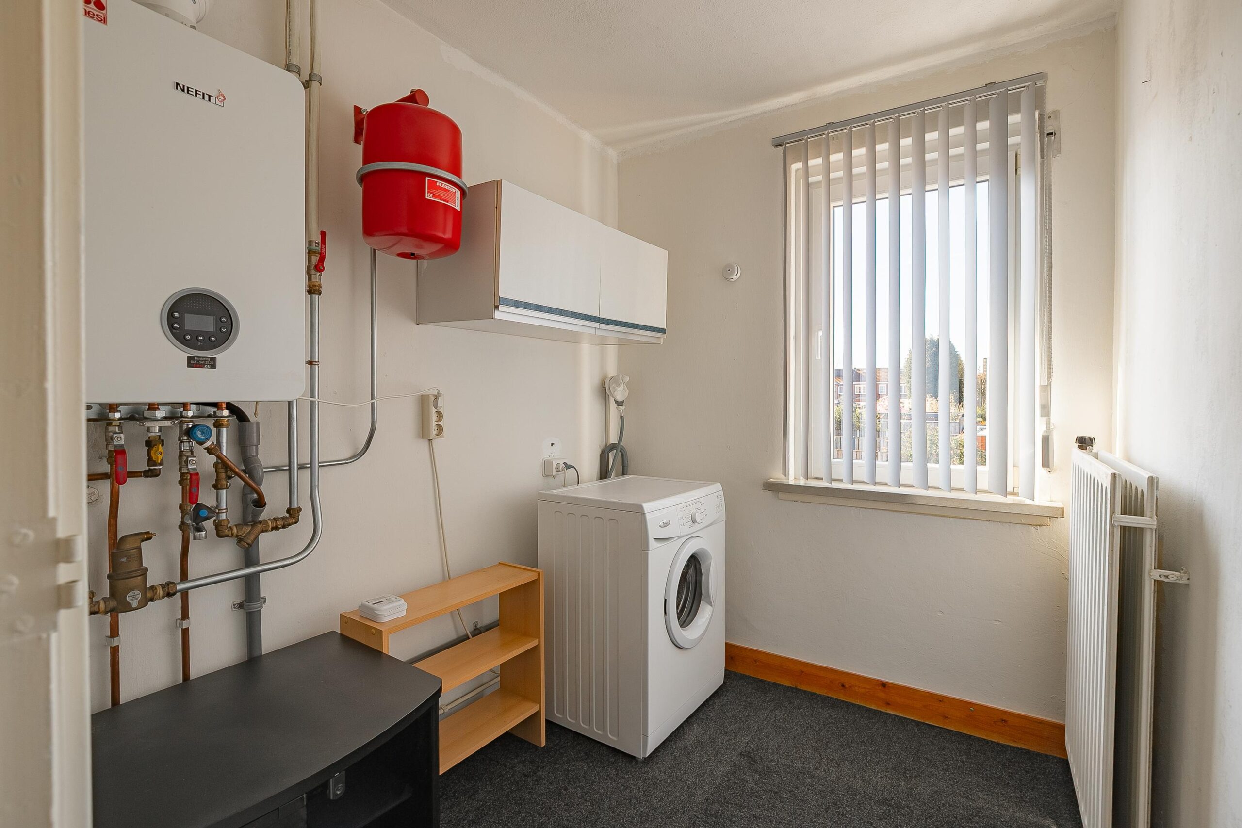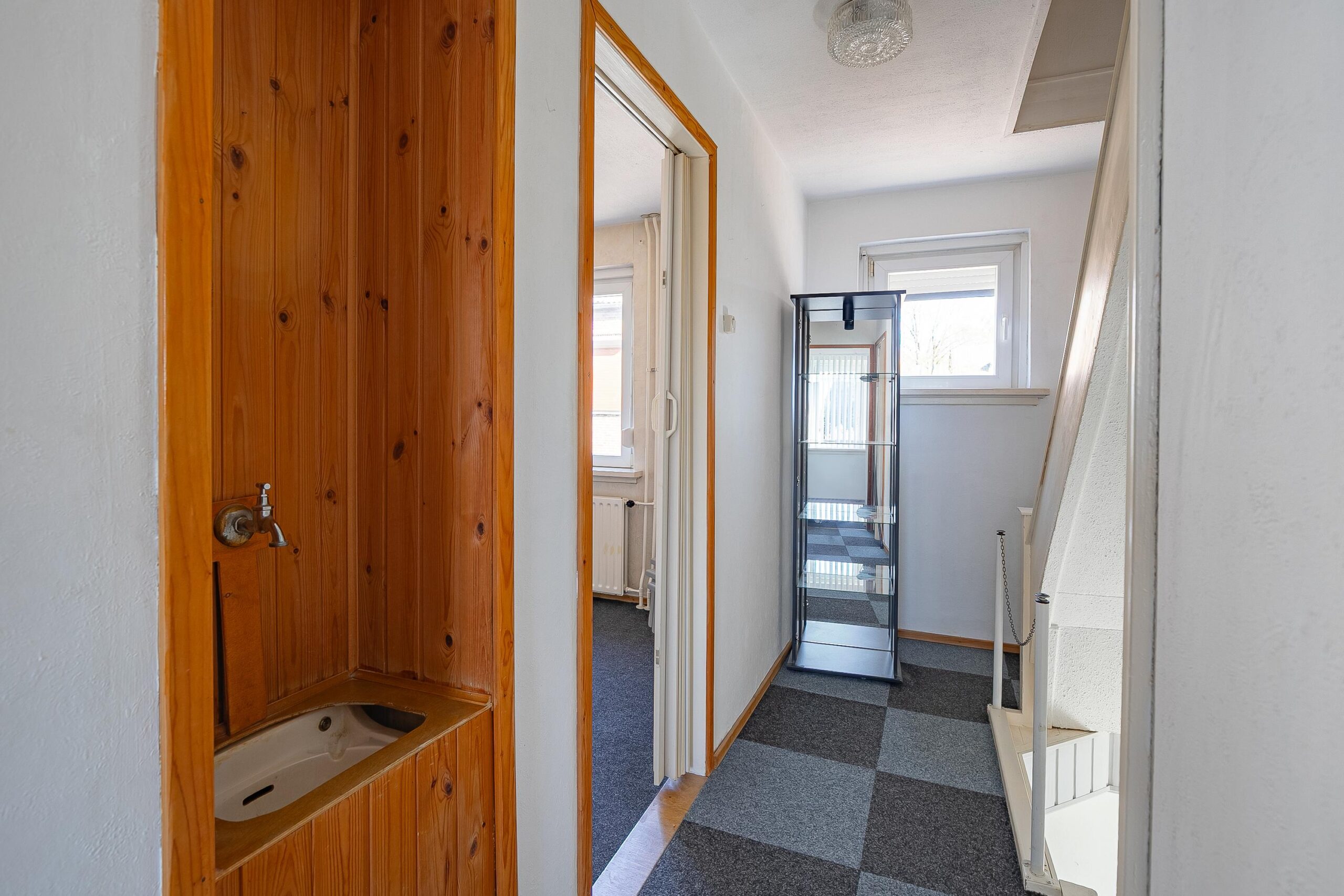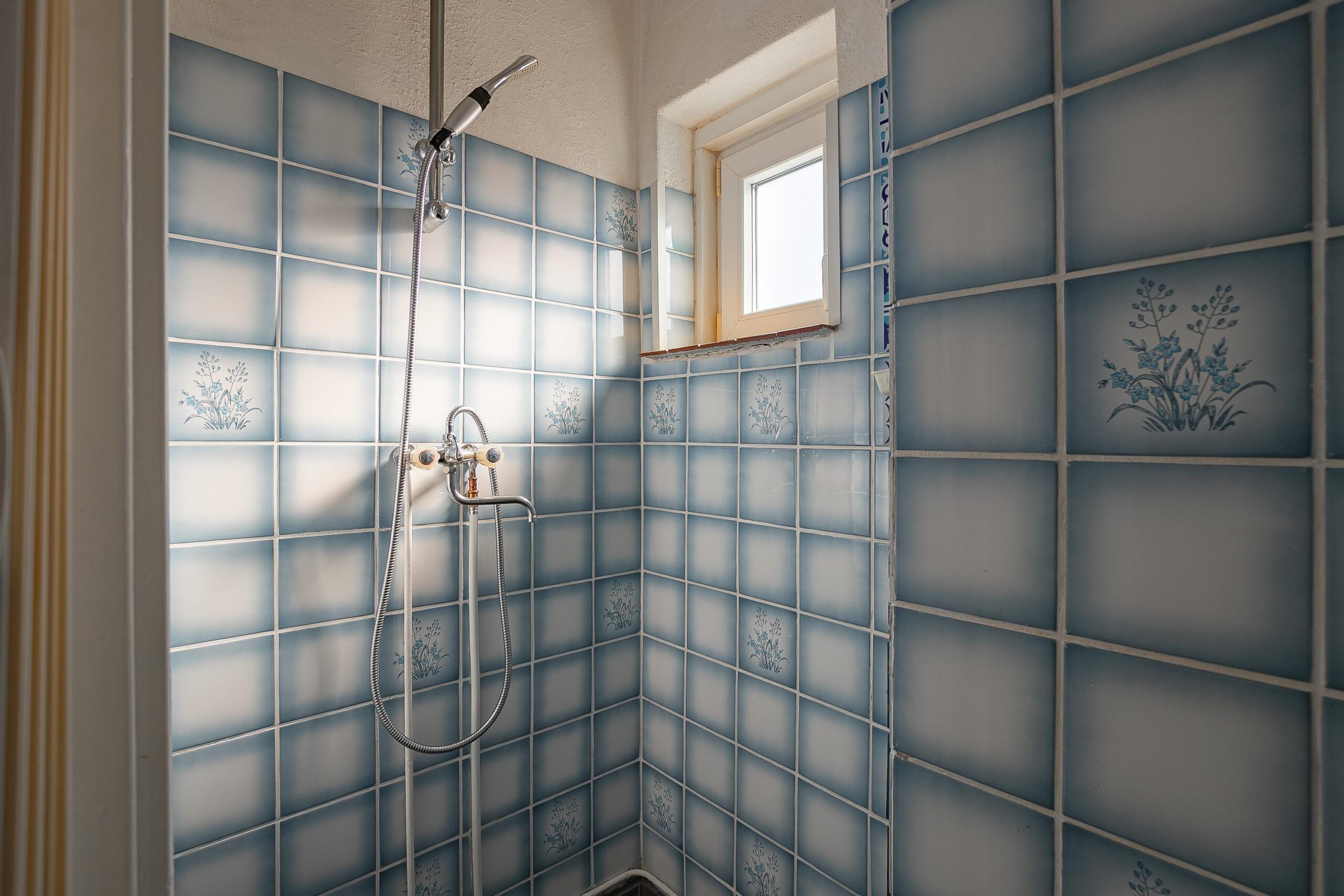 Eerste verdieping: overloop met authentiek wasbakje. Douchegelegenheid. Er zijn drie slaapkamers, waarvan twee voorzien van muurkasten en op de derde kamer bevindt zich nu de wasmachine-aansluiting en C.V.-opstelling.