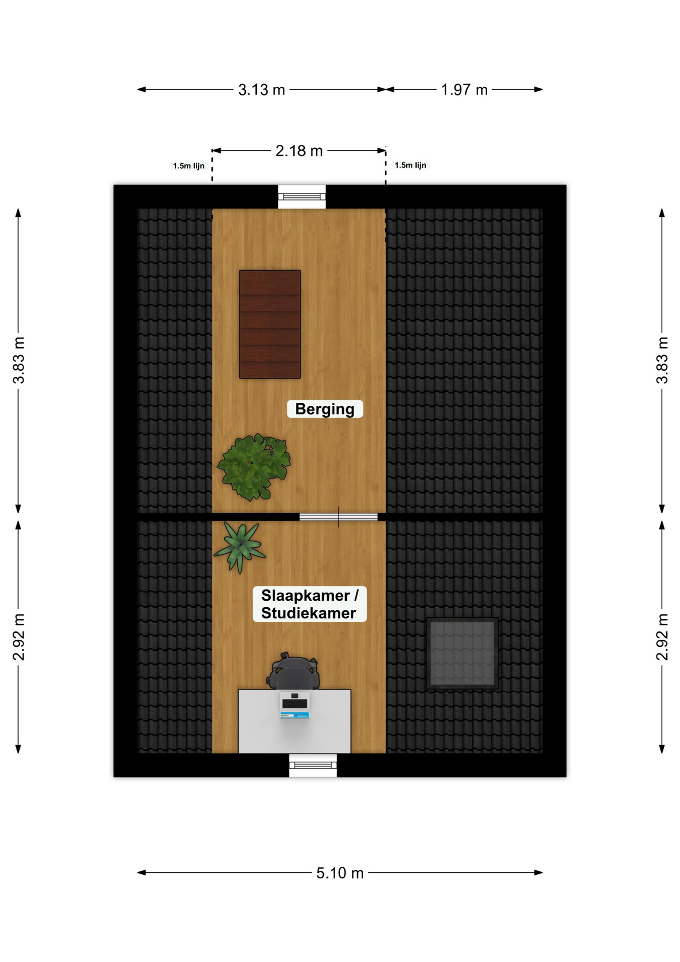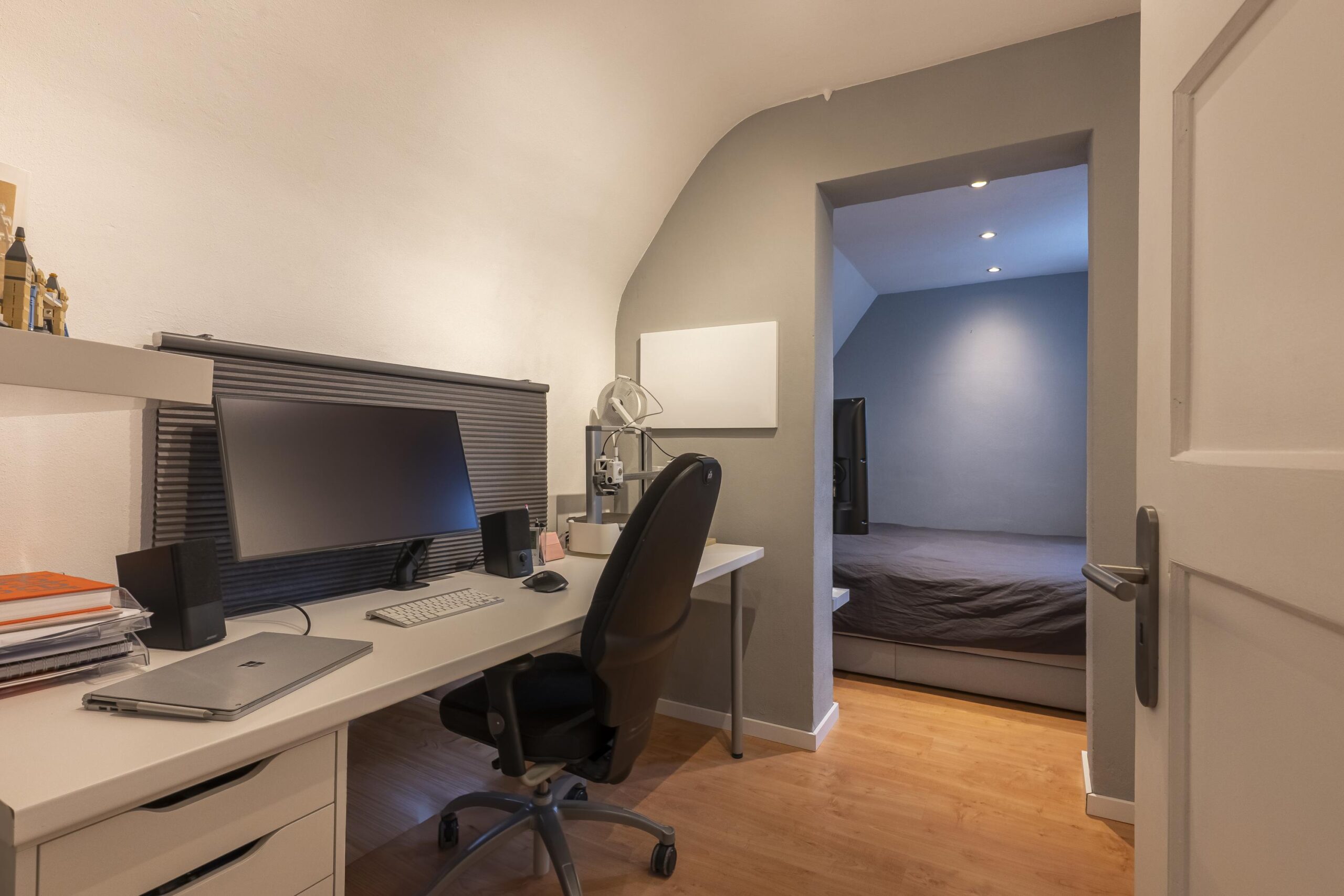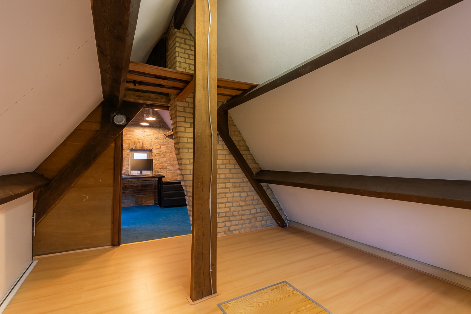 Via een vaste trap bereik je de royale zolderverdieping, waar eenvoudig een vierde slaapkamer (2.18 x 2.92) gerealiseerd kan worden. De verdieping is momenteel verdeeld in twee ruimtes: een bergruimte (3.83 x 2.18) en een kantoorruimte met Velux-dakraam.