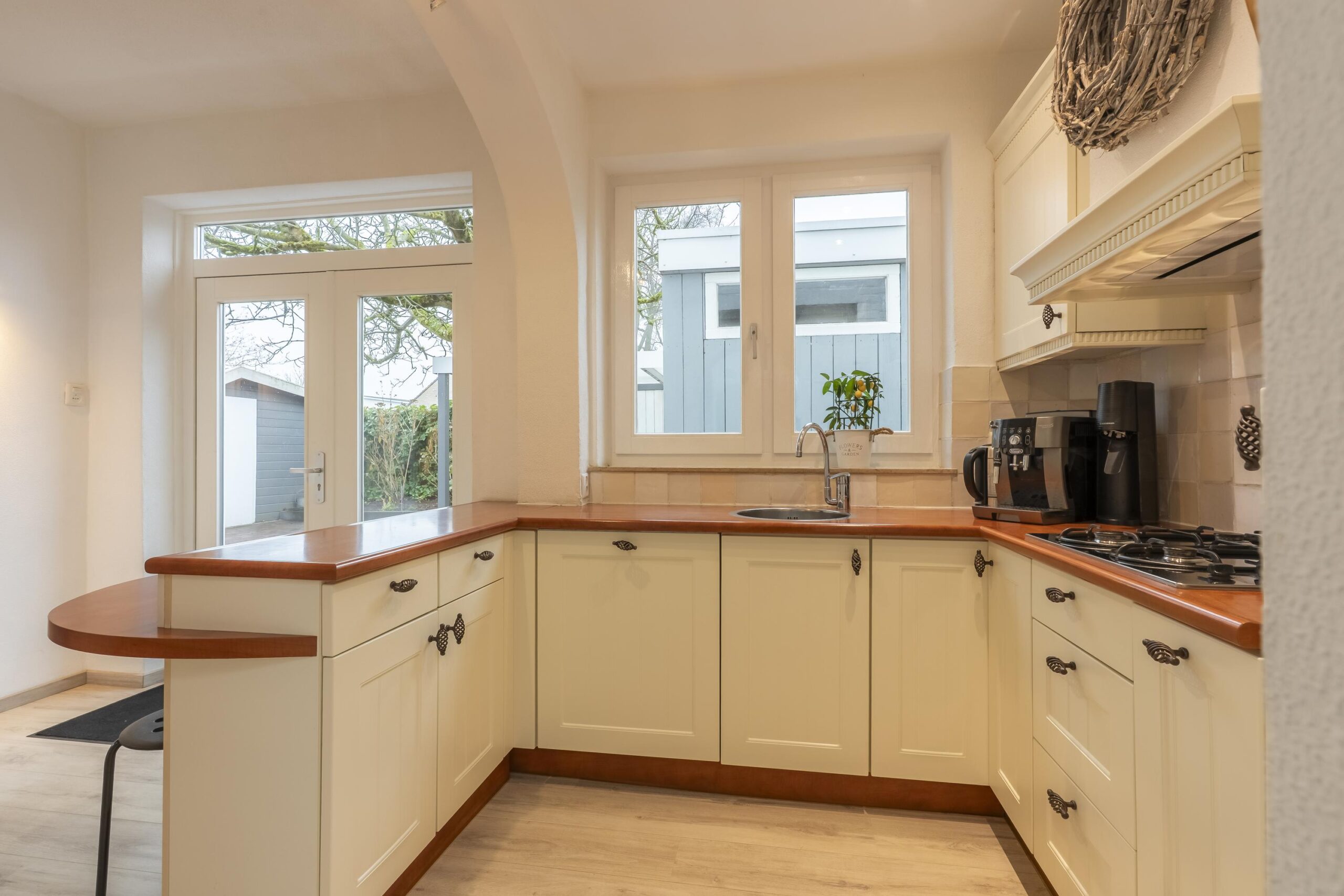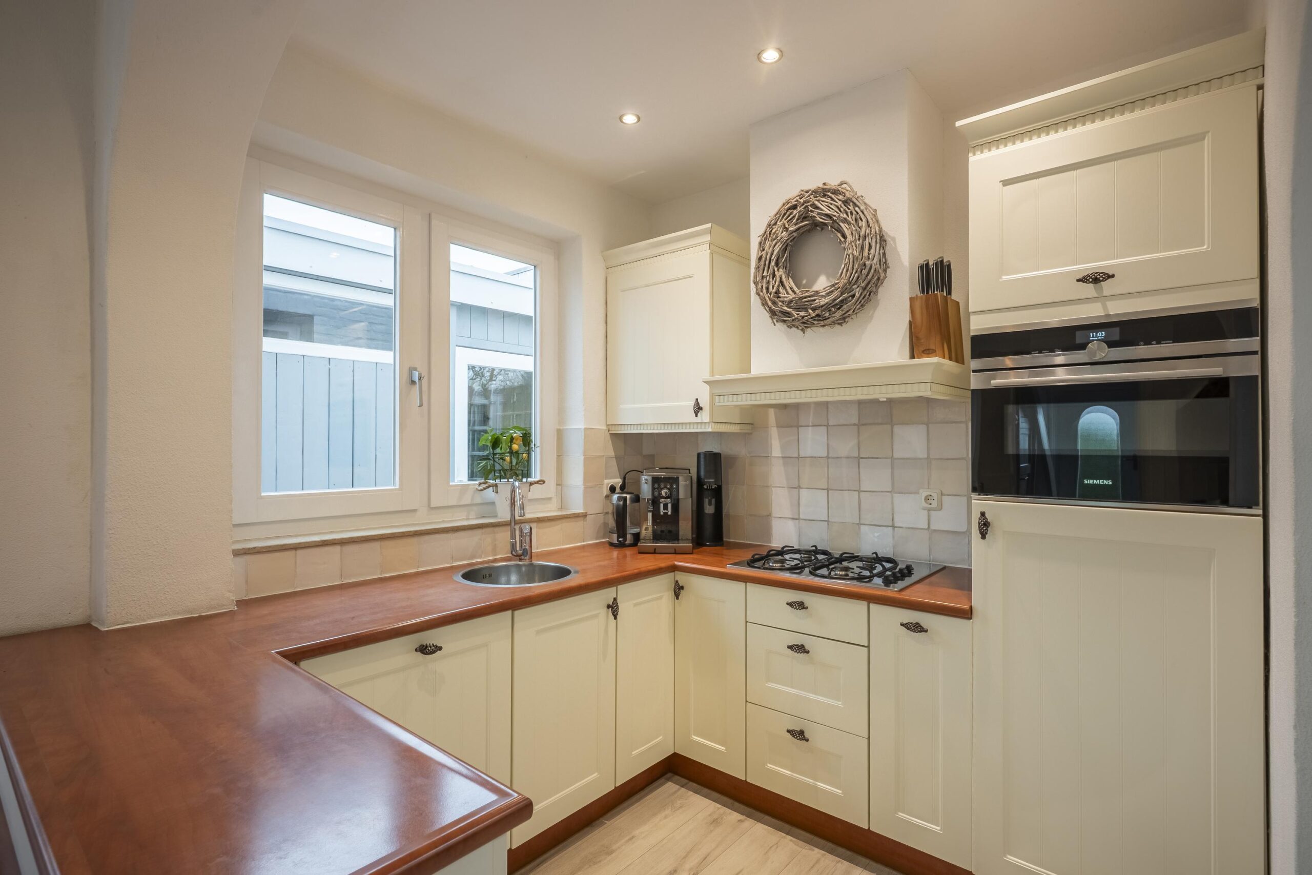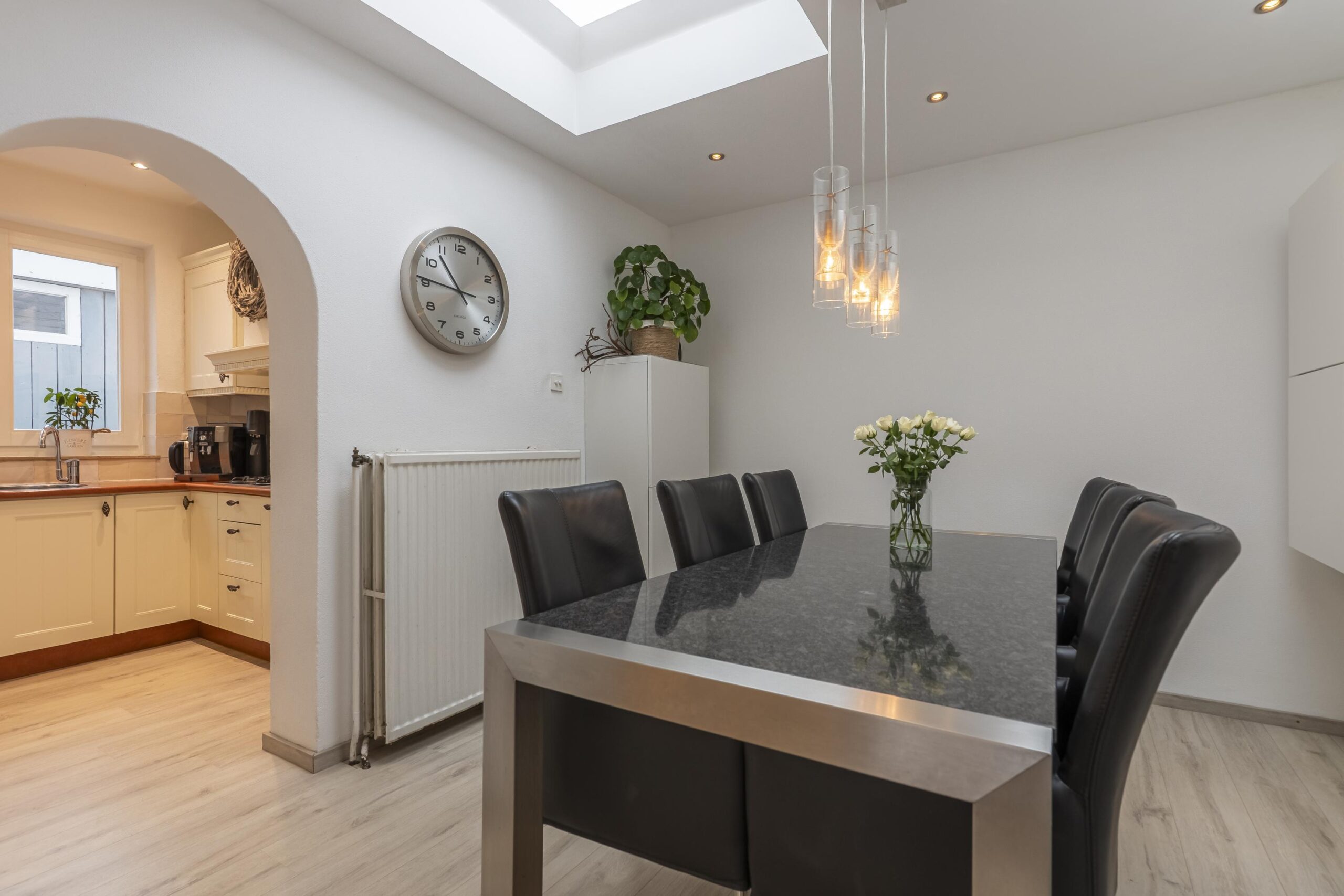 Aan de tuinzijde ligt de eetkamer met dubbele lichtkoepel, wat zorgt voor prachtige natuurlijke lichtinval. Aansluitend vind je de open keuken in U-opstelling, uitgevoerd in landelijke stijl en uitgerust met diverse inbouwapparatuur: vaatwasser, koelkast, combimagnetron, 4-pits gaskookplaat en afzuigkap.
