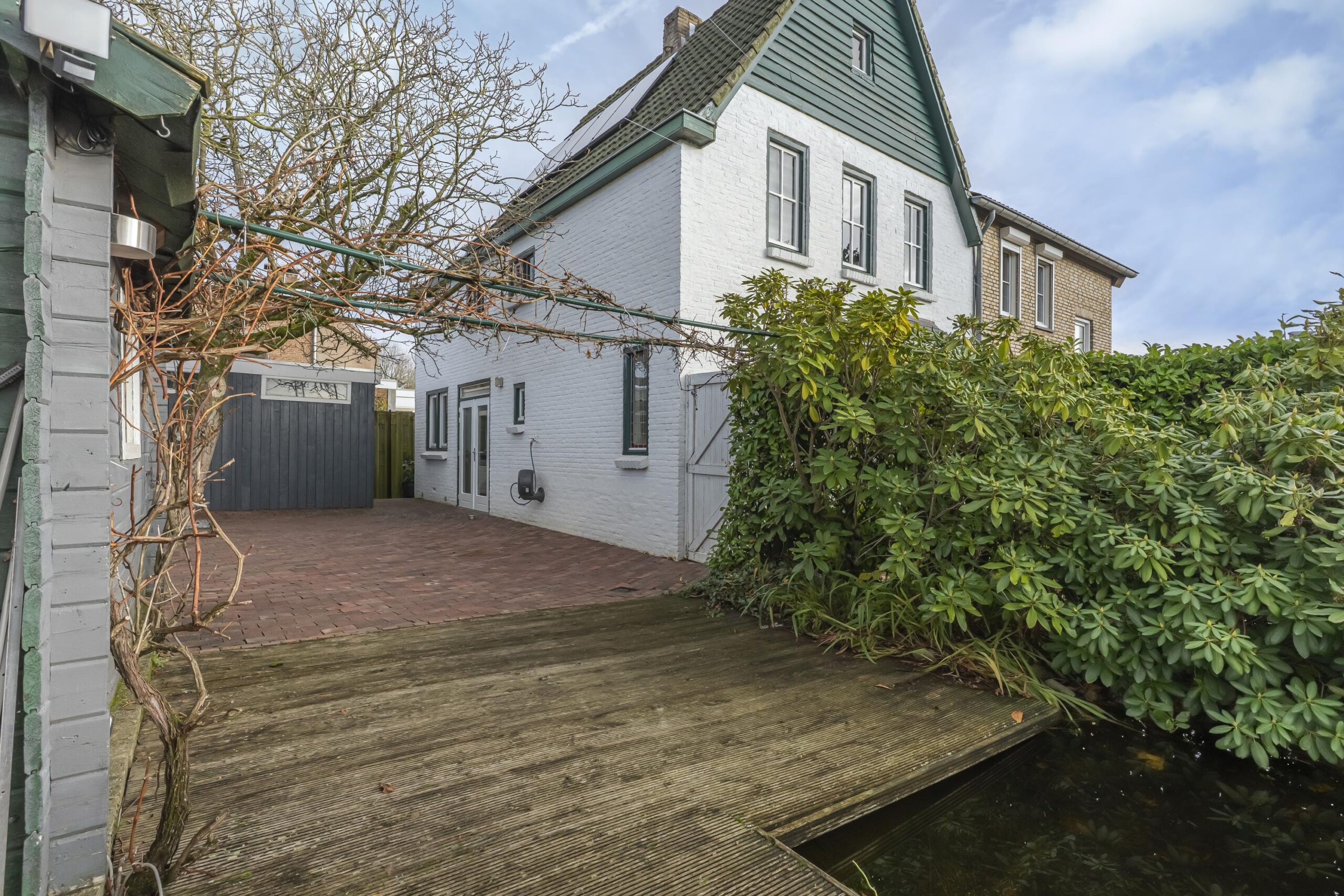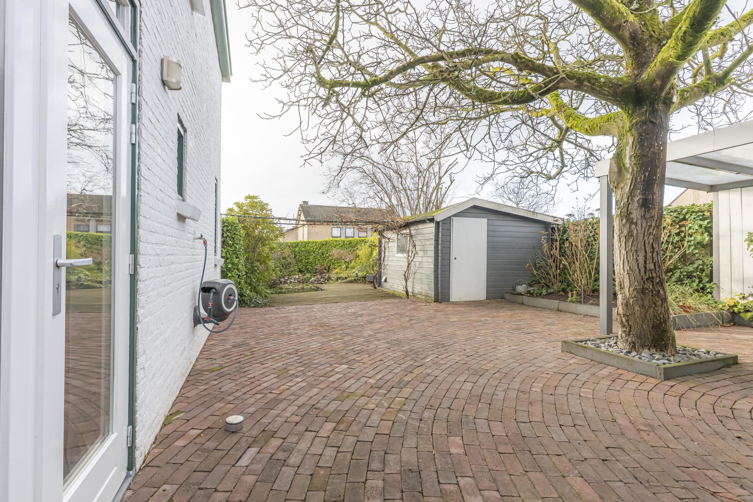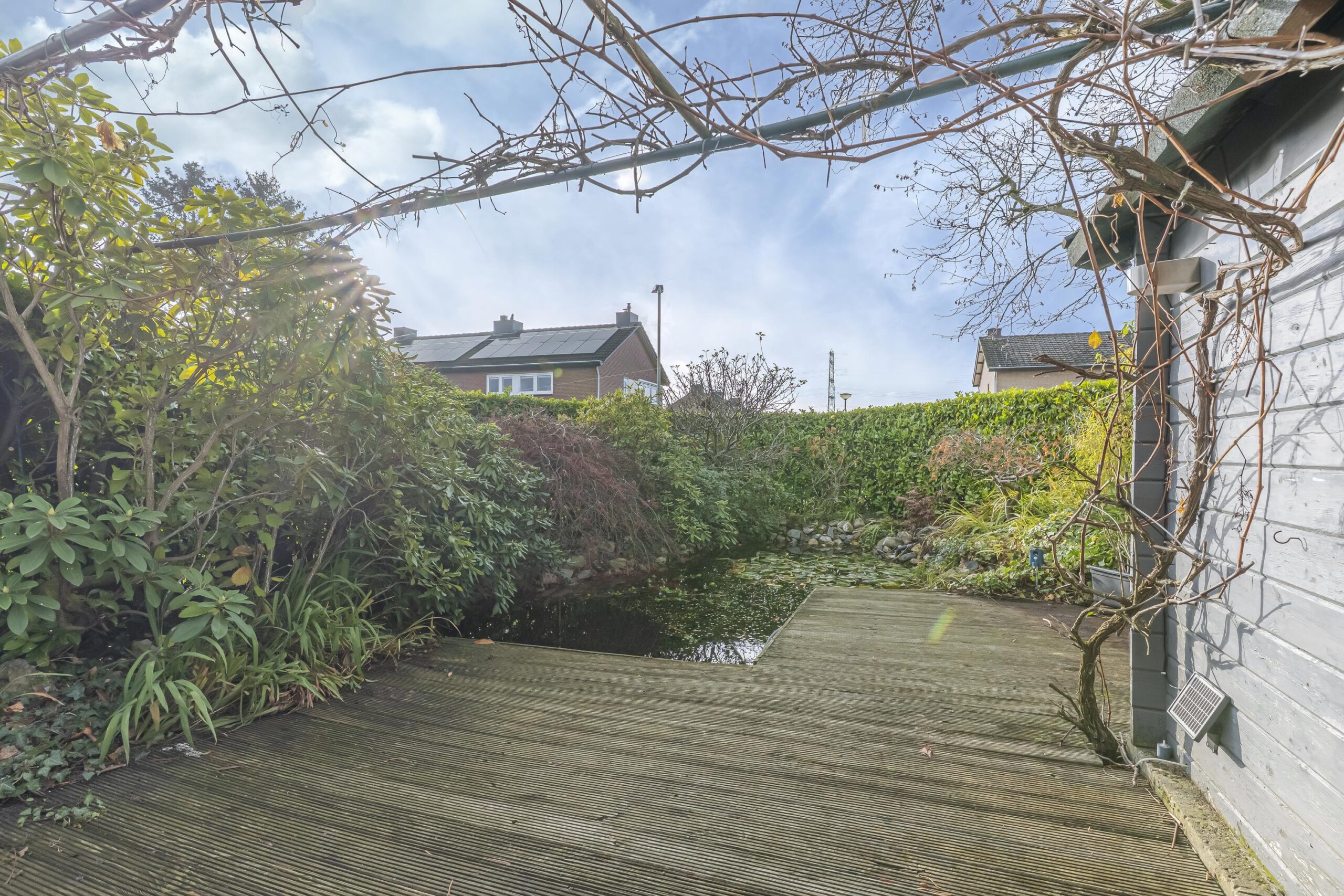 Via de dubbele openslaande deuren in de keuken, via de garage of via het poortje naast de voordeur bereik je de volledig omsloten en sfeervol aangelegde tuin. De tuin beschikt over een royaal beklinkerd terras, een prachtige walnotenboom die zorgt voor heerlijke schaduw en beschutting, een vijverpartij met filterinstallatie en houten vlonder, veel privacy en een houten tuinhuis voor extra bergruimte. De tuin is gelegen op het westen: hier geniet je volop van de middag- en avondzon.