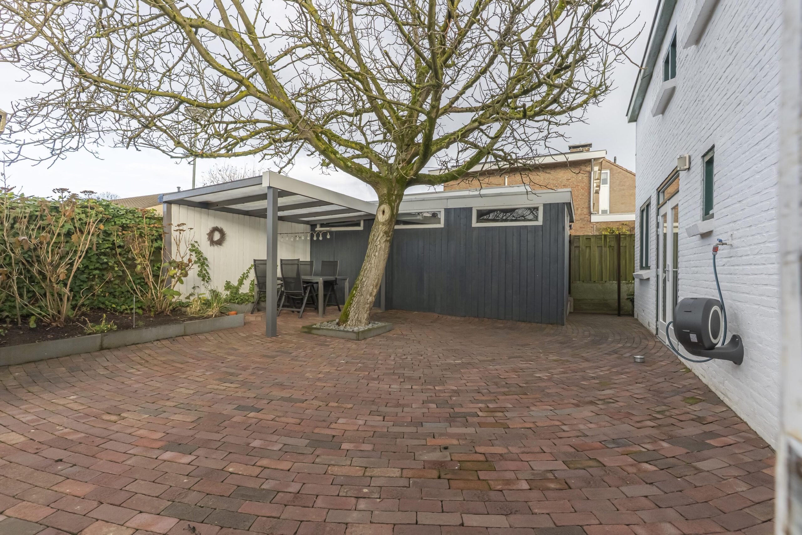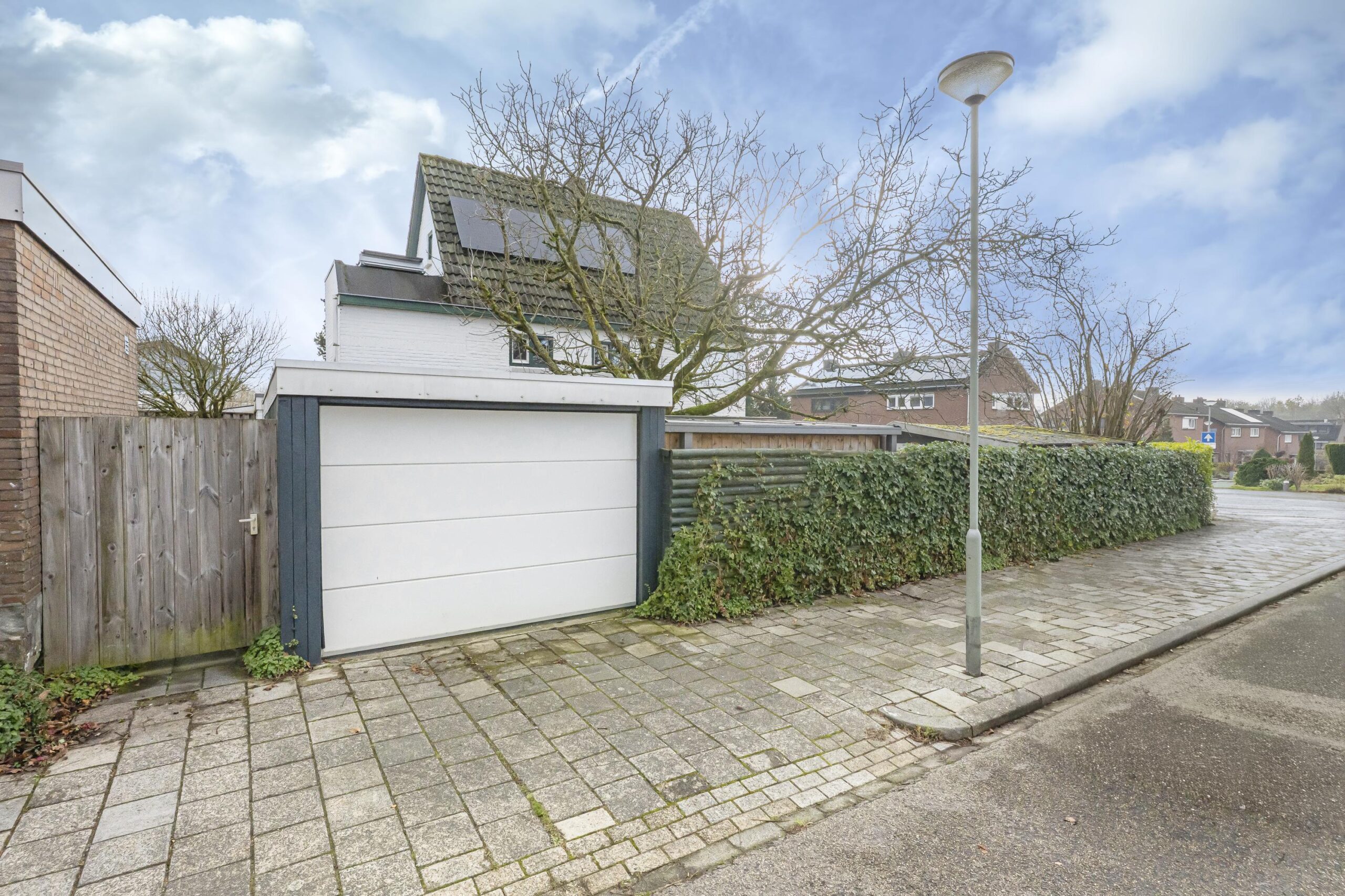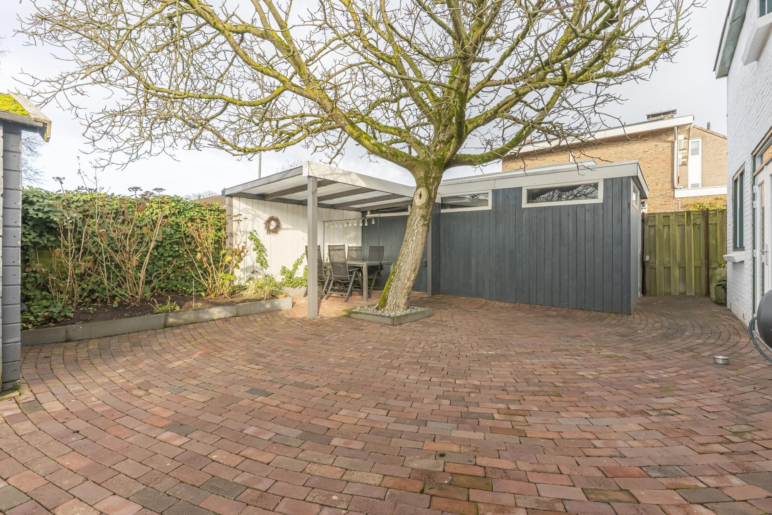 Via de dubbele openslaande deuren in de keuken, via de garage of via het poortje naast de voordeur bereik je de volledig omsloten en sfeervol aangelegde tuin. De tuin beschikt over een royaal beklinkerd terras, een prachtige walnotenboom die zorgt voor heerlijke schaduw en beschutting, een vijverpartij met filterinstallatie en houten vlonder, veel privacy en een houten tuinhuis voor extra bergruimte. De tuin is gelegen op het westen: hier geniet je volop van de middag- en avondzon.
