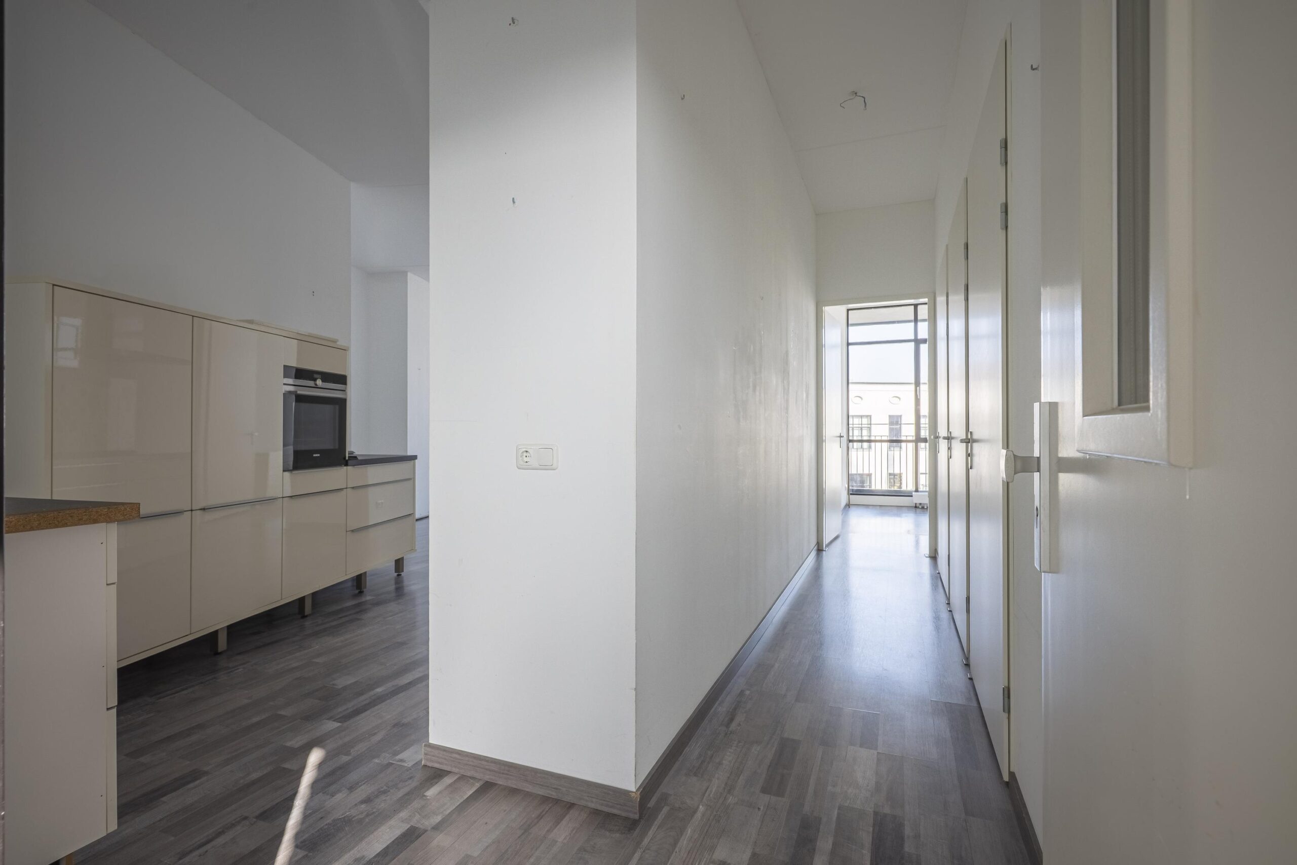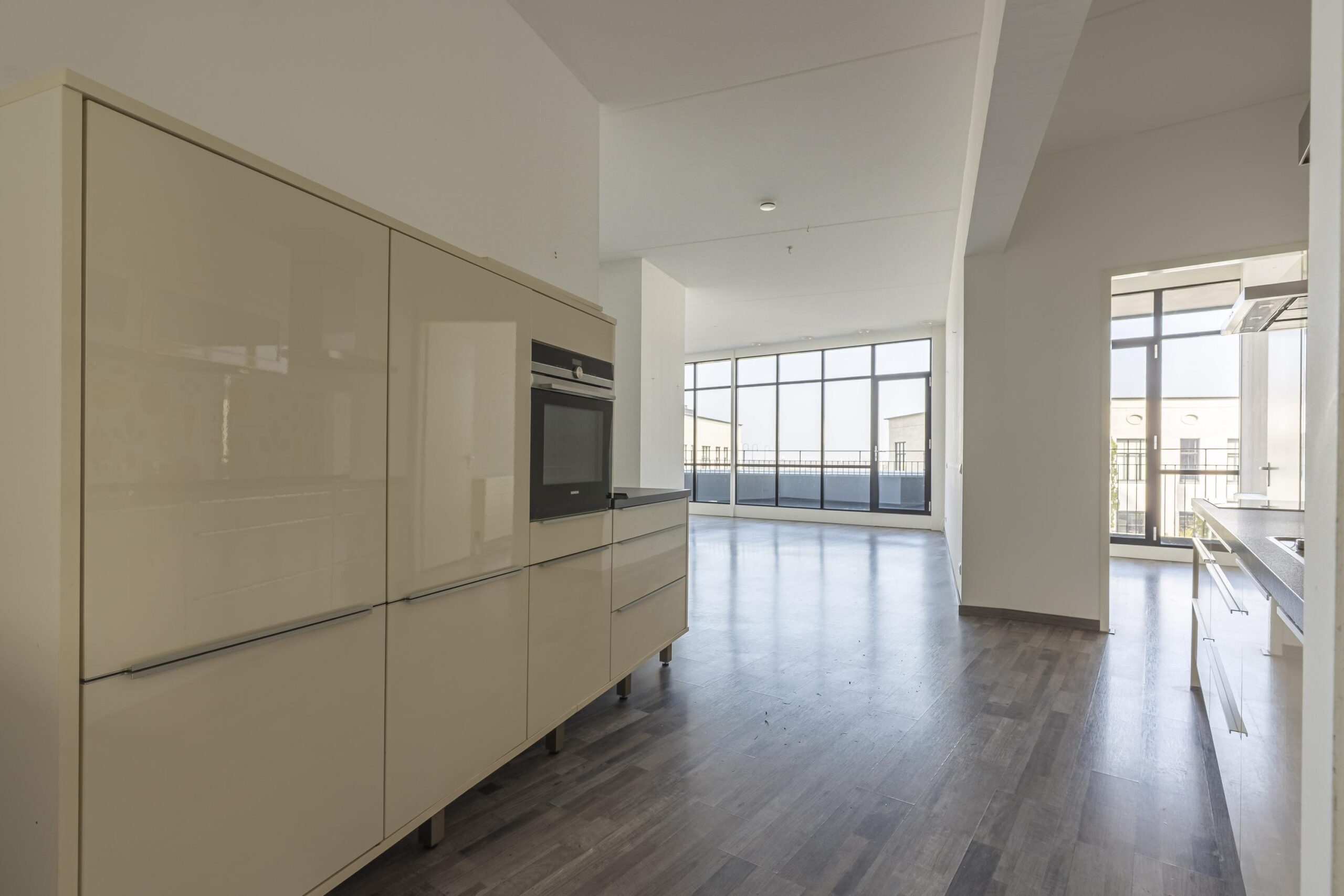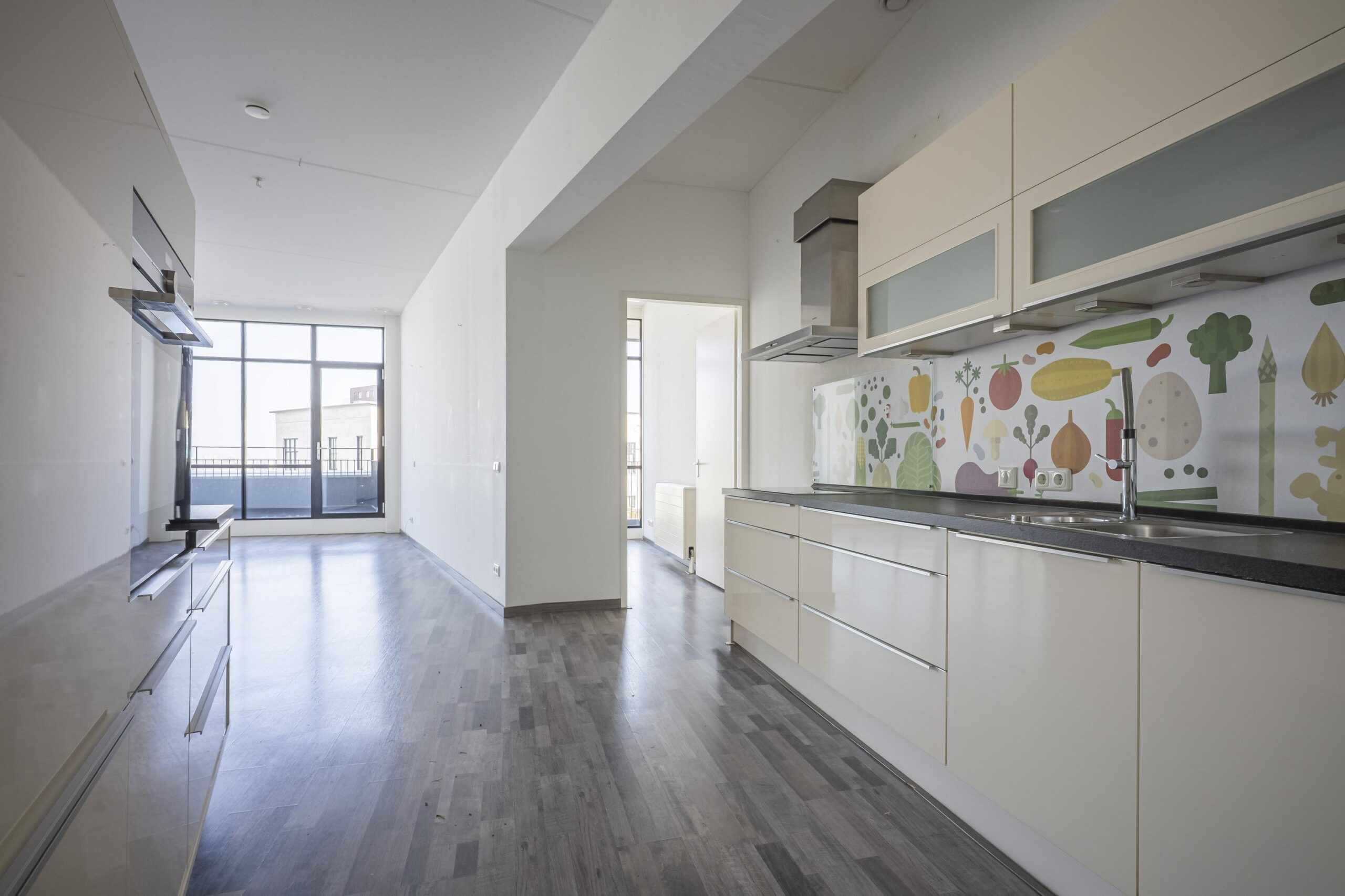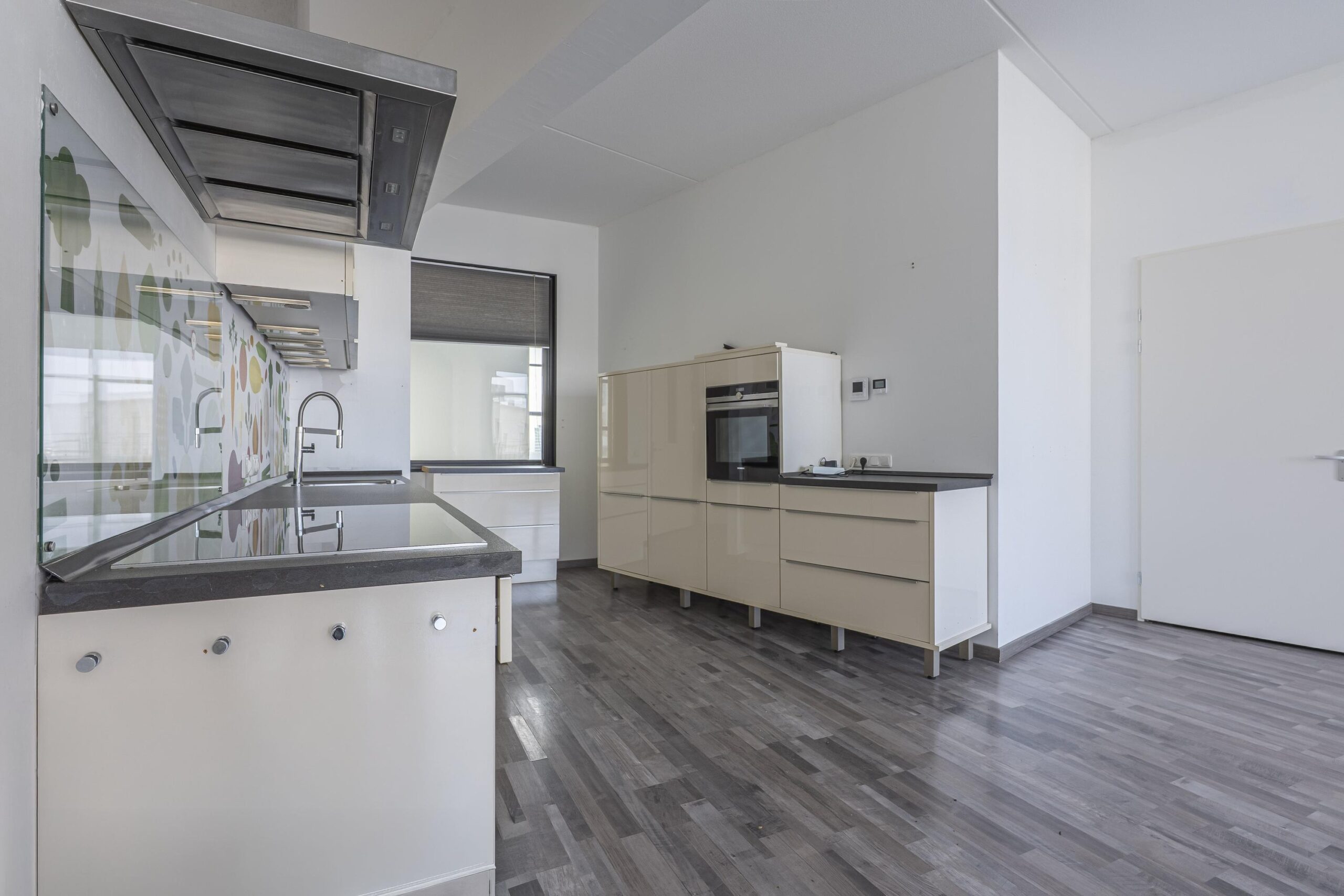 De keuken is voorzien van een keuken in twee wandopstellingen in hoogglans uitvoering en de navolgende apparatuur: oven, inductiekookplaat, afzuigkap, koelkast en vaatwasser. De woonkamer geniet veel lichtinval door de imposante raampartij die uitzicht biedt op het dakterras en het Maankwartier.