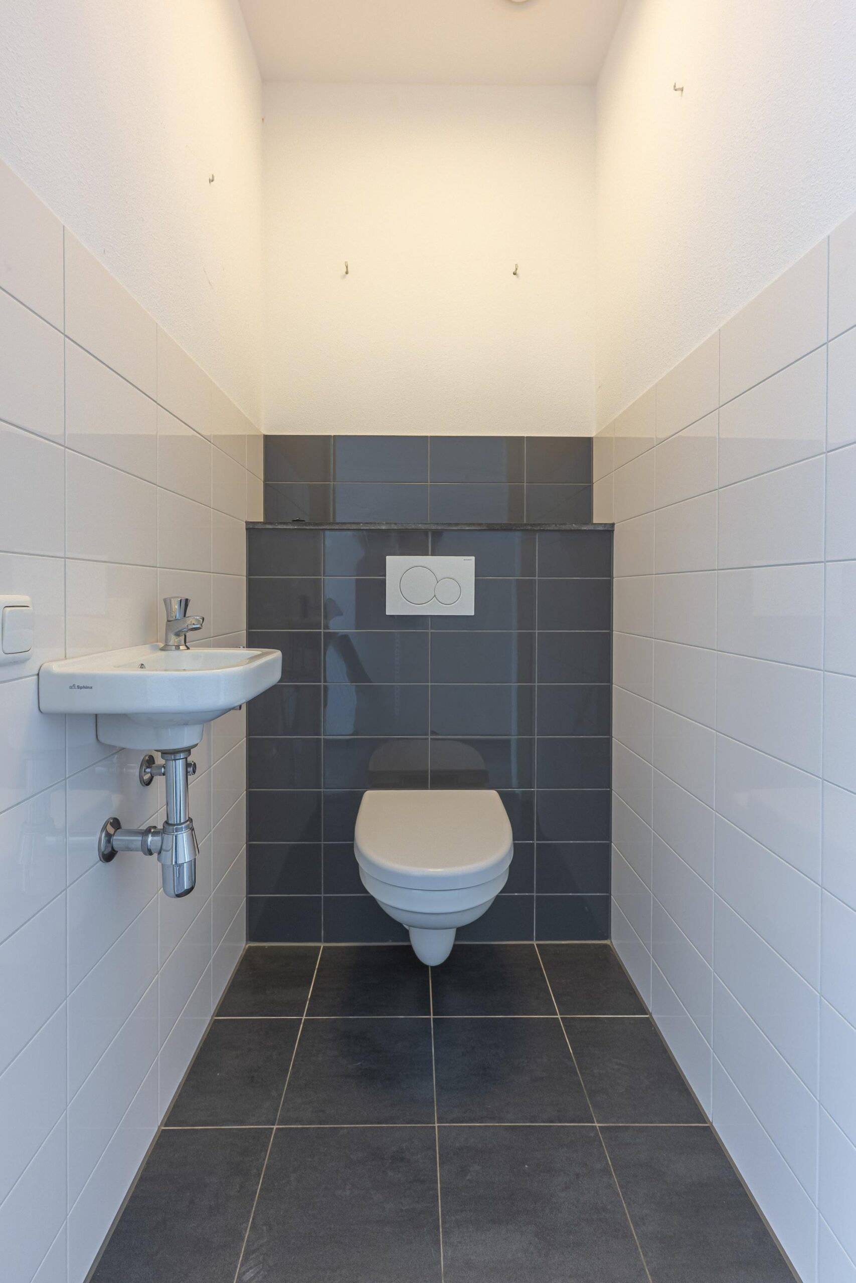 Entree/hal met meterkast en toegang tot alle vertrekken. Geheel betegelde toiletruimte met zwevend toilet en fontein.
