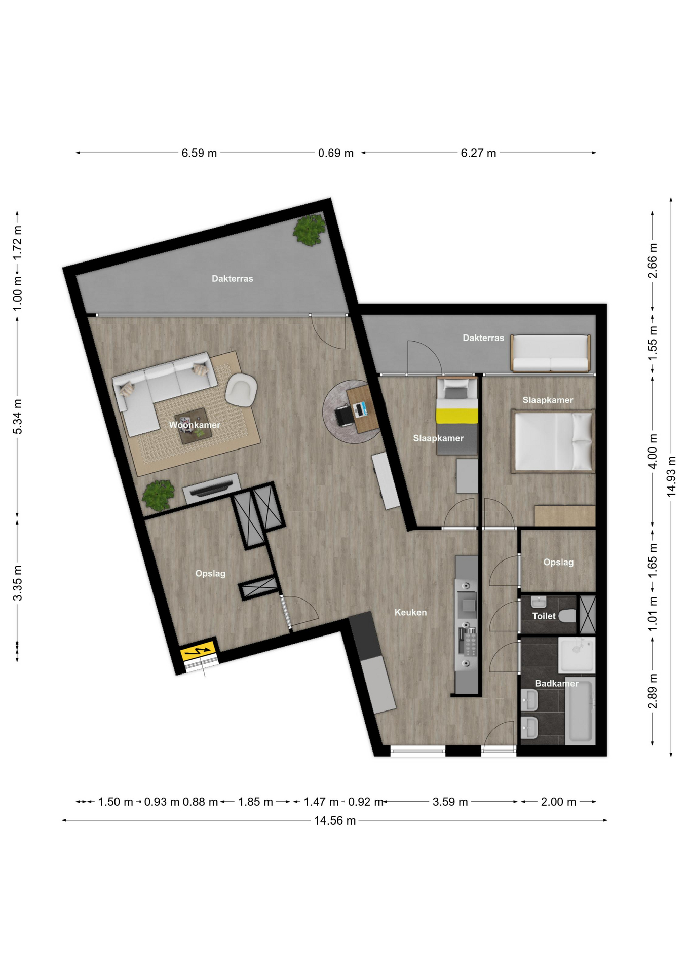 Tevens is er een inpandige berging met aansluitpunten voor wasapparatuur, Warmte-Terug-Win installatie en de warmwatervoorziening. Het appartement heeft twee slaapkamers waarvan het kleinste eveneens toegang biedt naar het dakterras. De tweede berging is gelegen tussen de toilet- en badkamerruimte, ideaal voor opslag van kasten of iets dergelijks.