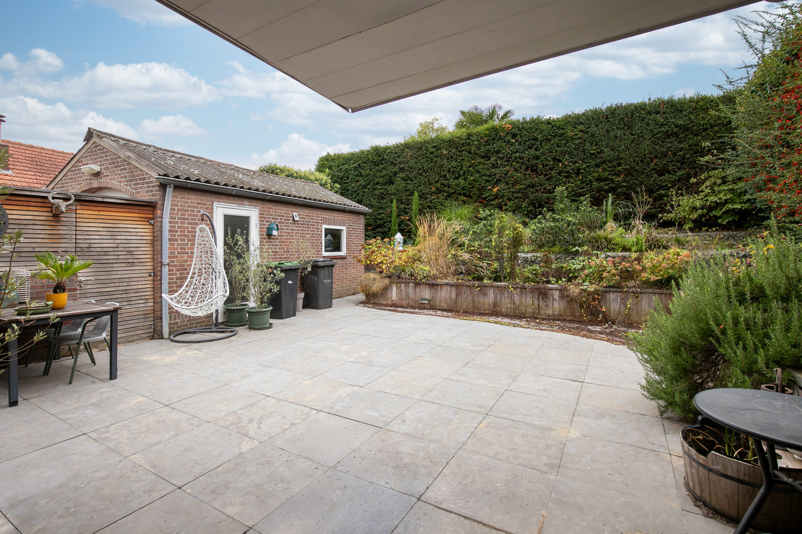 De zonnige, onderhoudsvriendelijke achtertuin is bereikbaar via de woonkamer, garage, zij-ingang en bijkeuken. De tuin is geheel omsloten en gelegen op het zuiden/zuid-oosten. Verder beschikt de tuin over een overkapping met lichtkoepel en een elektrisch bedienbaar knikarmscherm, ideaal voor zomerse dagen.