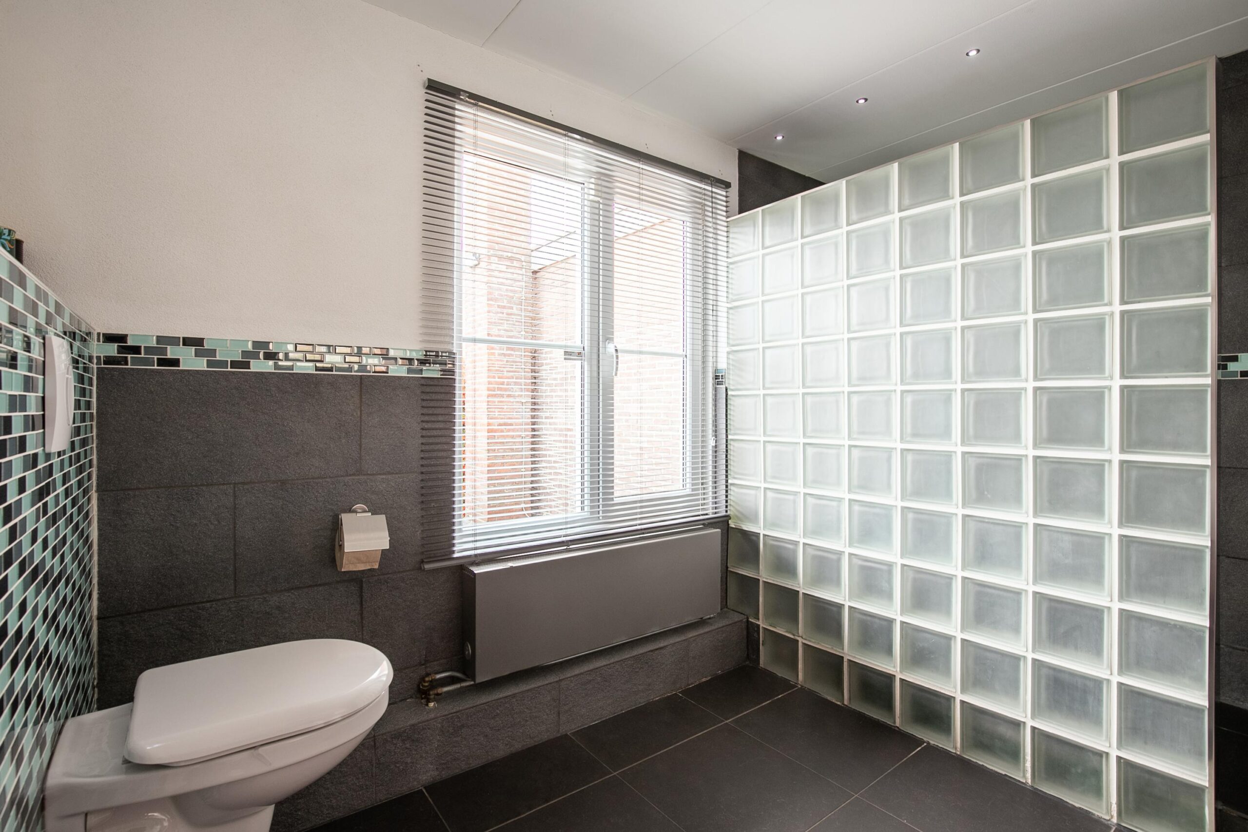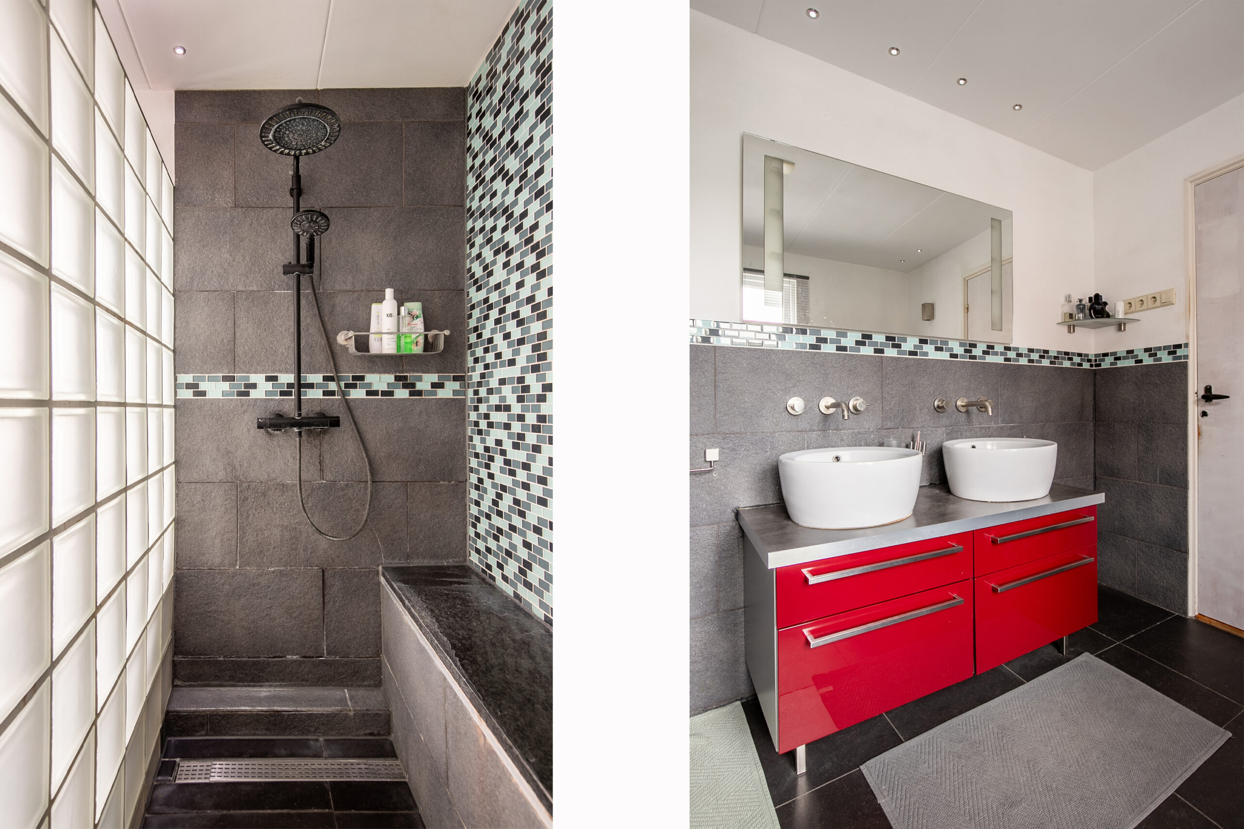 De moderne, grotendeels betegelde badkamer (ca. 9 m²) is voorzien van een inloop regendouche met glasstenen afscheidingswand, wastafelmeubel met dubbele waskommen en het tweede vrijhangend toilet.